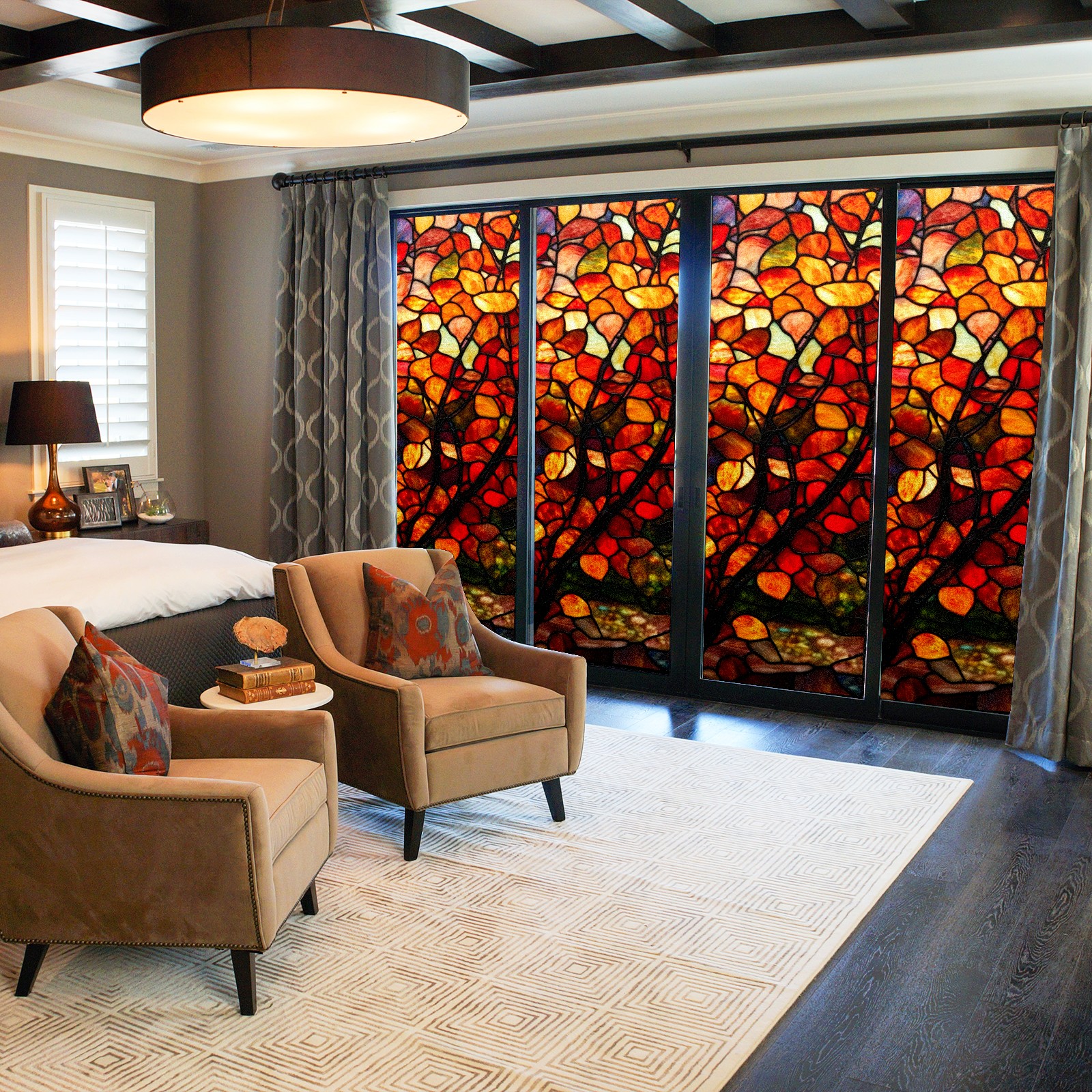 Single sided frosted full screen printed glass sticker soft pink green stripe seamless embroidery pattern privacy decoration Autumn Foliage