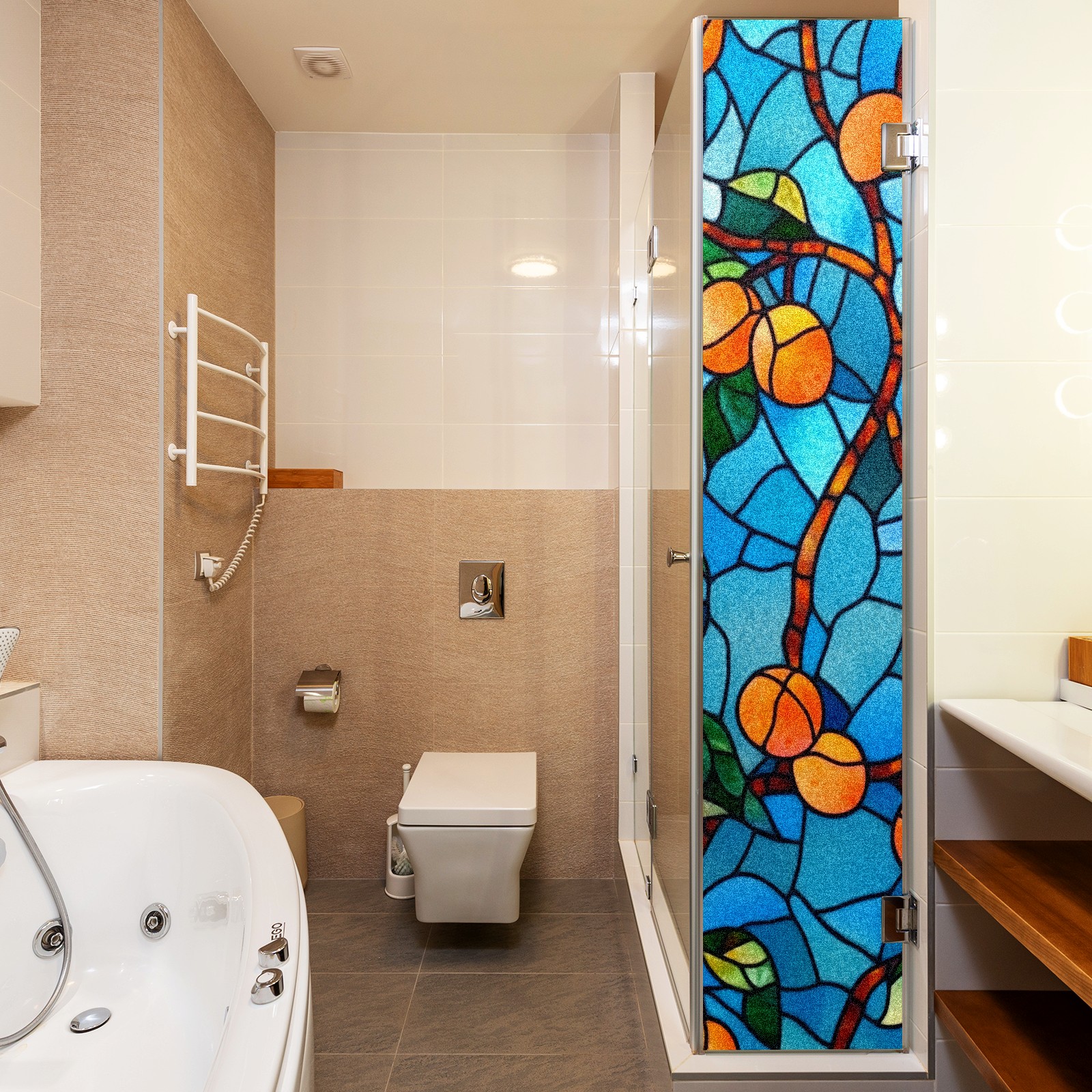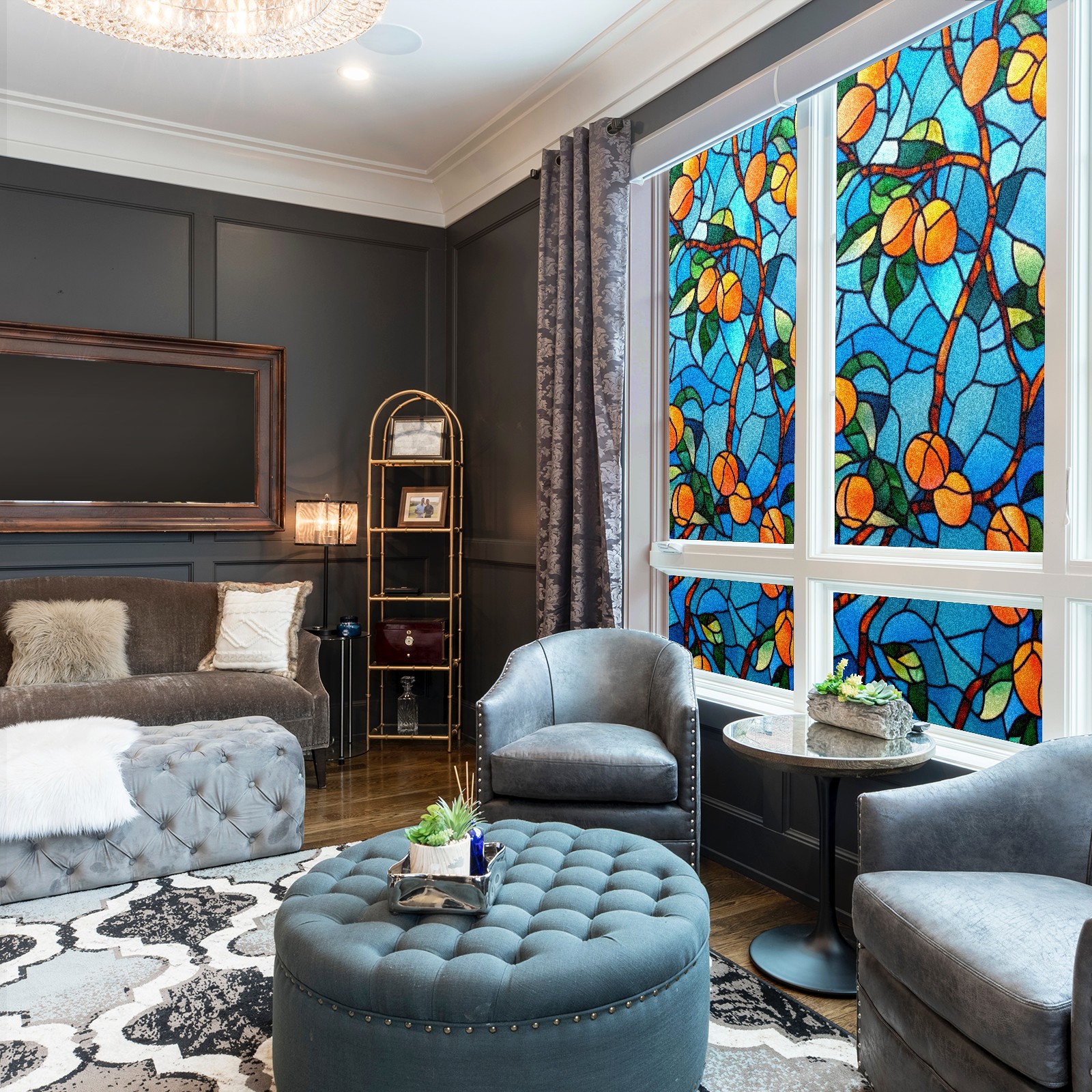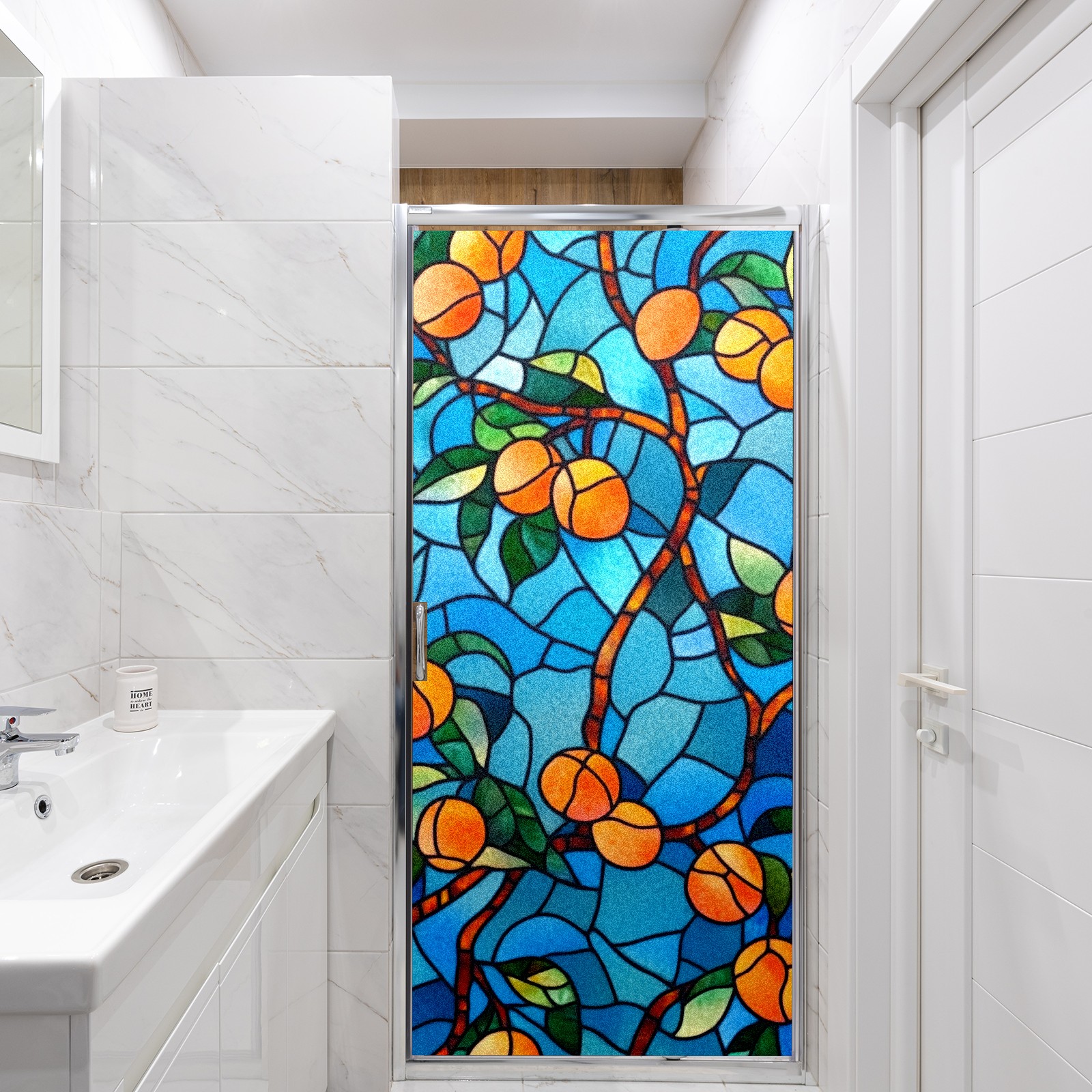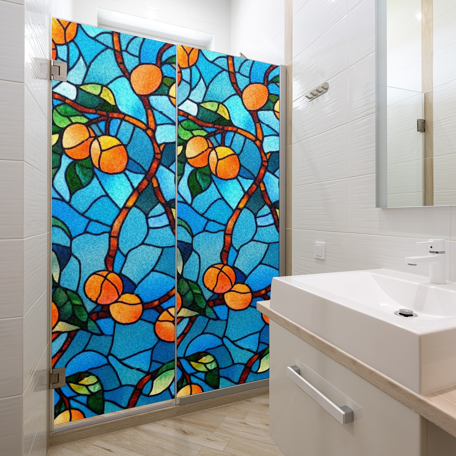 Single sided frosted full screen printed glass sticker soft pink green stripe seamless embroidery pattern privacy decoration Orange Tree (2)