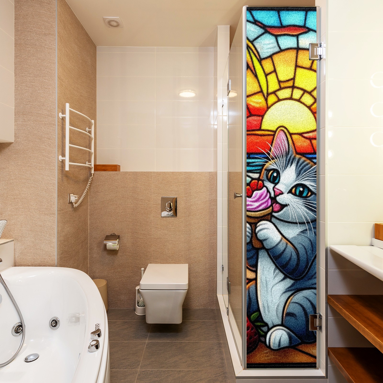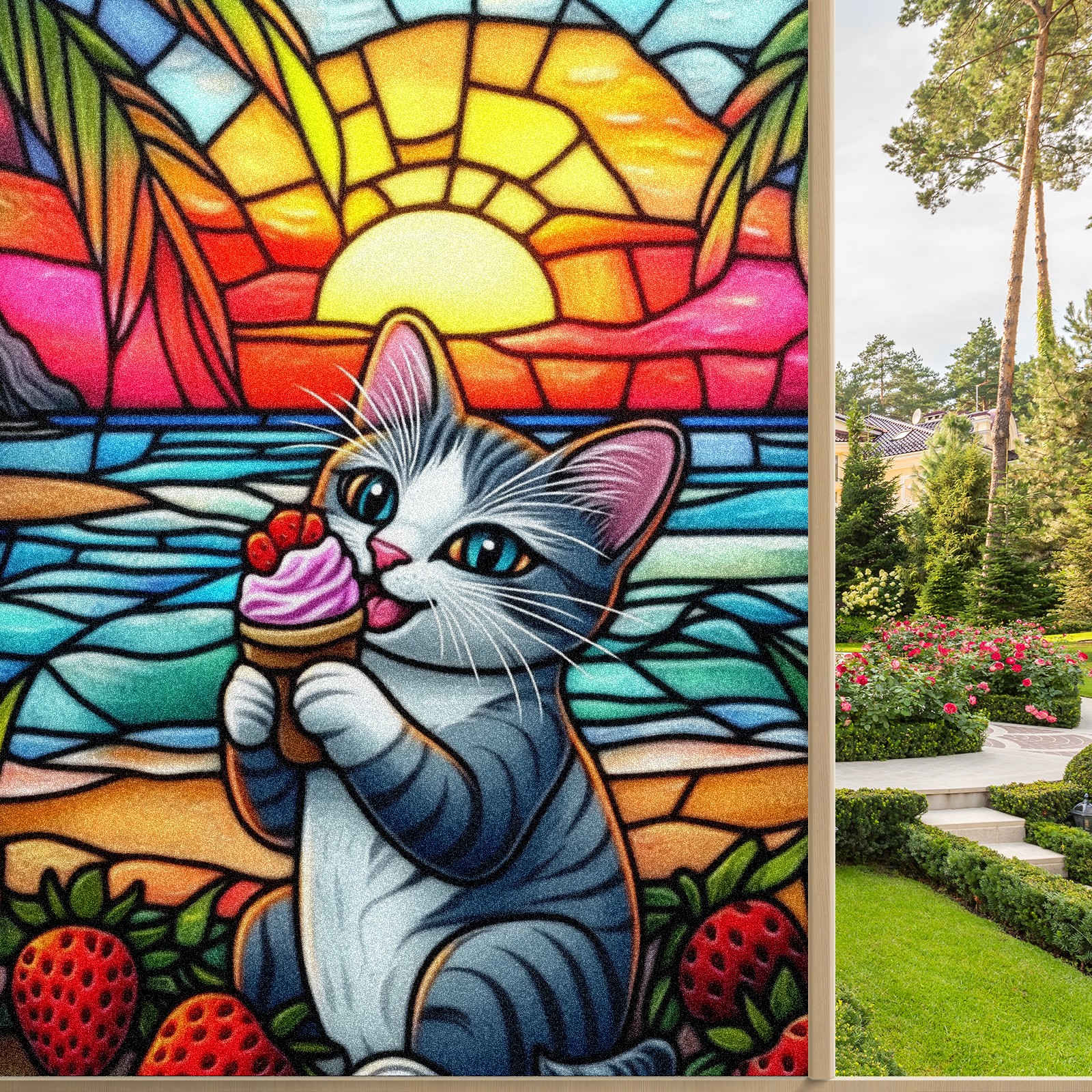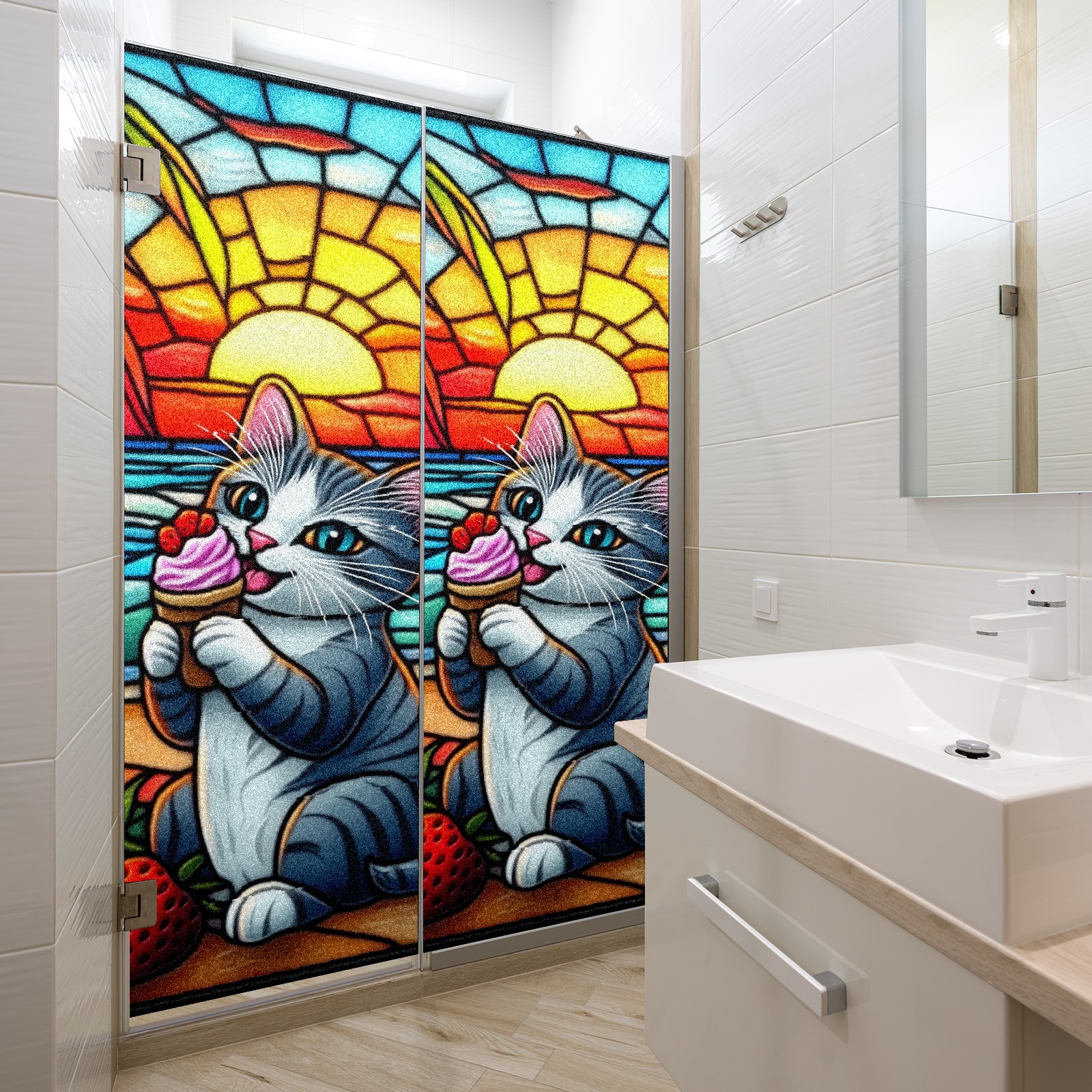 Single sided frosted full screen printed glass sticker soft pink green stripe seamless embroidery pattern privacy decoration Cat Eating Ice Cream