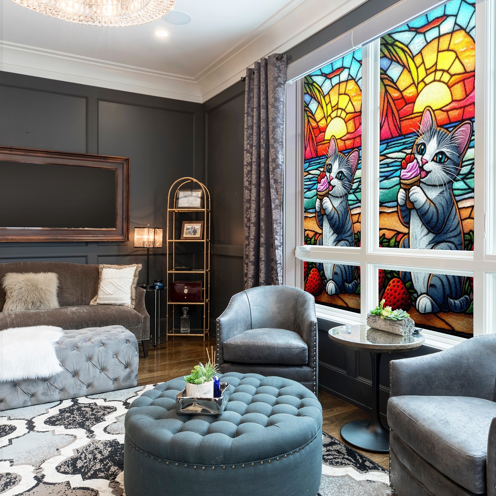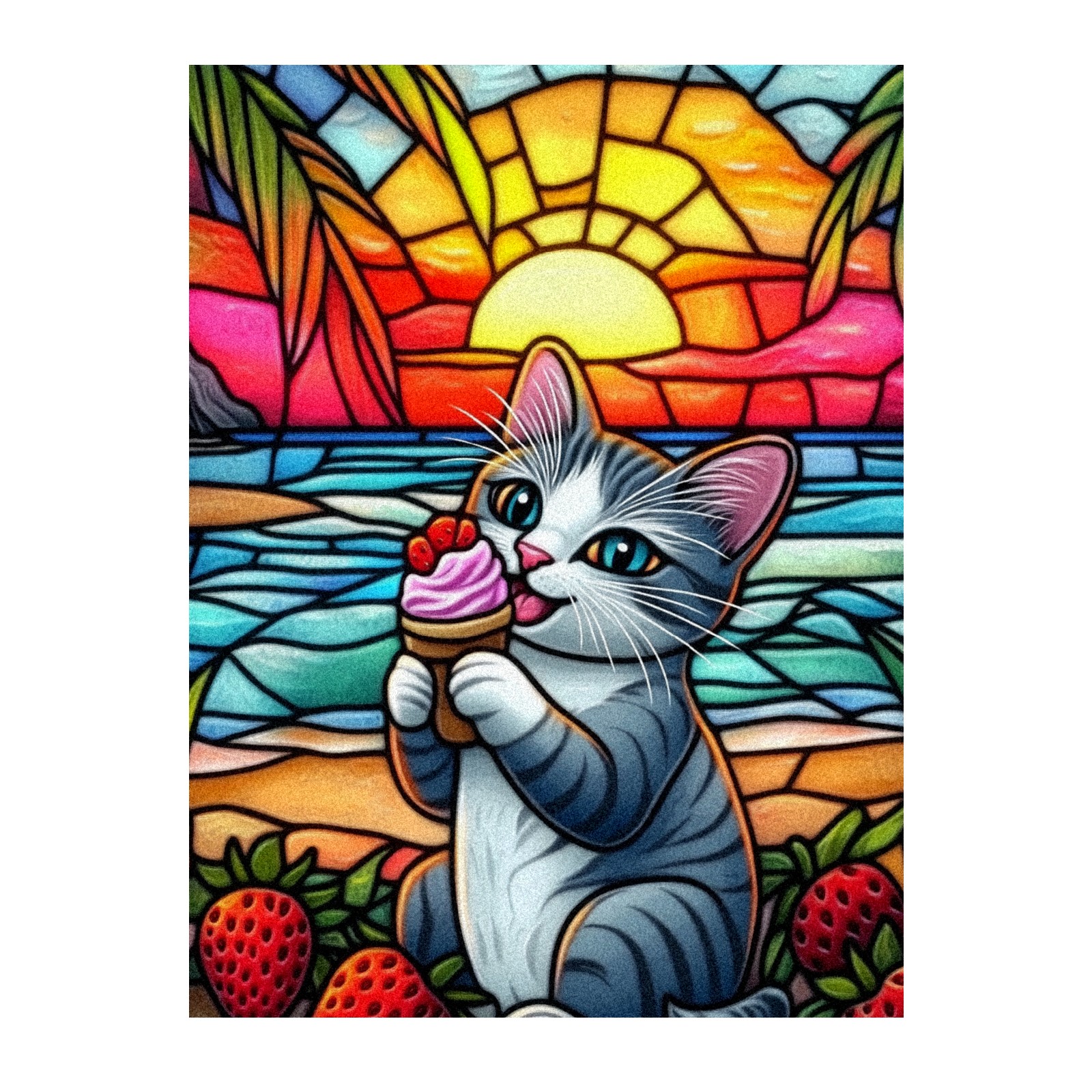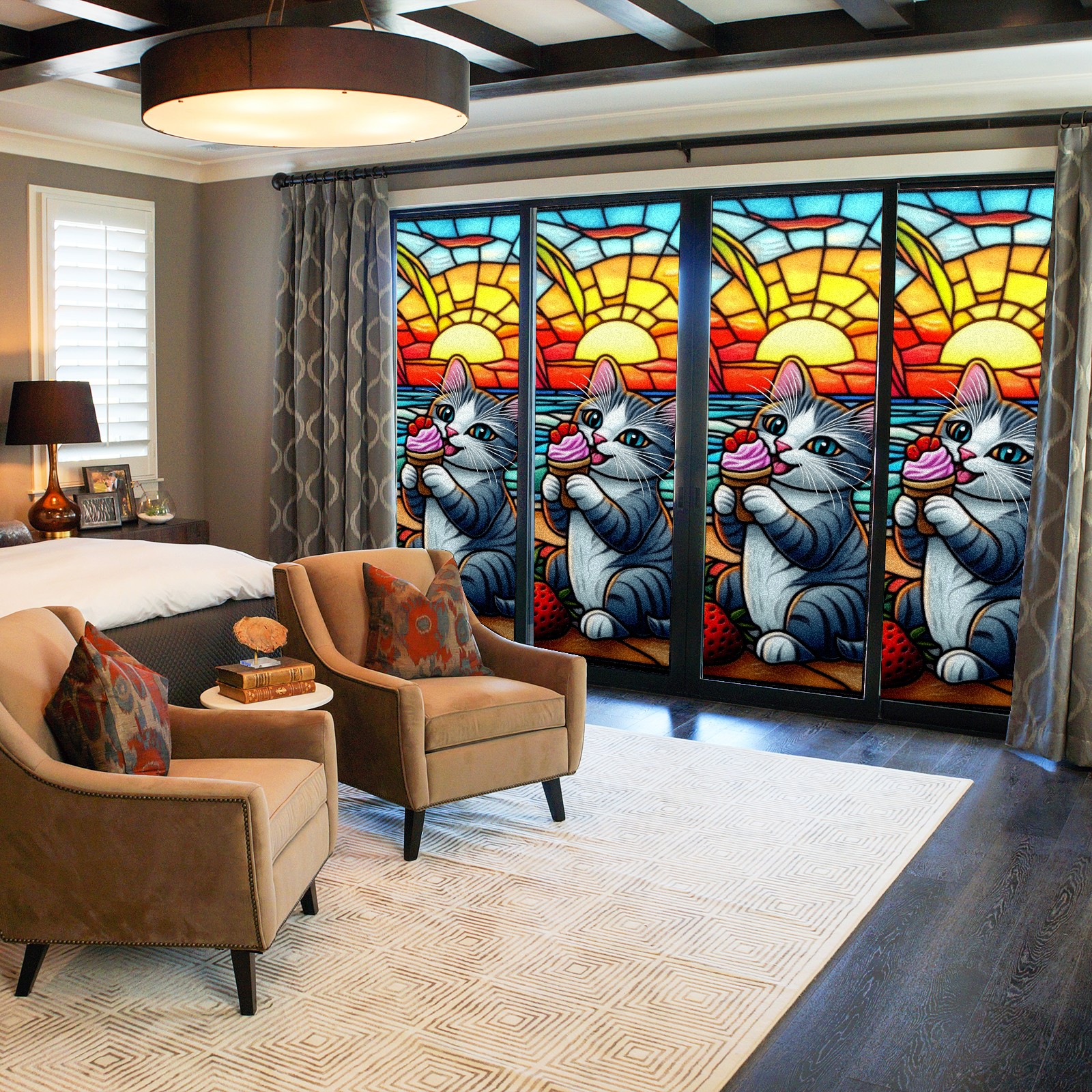 Single sided frosted full screen printed glass sticker soft pink green stripe seamless embroidery pattern privacy decoration Cat Eating Ice Cream