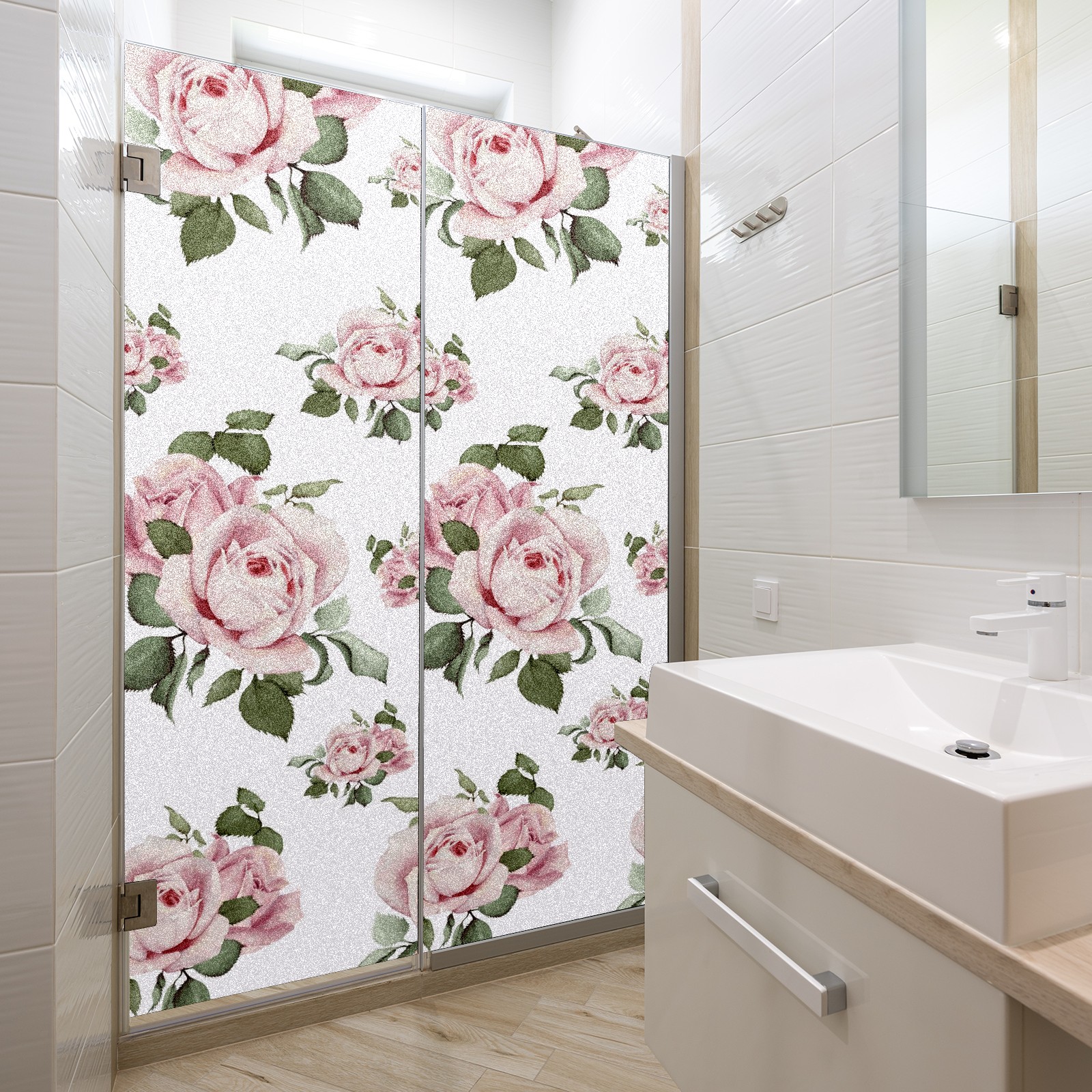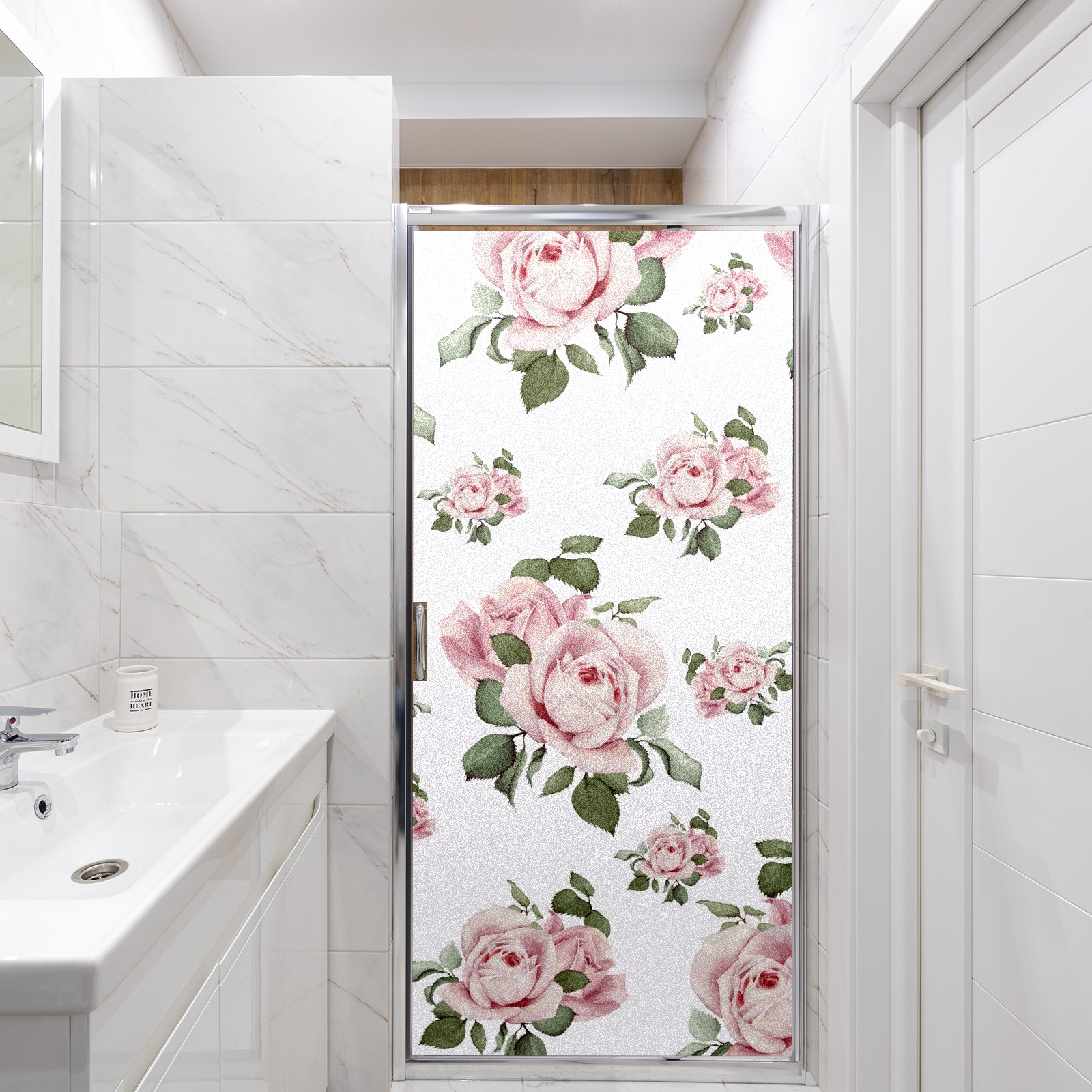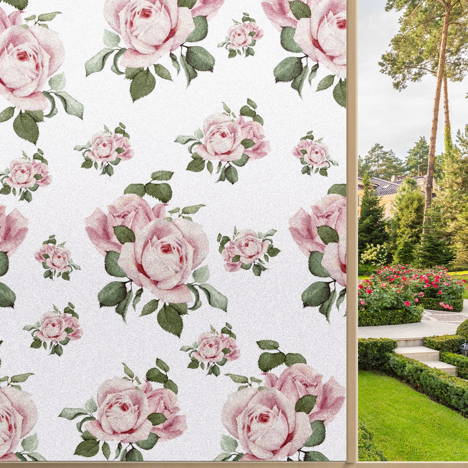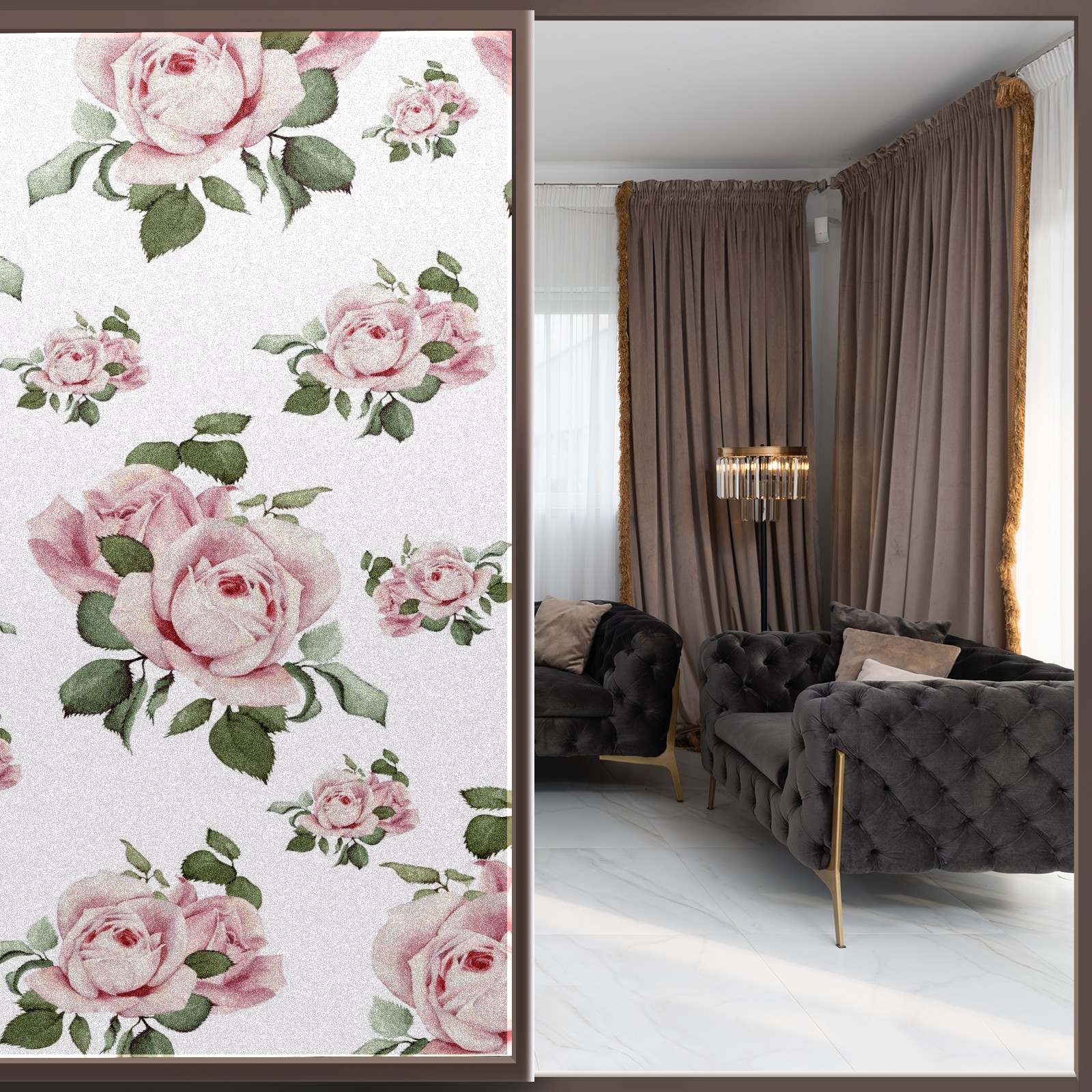 Single sided frosted full screen printed glass sticker soft pink green stripe seamless embroidery pattern privacy decoration Rose1