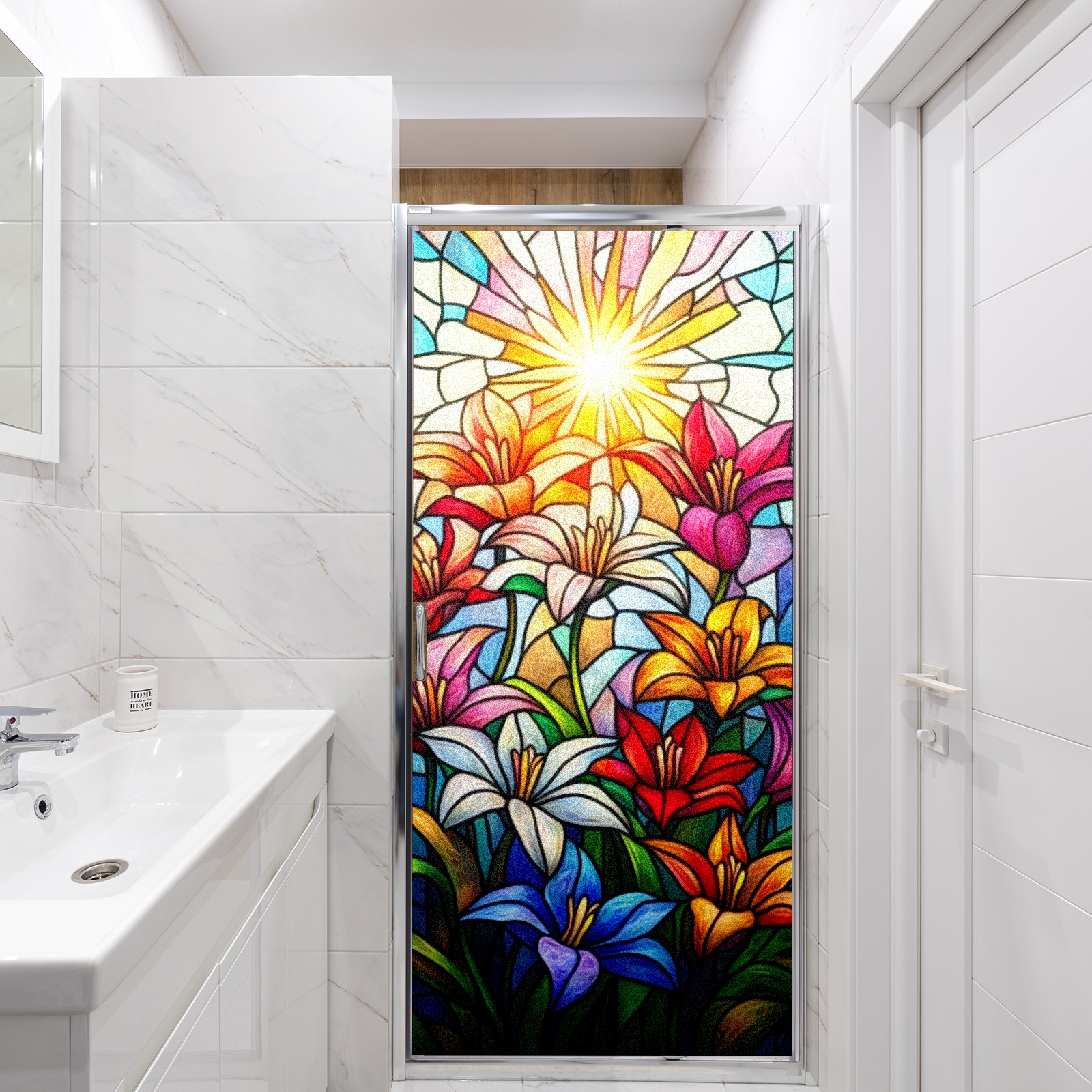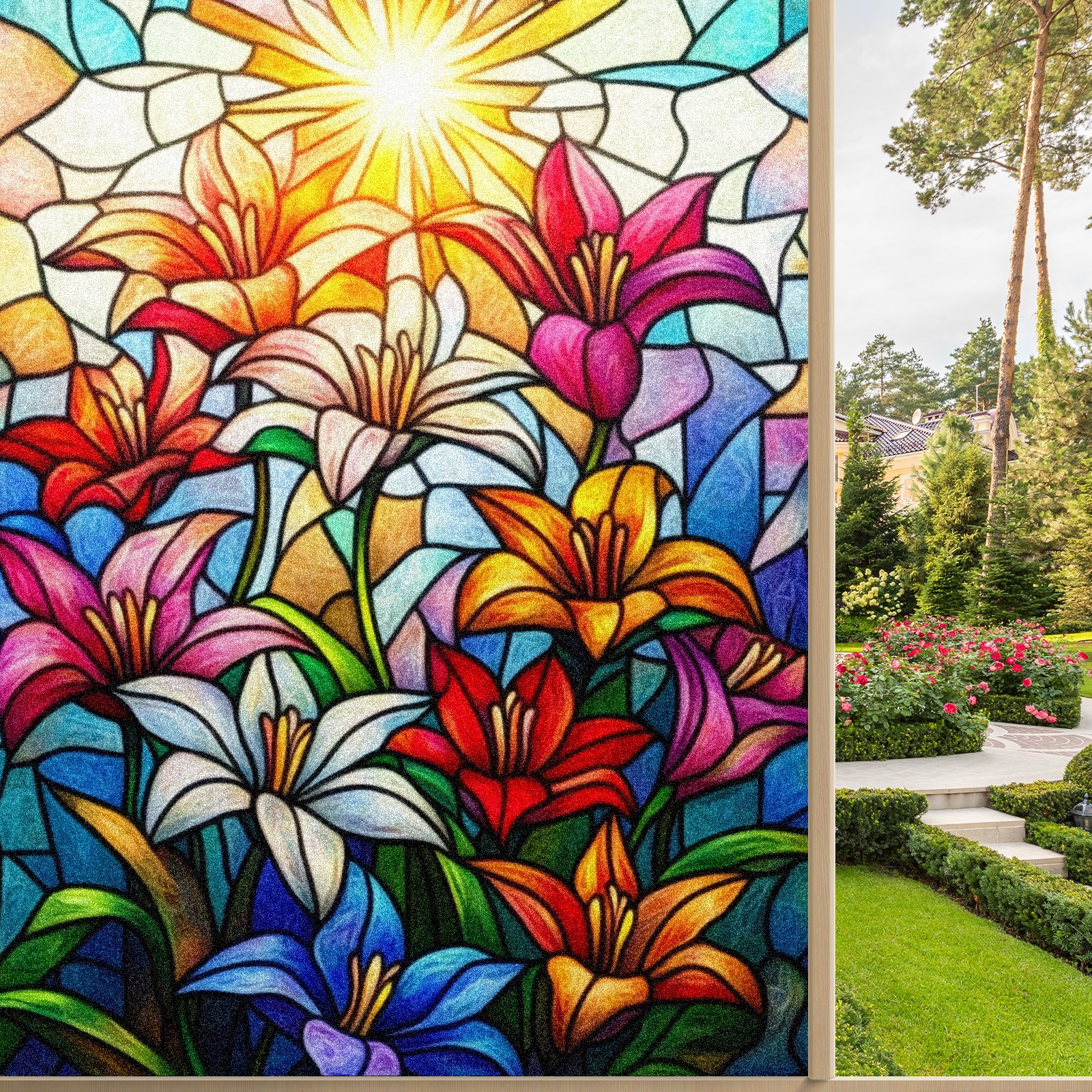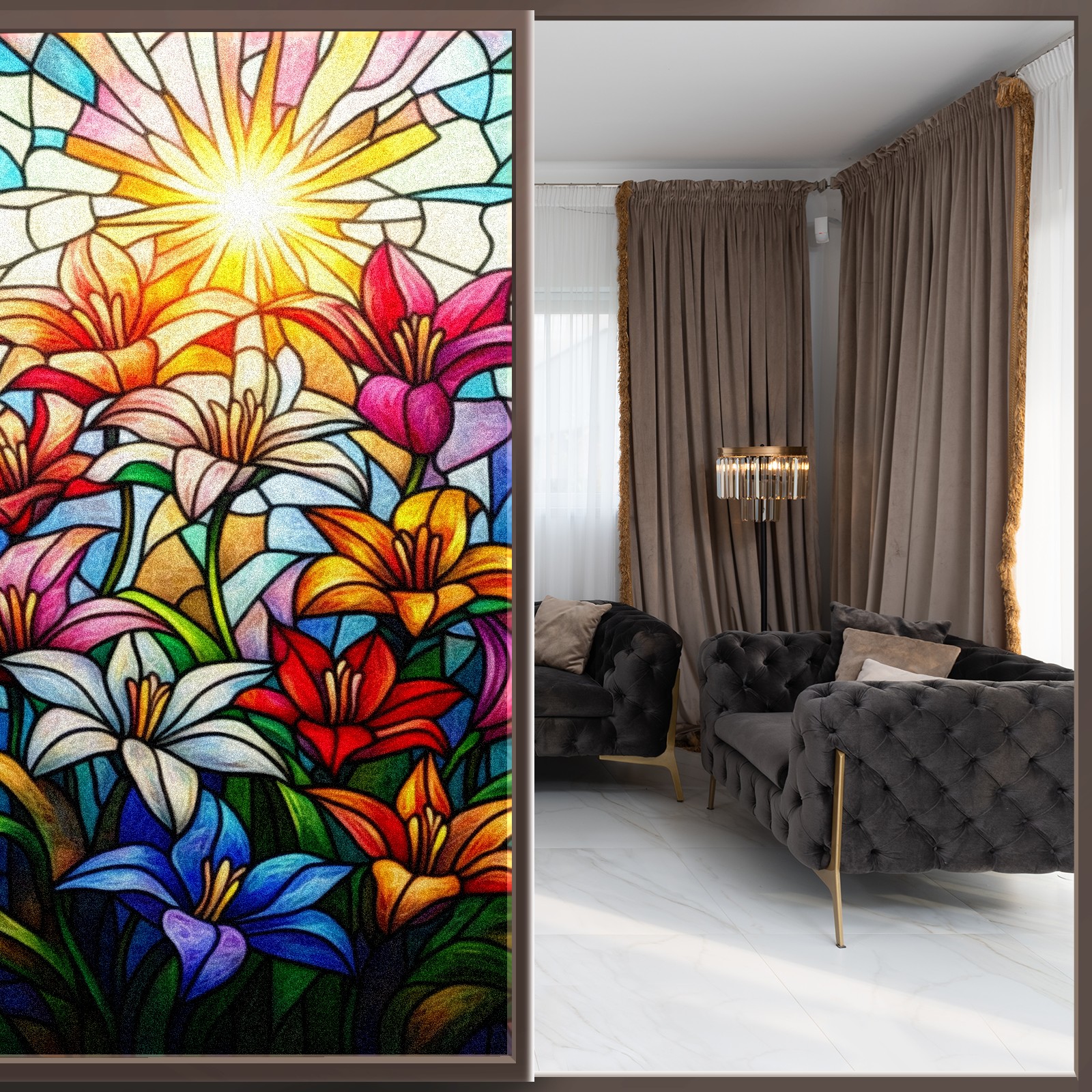 Single sided frosted full screen printed glass sticker soft pink green stripe seamless embroidery pattern privacy decoration Lilies And Sun