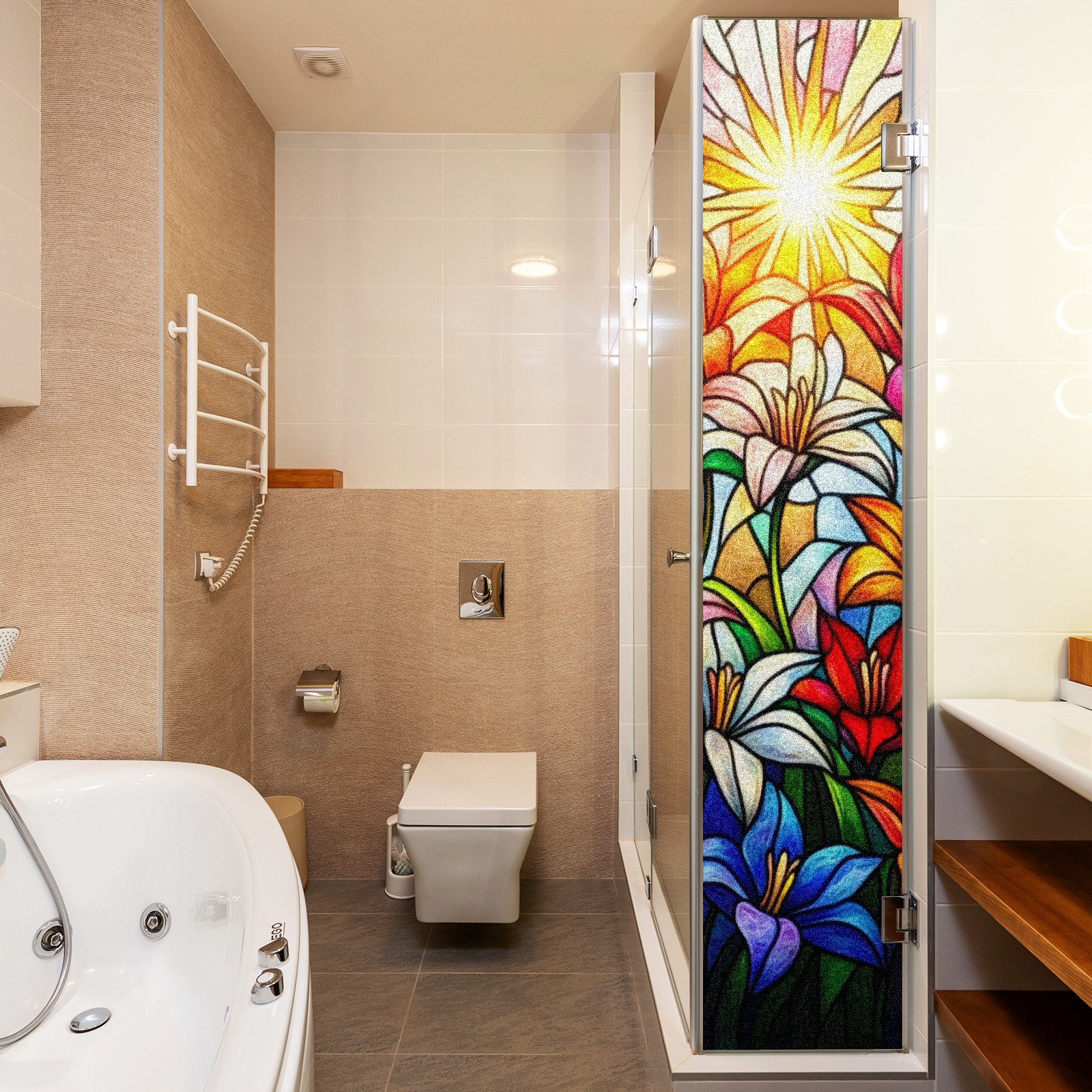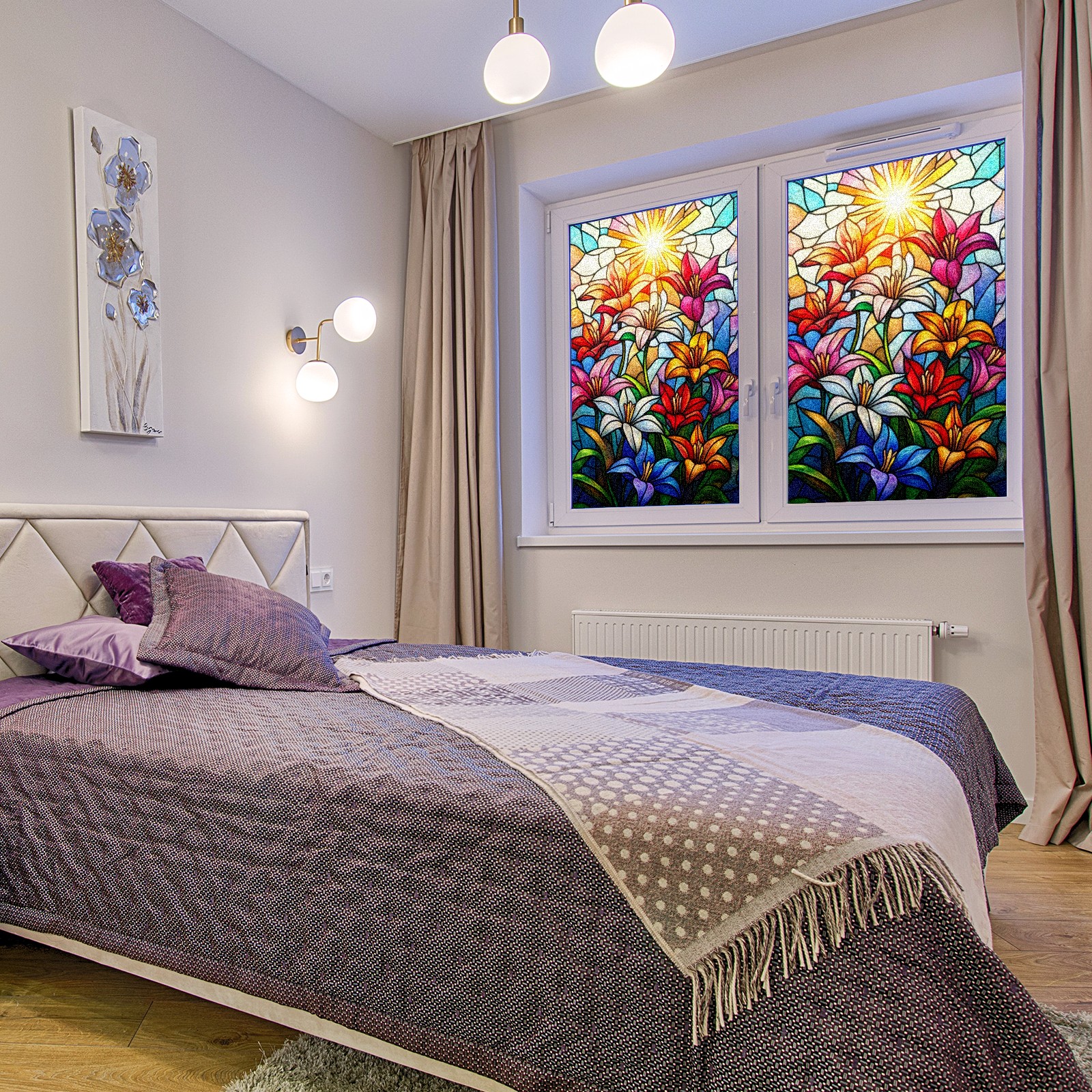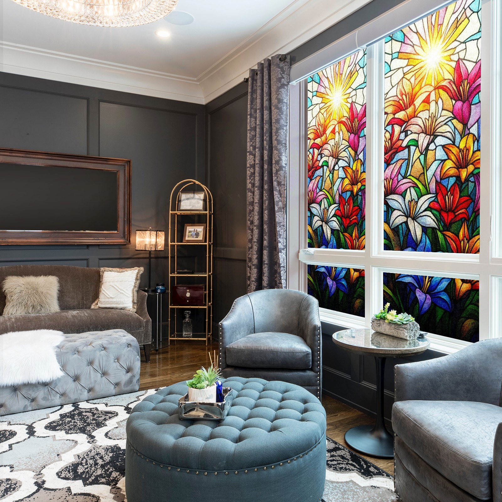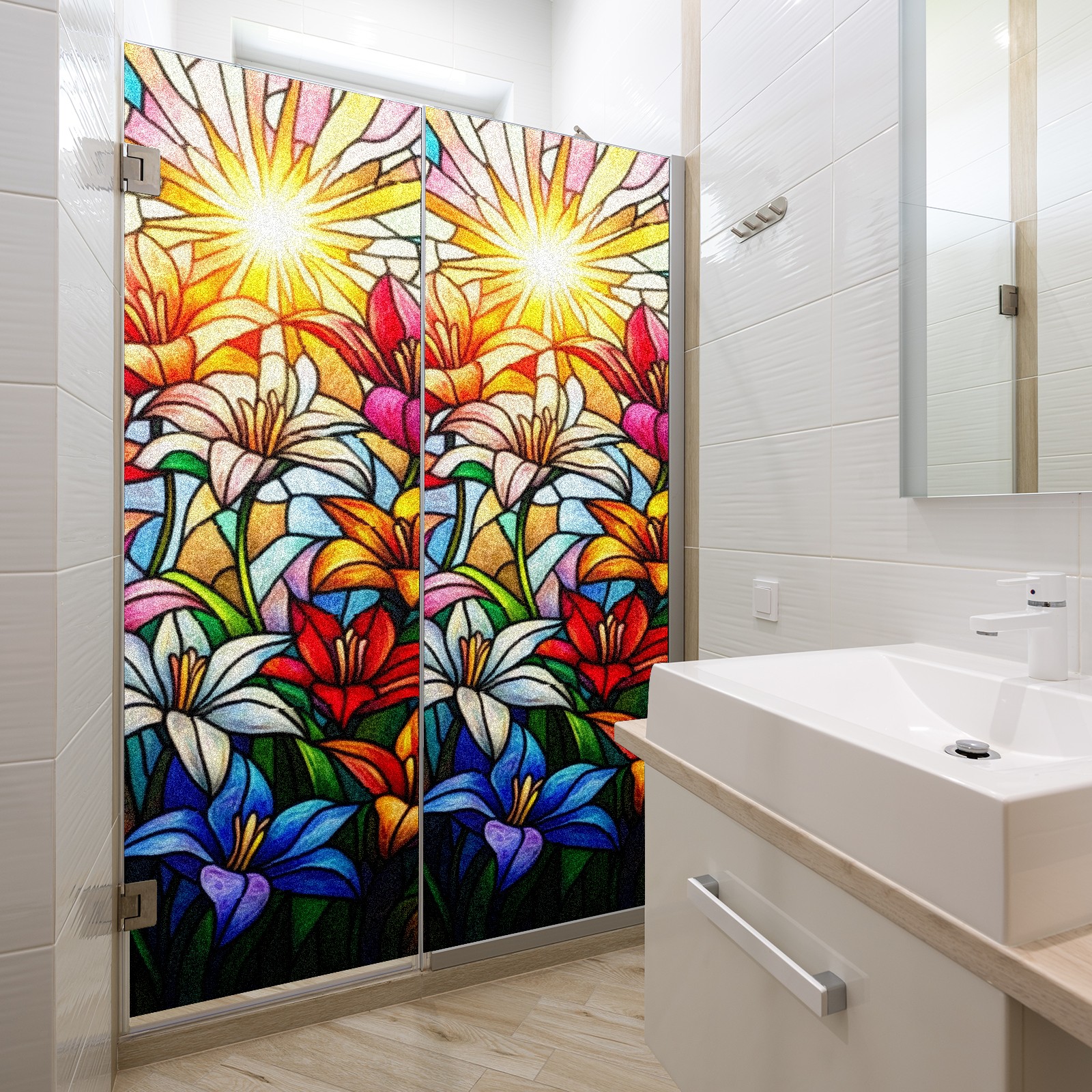 Single sided frosted full screen printed glass sticker soft pink green stripe seamless embroidery pattern privacy decoration Lilies And Sun