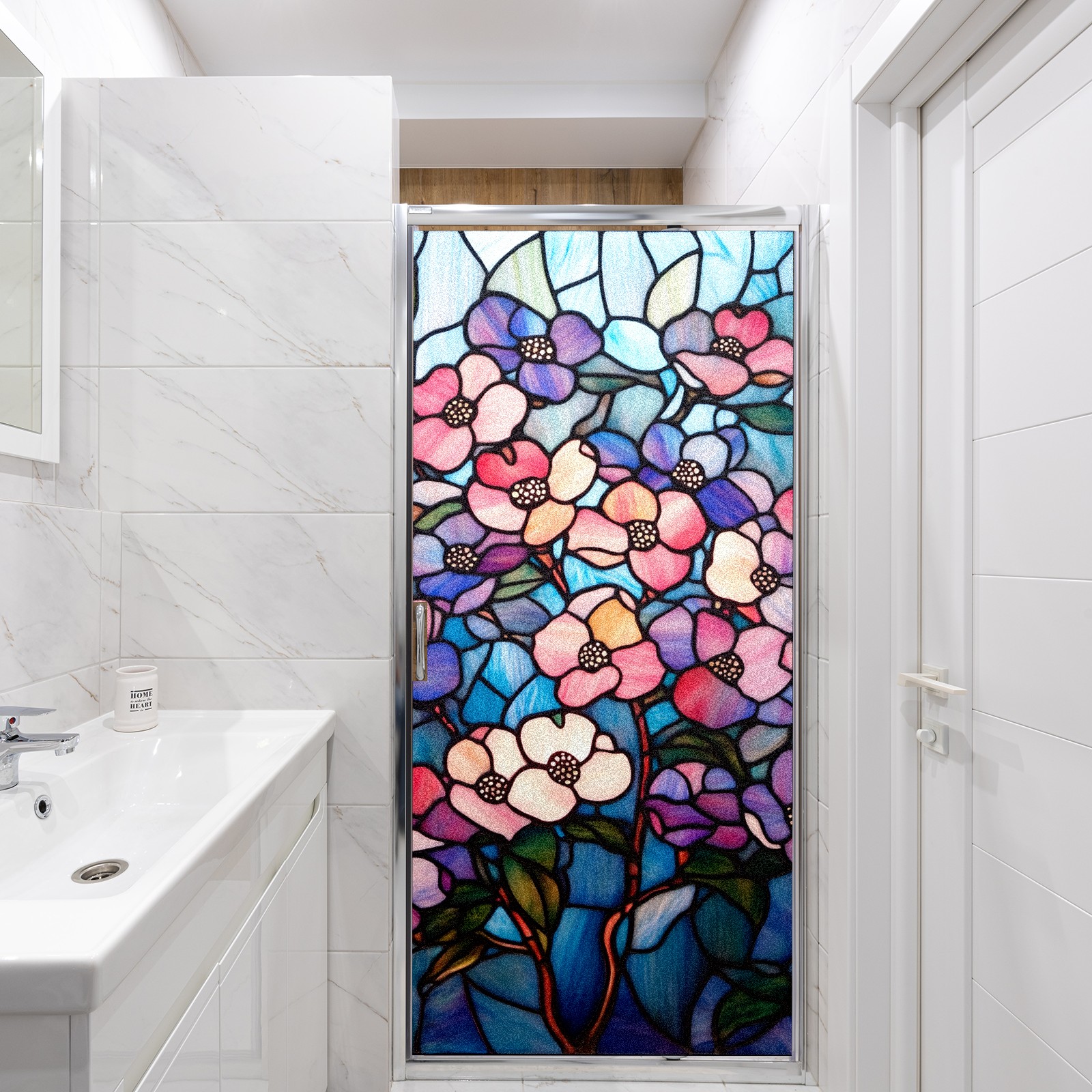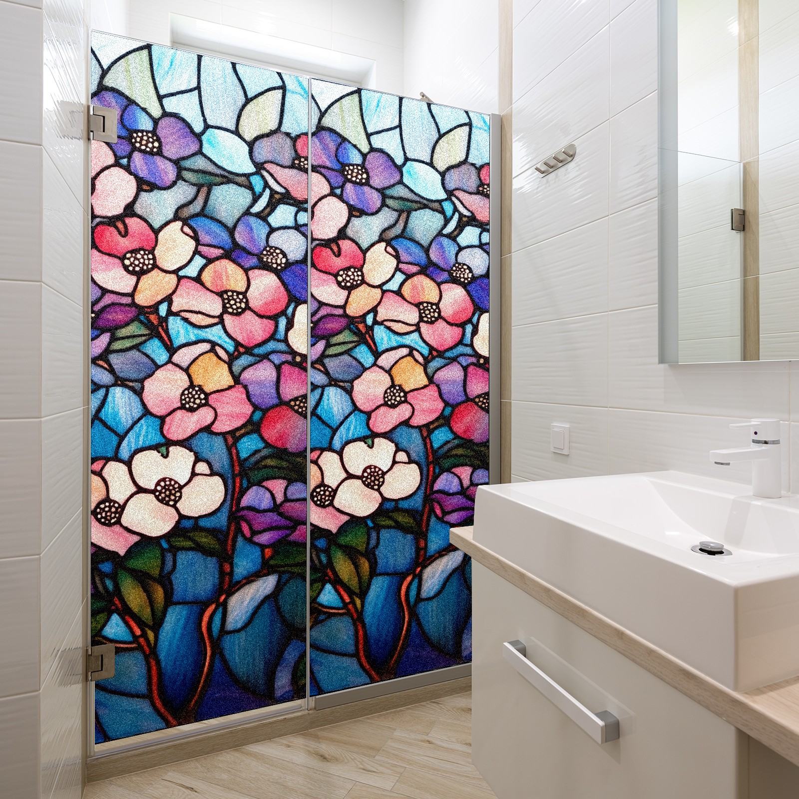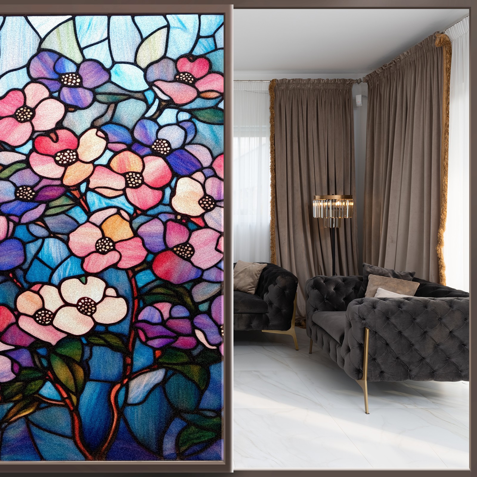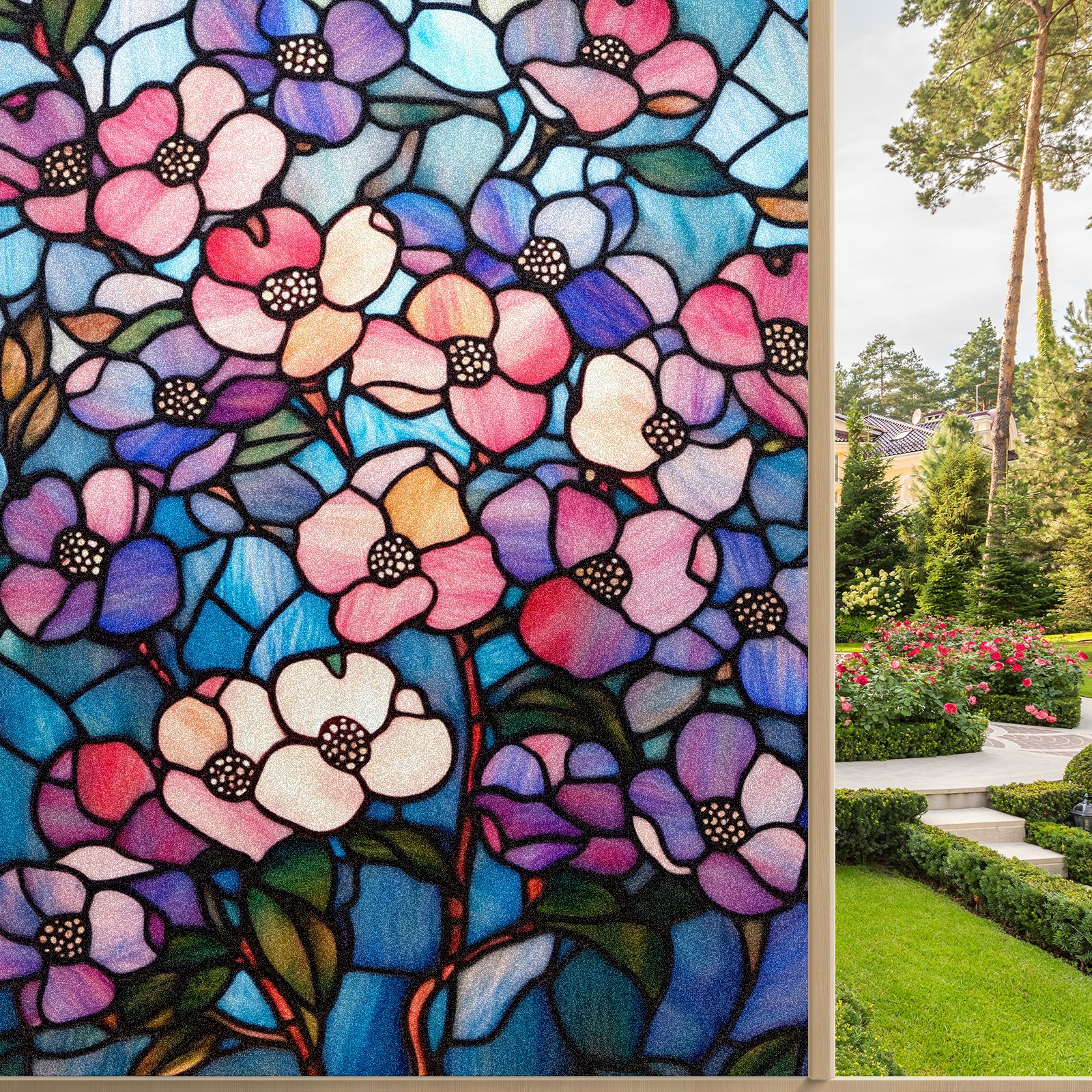 Single sided frosted full screen printed glass sticker soft pink green stripe seamless embroidery pattern privacy decoration Dogwood Flowers