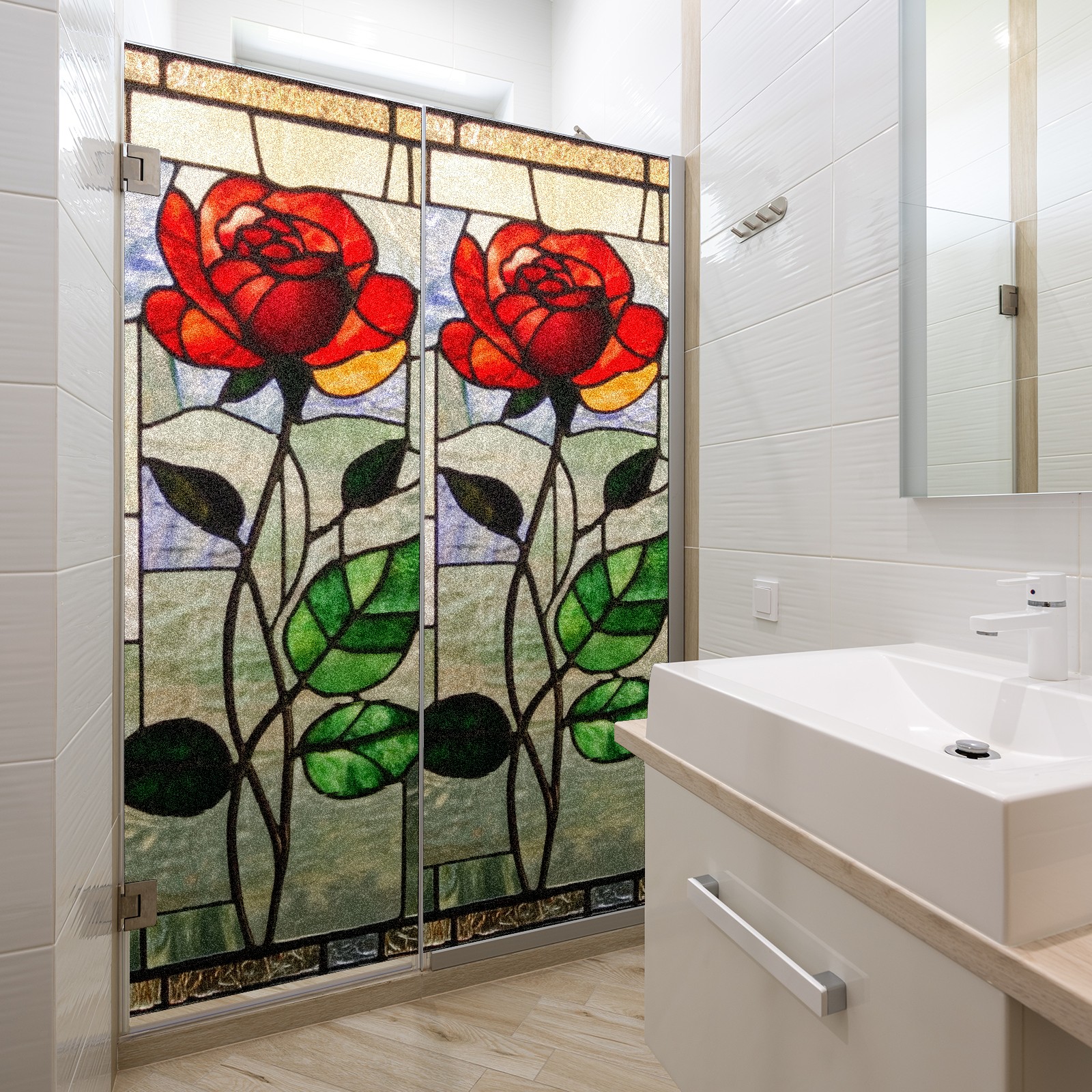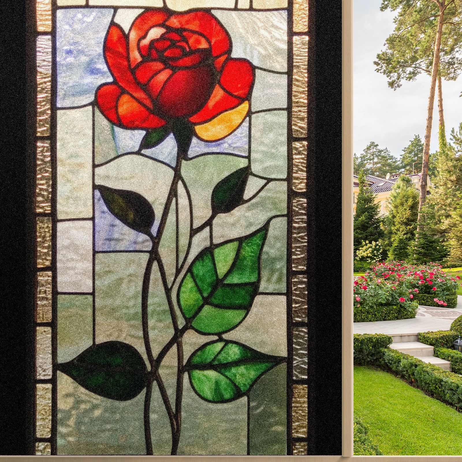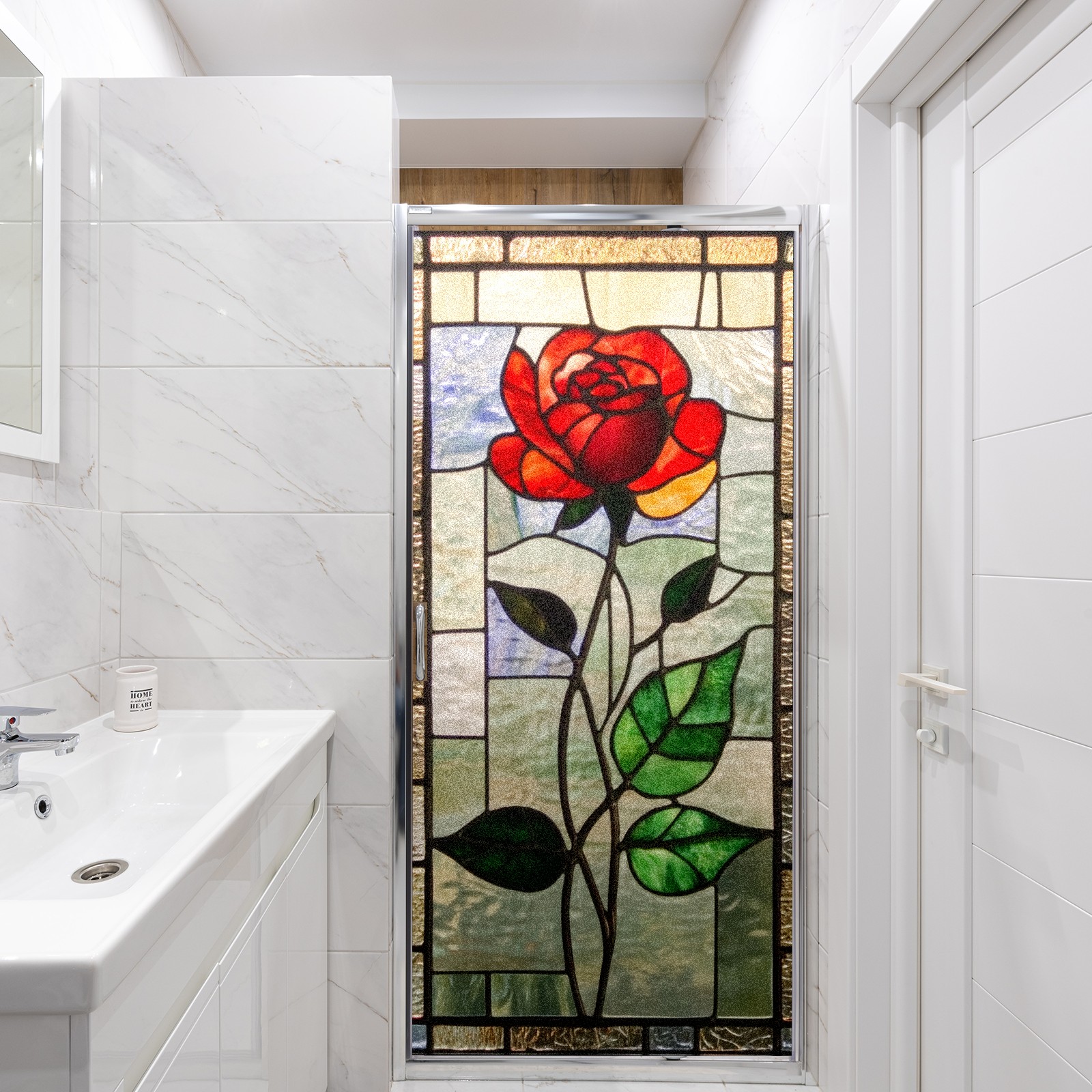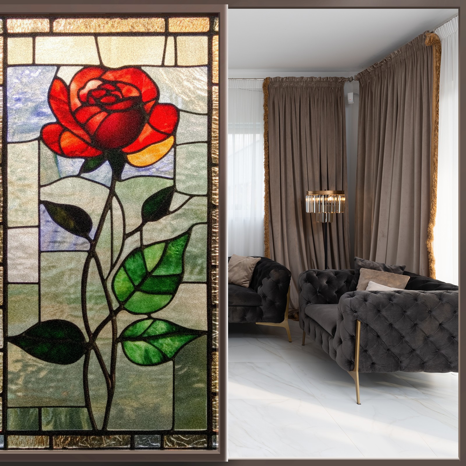 Single sided frosted full screen printed glass sticker soft pink green stripe seamless embroidery pattern privacy decoration Red Rose