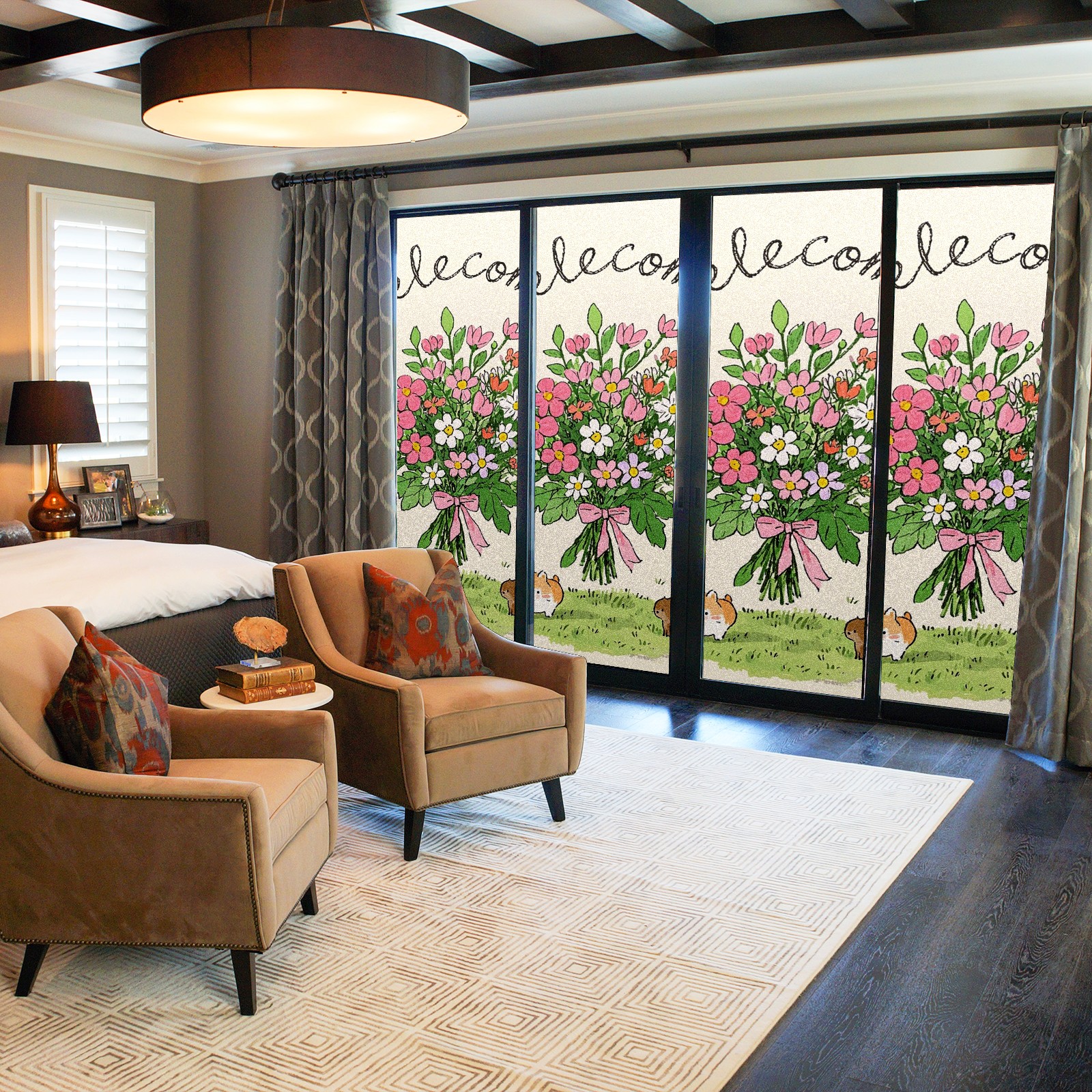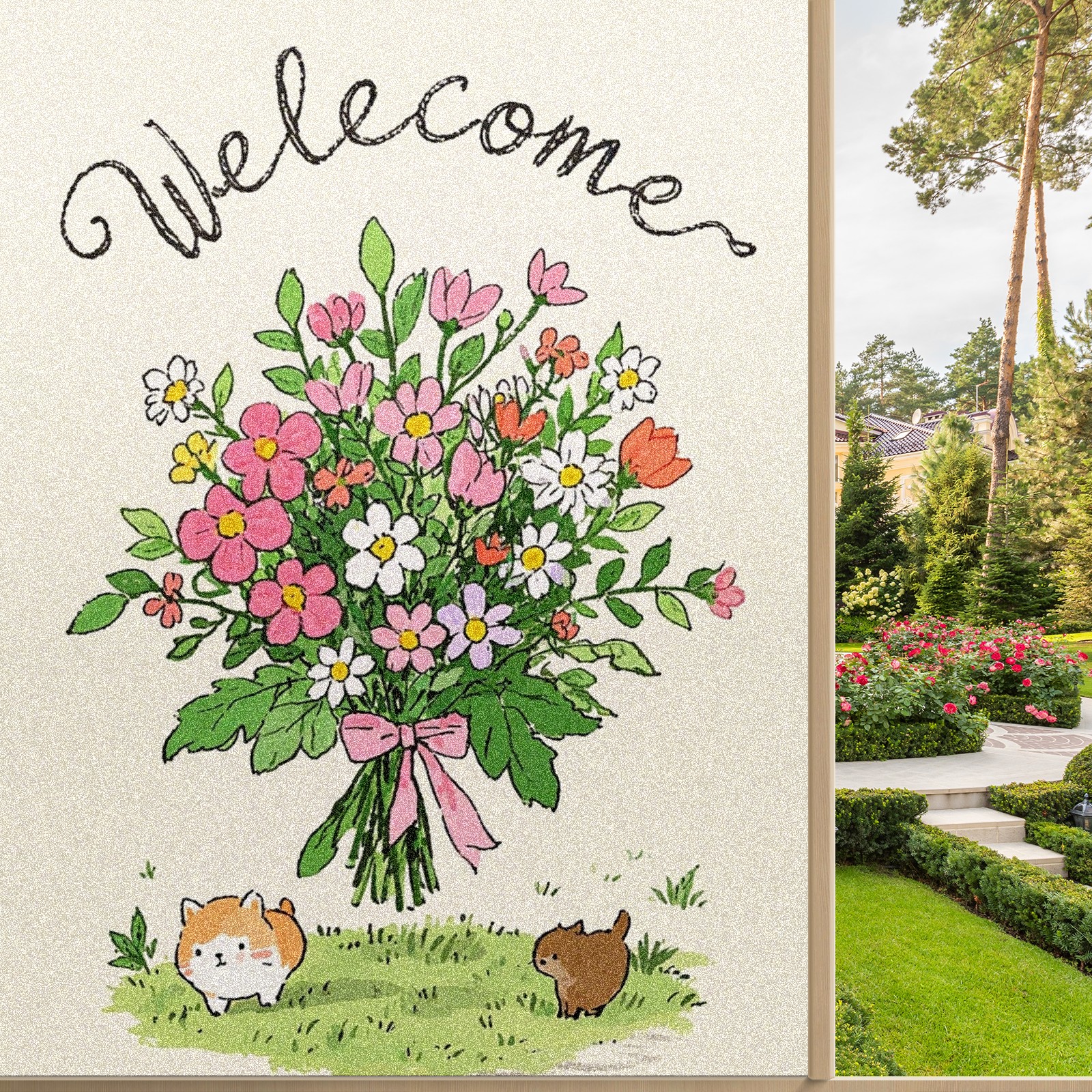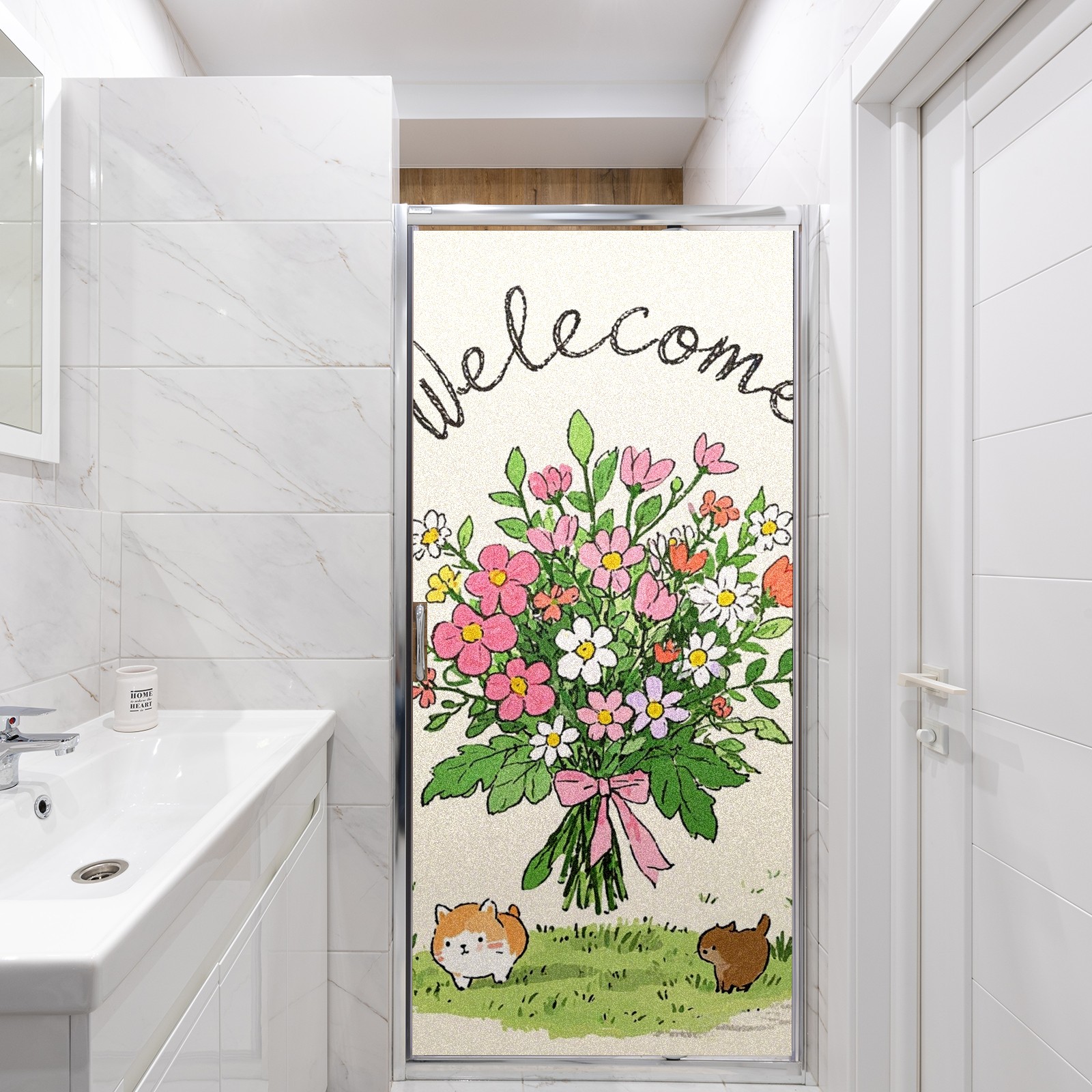 Single sided frosted full screen printed glass sticker soft pink green stripe seamless embroidery pattern privacy decoration Cute Kitten Bouquet