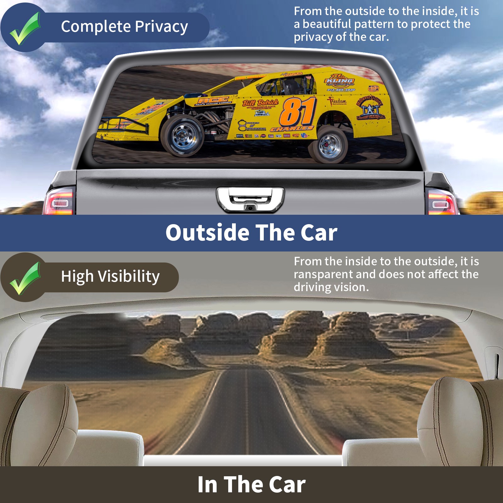 <p><strong>Truck Rear Window Graphics Decals Pickup Trucks Back Window Film Stickers 66" x 22" Perforated Vinyl Wrap Stickers Decorations for Car Rear Window</strong></p><p><strong><br /></strong></p><p><strong>Features :</strong></p><p>- Size of the rear window decals for trucks is 66x22 Inches (168x56cm).</p><p>- High quality perforated vinyl window film, one way vision sticker.</p><p>- Perforated is see through from the inside but not from outside.</p><p>- Clear printing, waterproof and durable.</p><p>- The car back window graphics stickers fits most truck and makes your vehicle more beautiful. </p><p><br /></p><p><strong>【Installation Instructions】</strong></p><p><strong>1. CLEAN SURFACE -</strong> Clean the rear window thoroughly and make sure the surface clean.</p><p><strong>2. STICK THE DECALS -</strong> Tear off the paper on the back and stick the decal on the window.</p><p><strong>3. SCRAPE OFF AIR BUBBLES -</strong> Use a squeegee or other card to scrape off the excess air bubbles.</p><p><strong>4. TRIM THE EXCESS -</strong> Use a knife to cut off the excess stickers of the window, finally complete.</p><p><br /></p><p>1. Please measure the size before purchasing, back window graphics decal for truck can be cut to your desired size.</p><p>2.The graphics stickers for truck back window is a great gift for yourself also can as a birthday / halloween / christmas gift for your friends and family.</p>