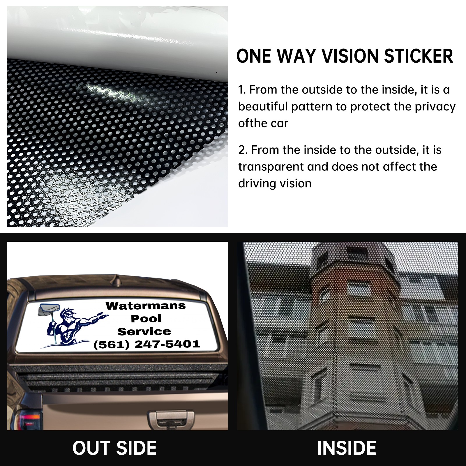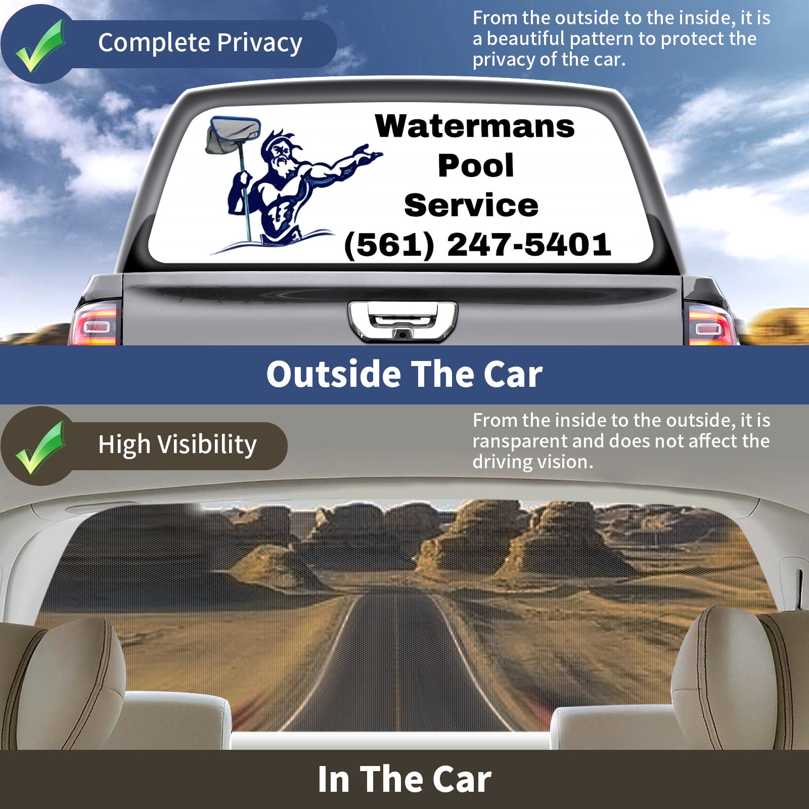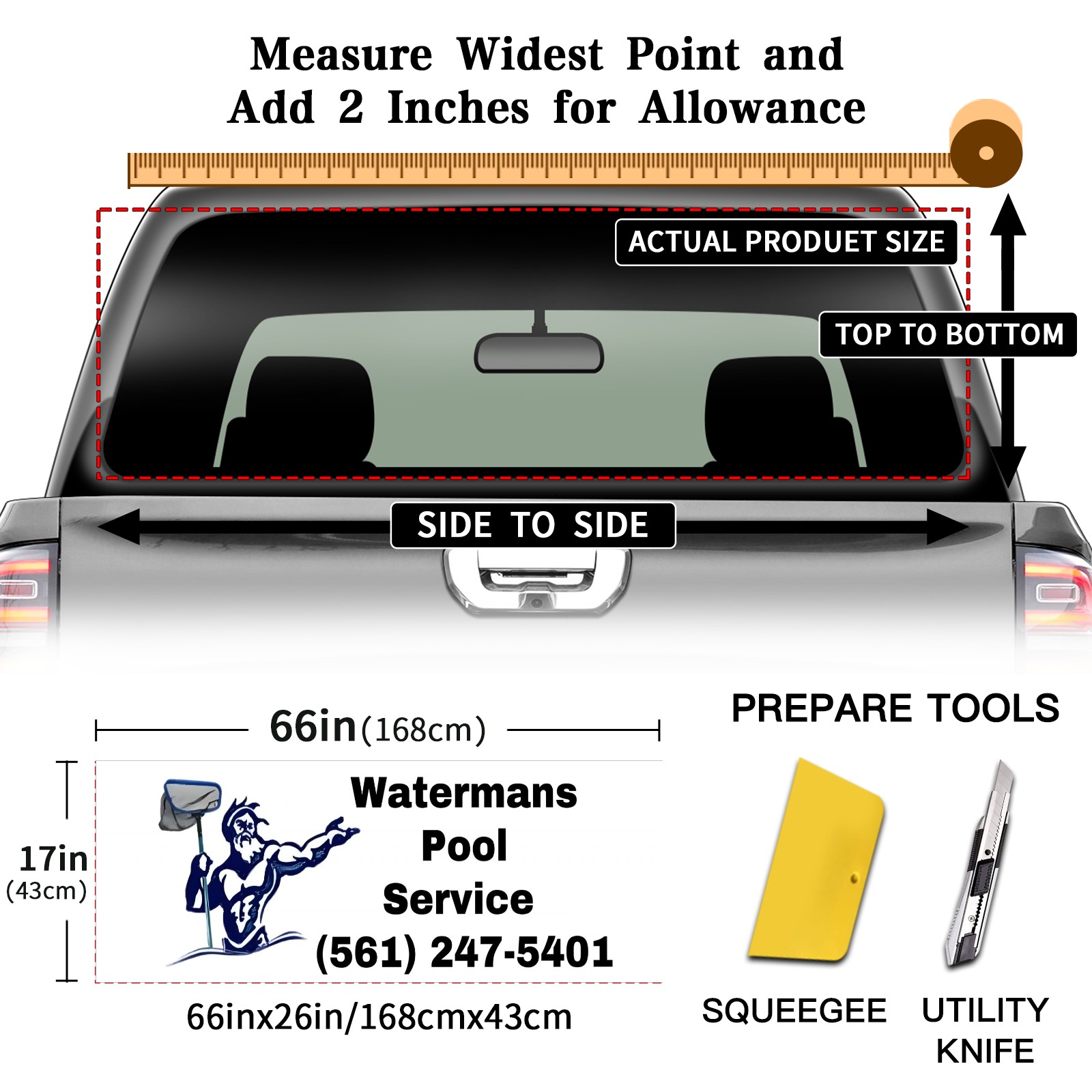 <p><strong>Truck Rear Window Graphics Decals Pickup Trucks Back Window Film Stickers 66" x 22" Perforated Vinyl Wrap Stickers Decorations for Car Rear Window</strong></p><p><strong><br /></strong></p><p><strong>Features :</strong></p><p>- Size of the rear window decals for trucks is 66x22 Inches (168x56cm).</p><p>- High quality perforated vinyl window film, one way vision sticker.</p><p>- Perforated is see through from the inside but not from outside.</p><p>- Clear printing, waterproof and durable.</p><p>- The car back window graphics stickers fits most truck and makes your vehicle more beautiful. </p><p><br /></p><p><strong>【Installation Instructions】</strong></p><p><strong>1. CLEAN SURFACE -</strong> Clean the rear window thoroughly and make sure the surface clean.</p><p><strong>2. STICK THE DECALS -</strong> Tear off the paper on the back and stick the decal on the window.</p><p><strong>3. SCRAPE OFF AIR BUBBLES -</strong> Use a squeegee or other card to scrape off the excess air bubbles.</p><p><strong>4. TRIM THE EXCESS -</strong> Use a knife to cut off the excess stickers of the window, finally complete.</p><p><br /></p><p>1. Please measure the size before purchasing, back window graphics decal for truck can be cut to your desired size.</p><p>2.The graphics stickers for truck back window is a great gift for yourself also can as a birthday / halloween / christmas gift for your friends and family.</p>