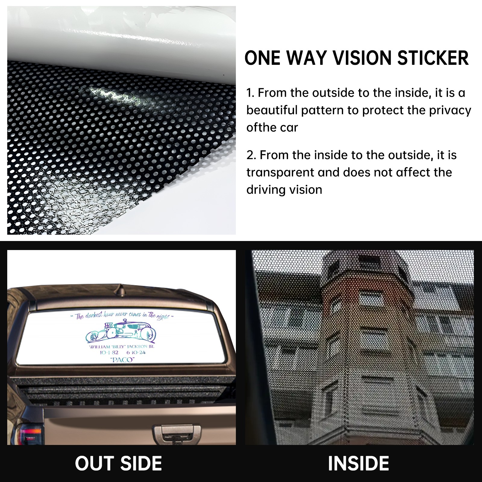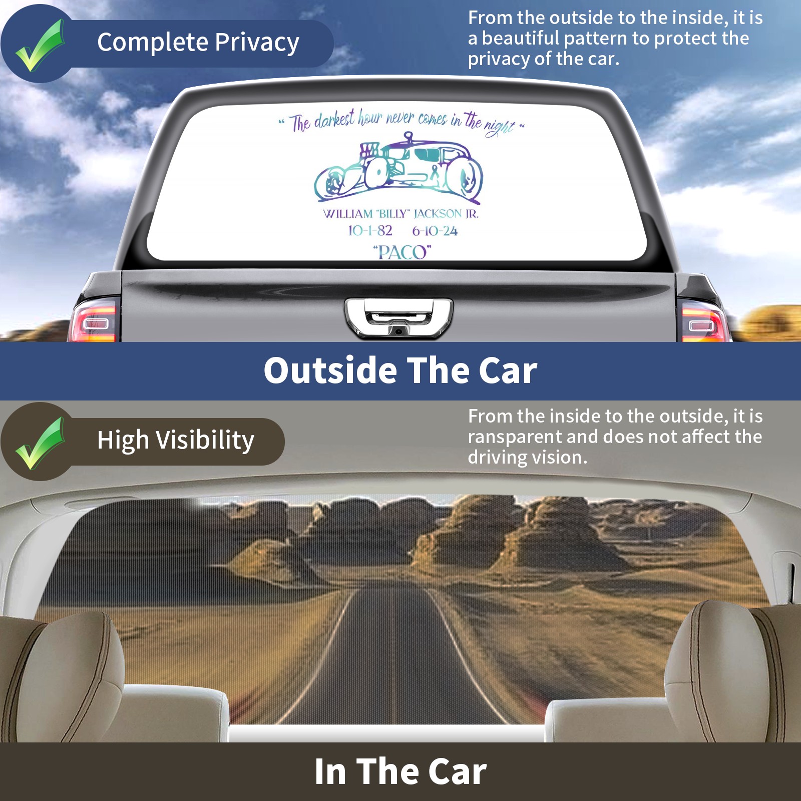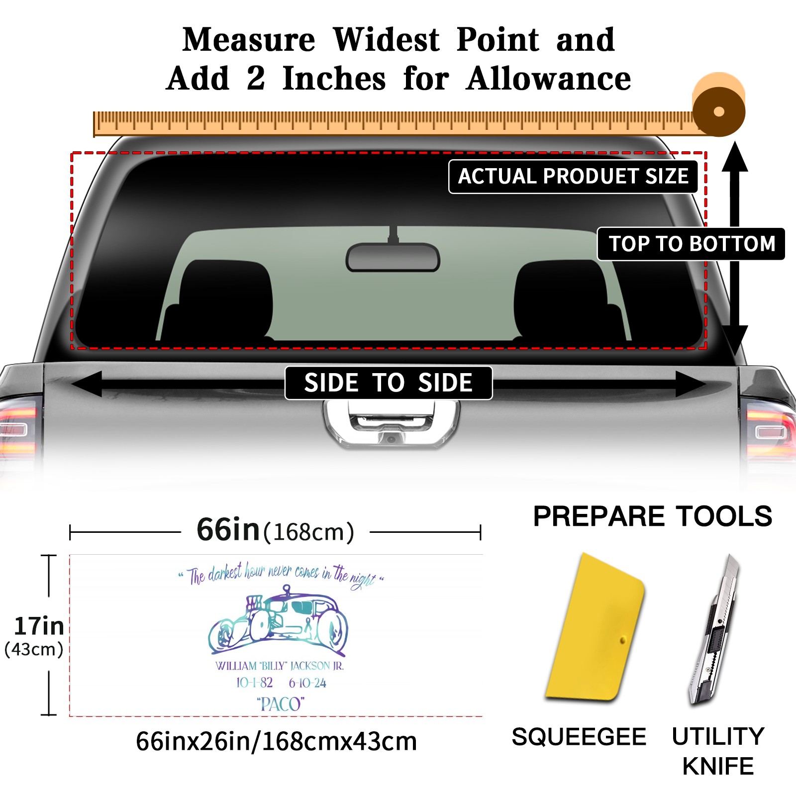 <p><strong>Truck Rear Window Graphics Decals Pickup Trucks Back Window Film Stickers 66" x 22" Perforated Vinyl Wrap Stickers Decorations for Car Rear Window</strong></p><p><strong><br /></strong></p><p><strong>Features :</strong></p><p>- Size of the rear window decals for trucks is 66x22 Inches (168x56cm).</p><p>- High quality perforated vinyl window film, one way vision sticker.</p><p>- Perforated is see through from the inside but not from outside.</p><p>- Clear printing, waterproof and durable.</p><p>- The car back window graphics stickers fits most truck and makes your vehicle more beautiful. </p><p><br /></p><p><strong>【Installation Instructions】</strong></p><p><strong>1. CLEAN SURFACE -</strong> Clean the rear window thoroughly and make sure the surface clean.</p><p><strong>2. STICK THE DECALS -</strong> Tear off the paper on the back and stick the decal on the window.</p><p><strong>3. SCRAPE OFF AIR BUBBLES -</strong> Use a squeegee or other card to scrape off the excess air bubbles.</p><p><strong>4. TRIM THE EXCESS -</strong> Use a knife to cut off the excess stickers of the window, finally complete.</p><p><br /></p><p>1. Please measure the size before purchasing, back window graphics decal for truck can be cut to your desired size.</p><p>2.The graphics stickers for truck back window is a great gift for yourself also can as a birthday / halloween / christmas gift for your friends and family.</p>
