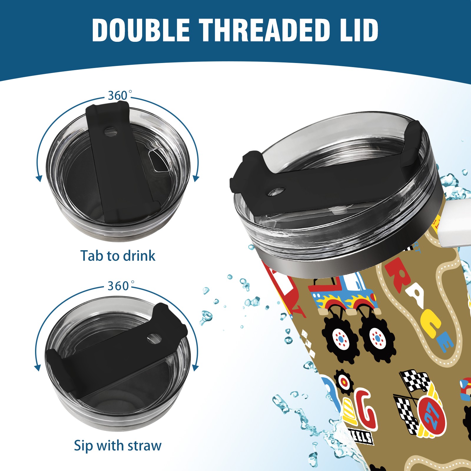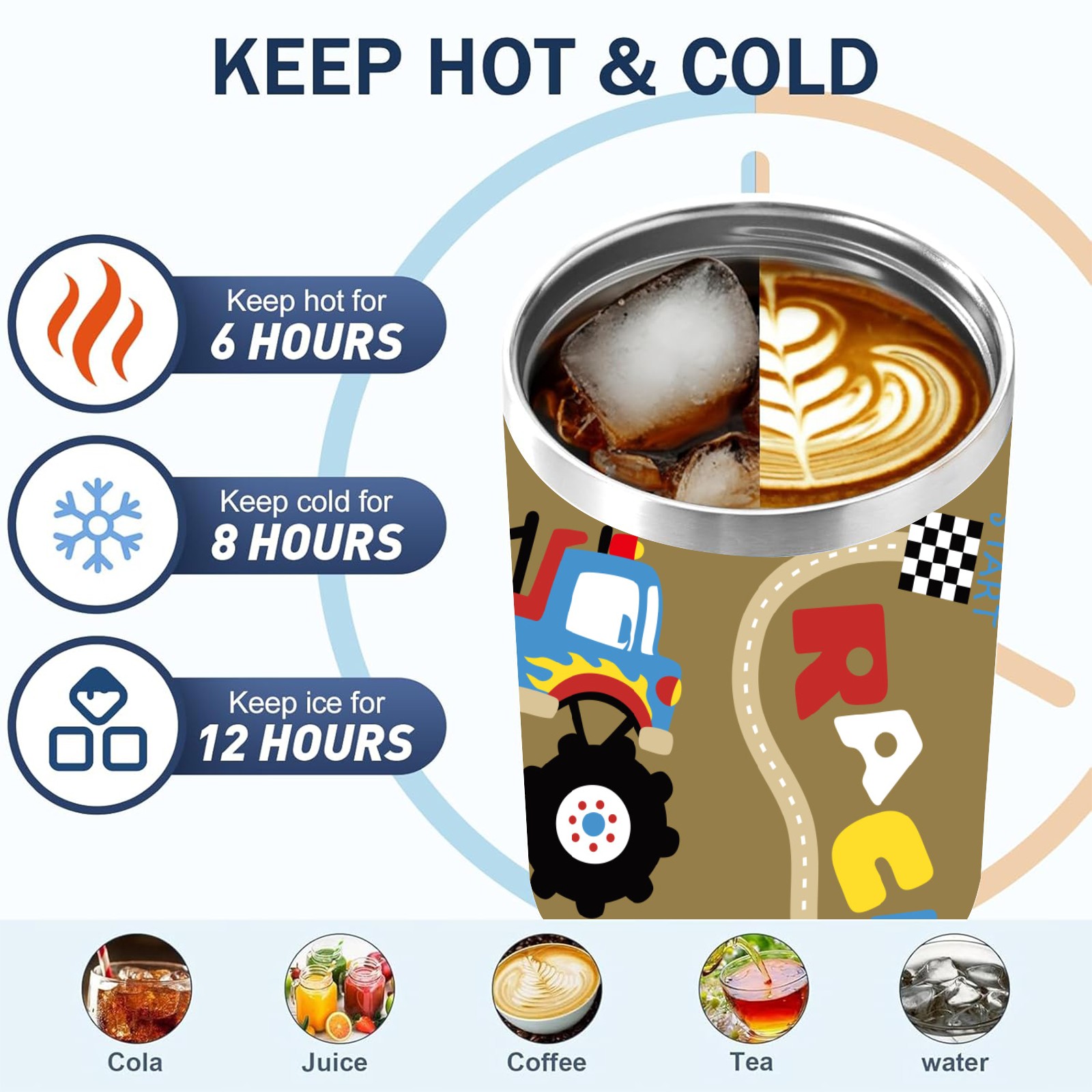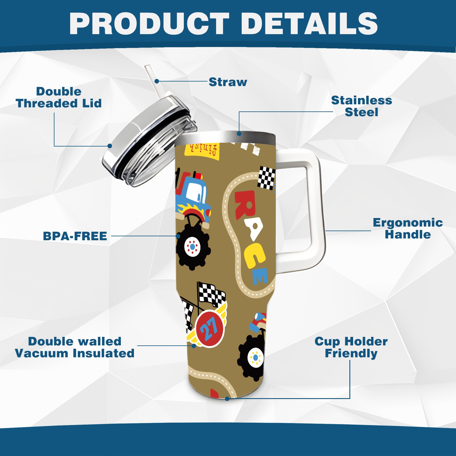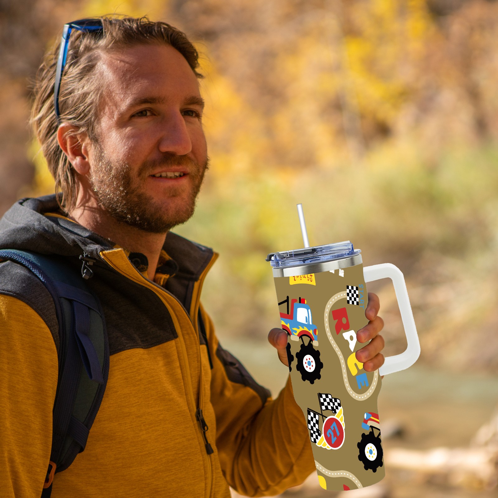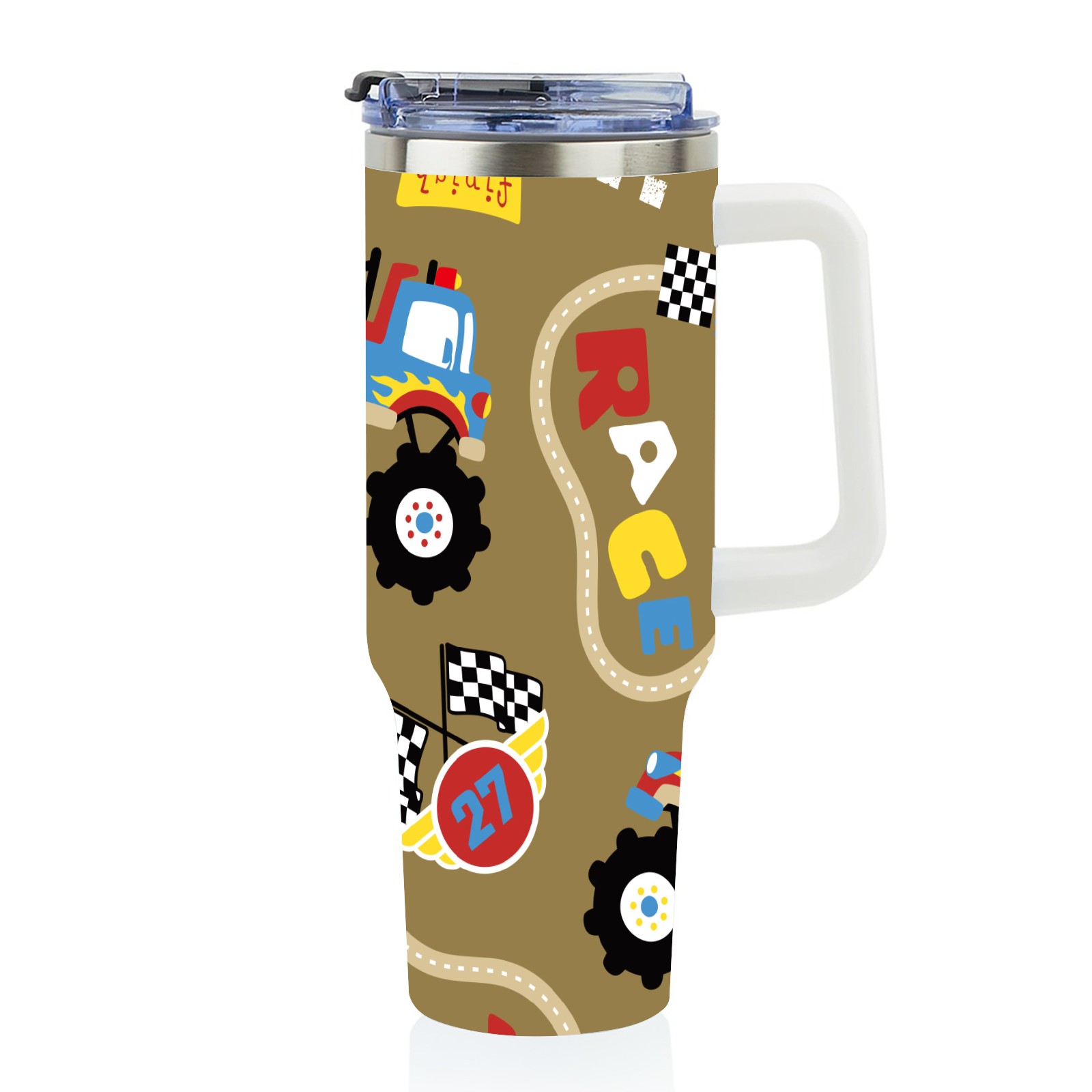 40oz Fully Printed Car Cup – Stylish Large-Capacity Tumbler with UV Printing TechnologyVintage Retro Cartoon Monster Trucks Pattern
