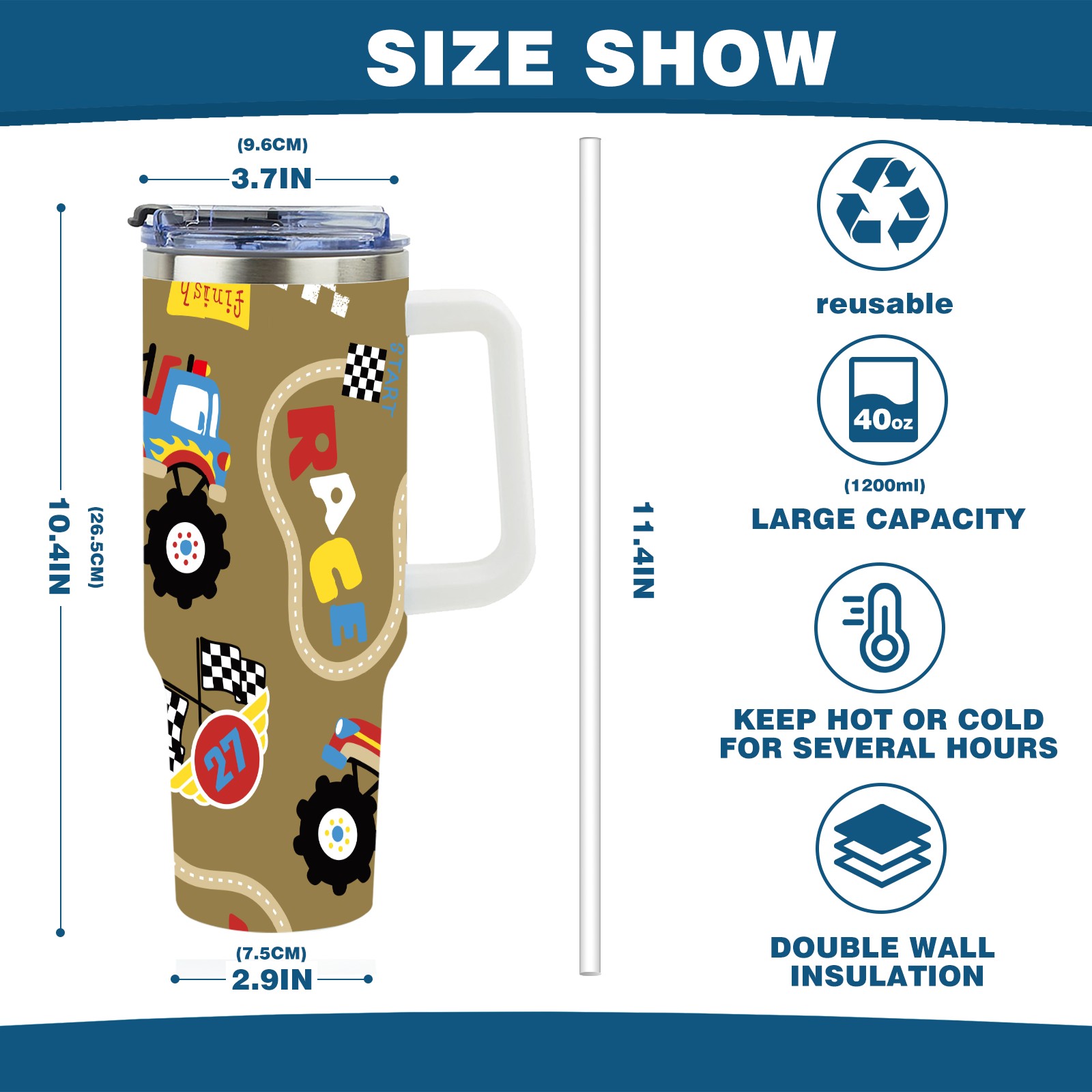 • <p>With a large 40oz capacity, it keeps you hydrated throughout the day, ideal for water, coffee, juice, or other beverages. Its ergonomic design fits seamlessly into car cup holders, complemented by a secure, leak-resistant lid to minimize spills during travel. The non-slip base ensures stability, while the smooth surfaces make cleaning a breeze—simply wash by hand or toss in the dishwasher (top rack recommended).</p>