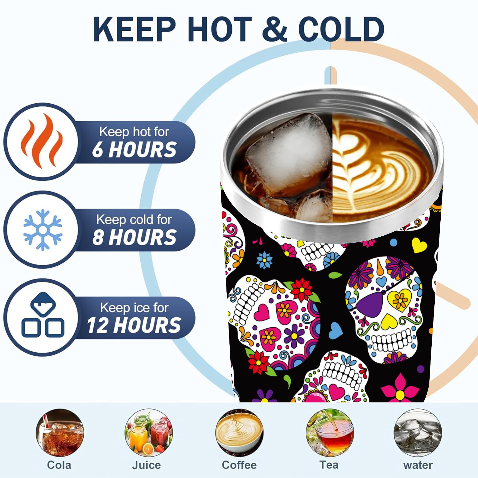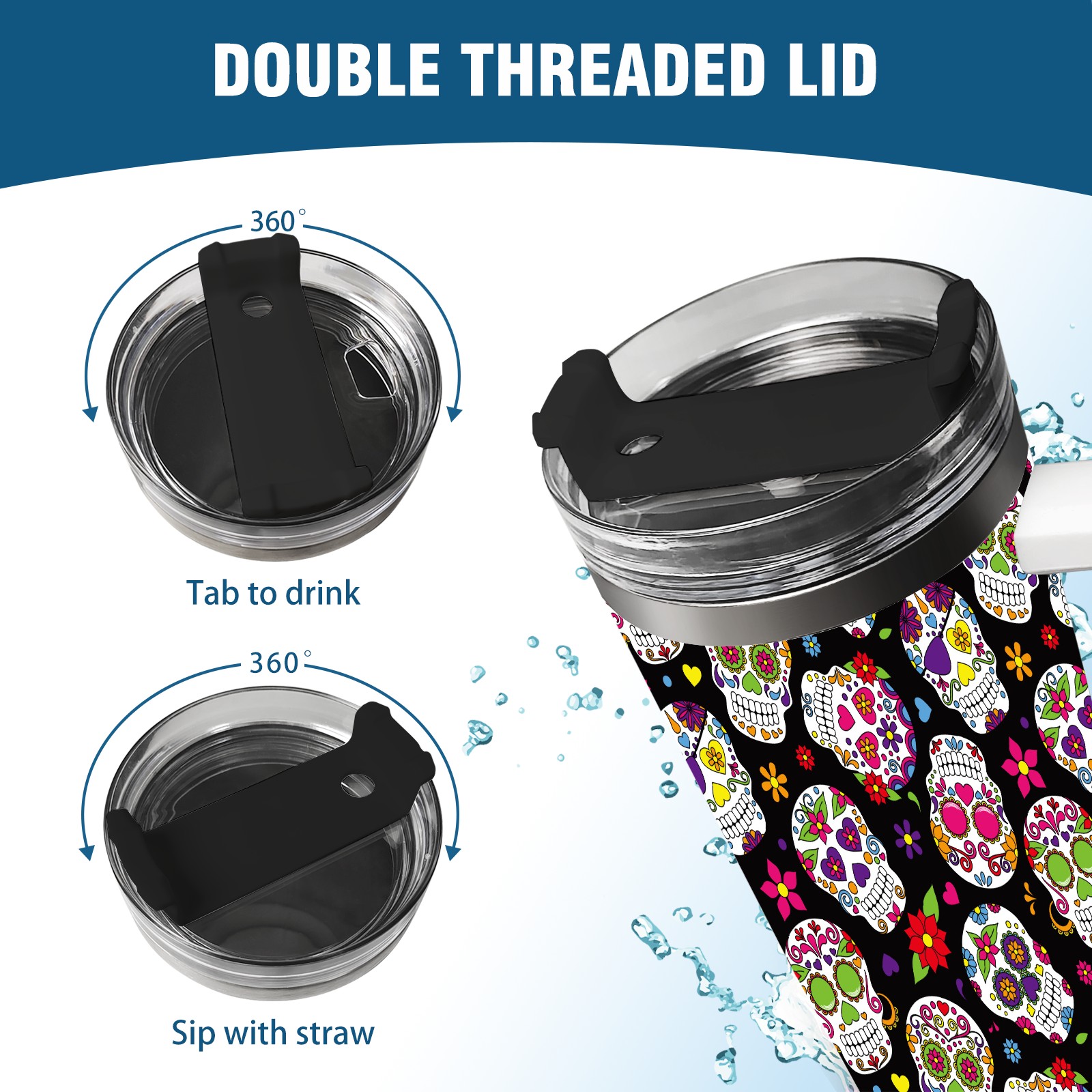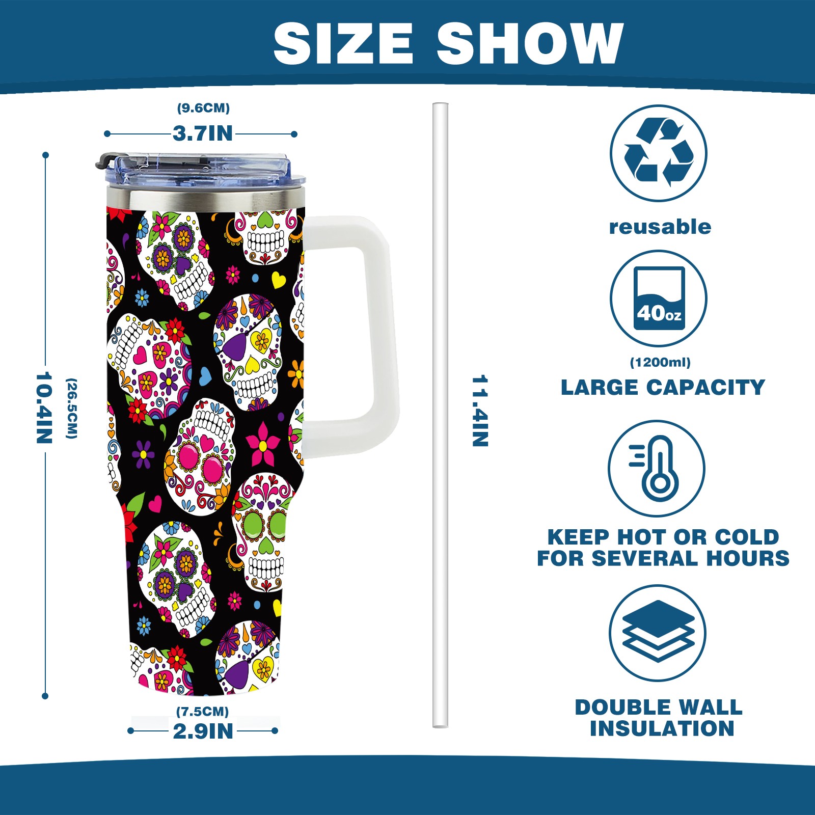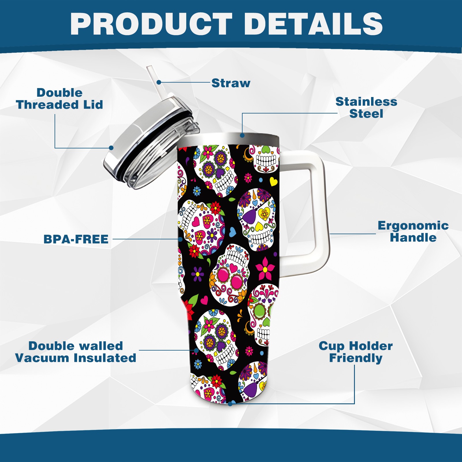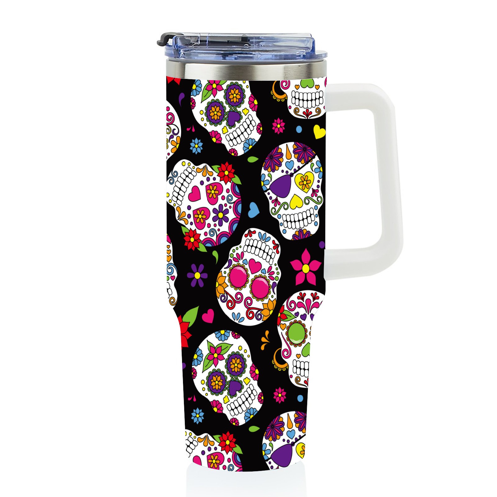 40oz Fully Printed Car Cup – Stylish Large-Capacity Tumbler with UV Printing TechnologyColorful Sugar Skulls