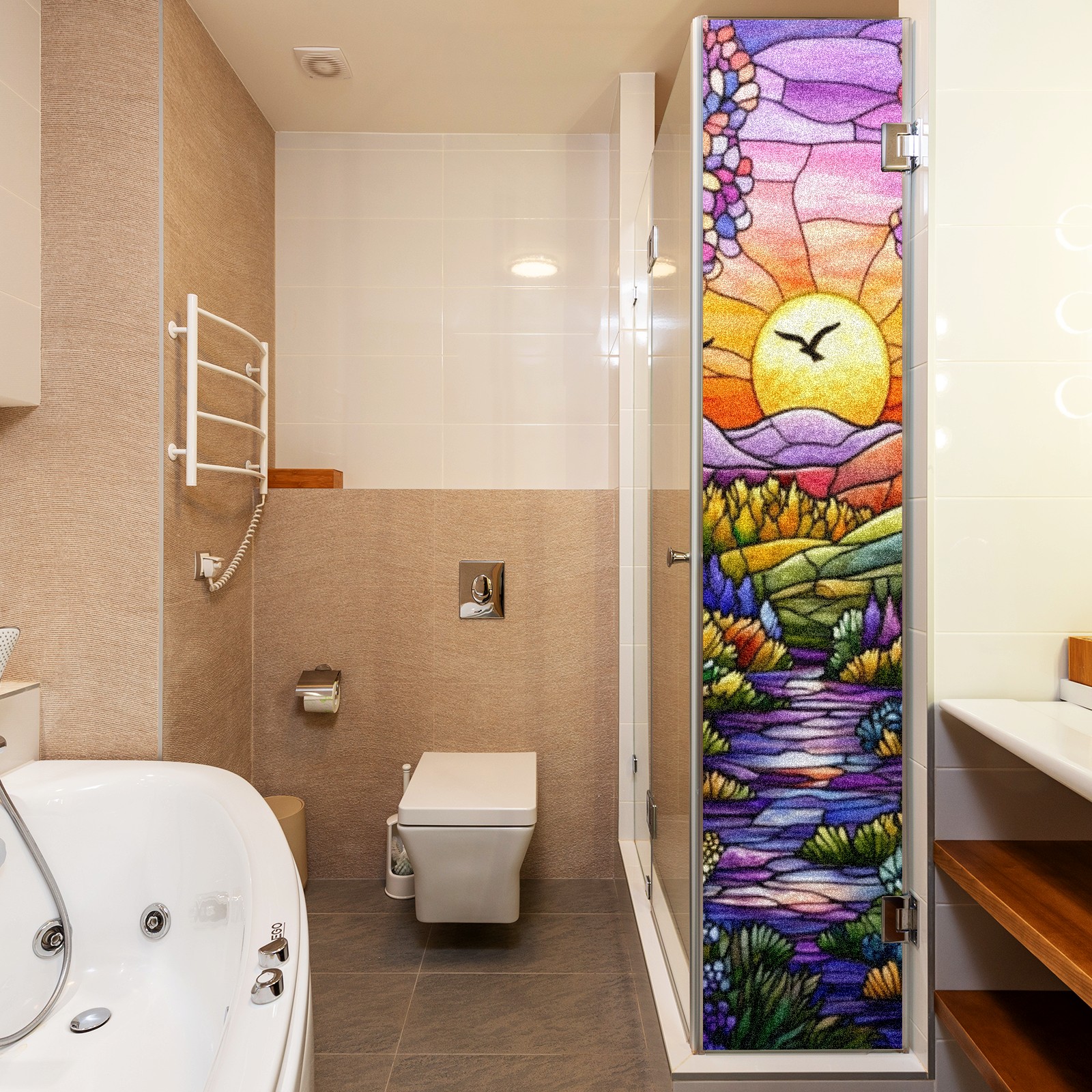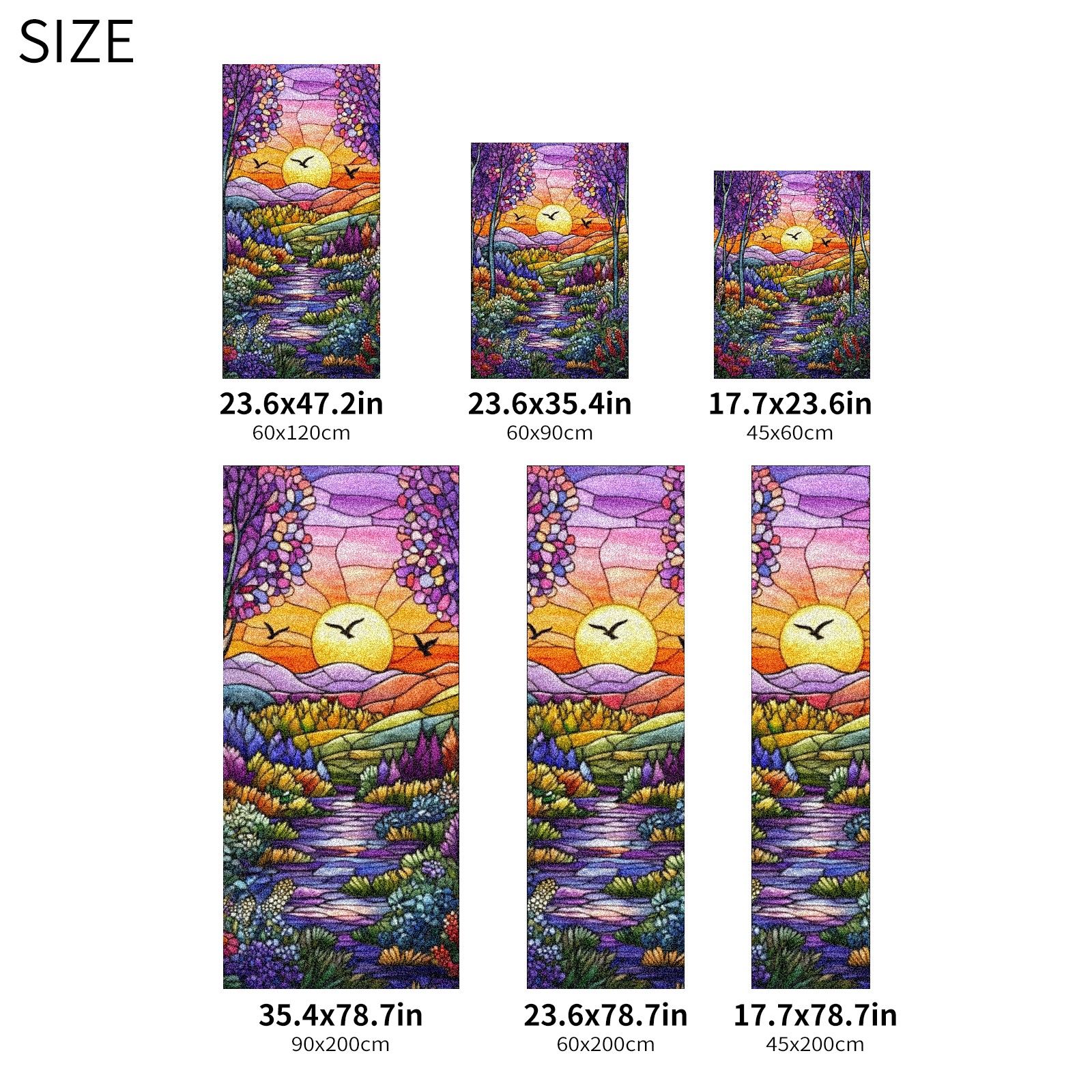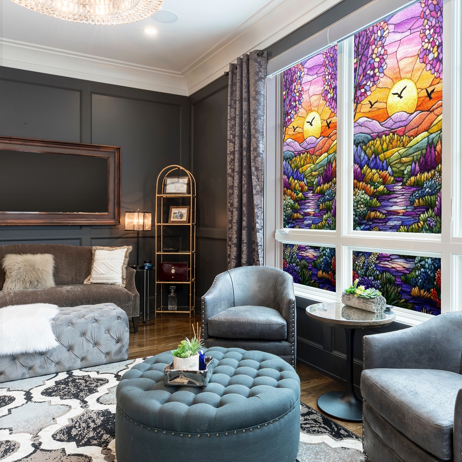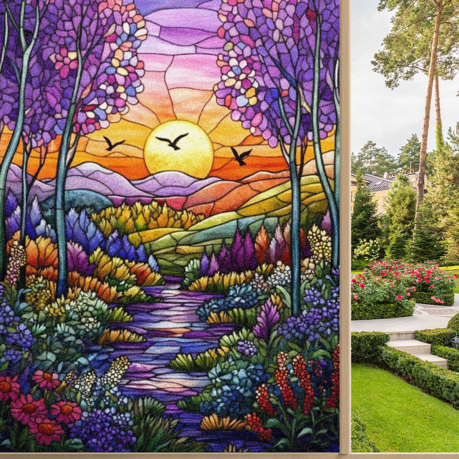 Single sided frosted full screen printed glass sticker soft pink green stripe seamless embroidery pattern privacy decoration Colorful Forest Scene