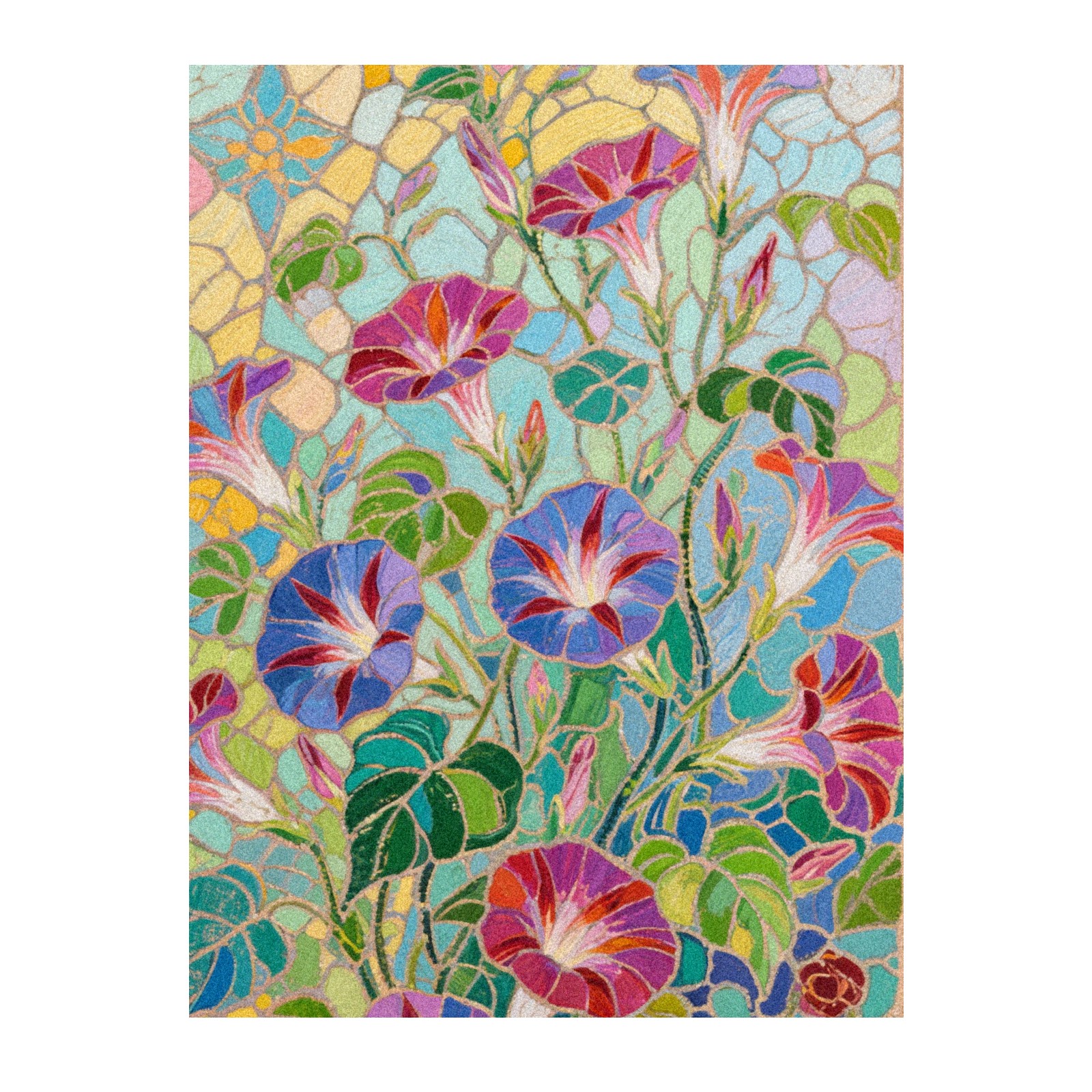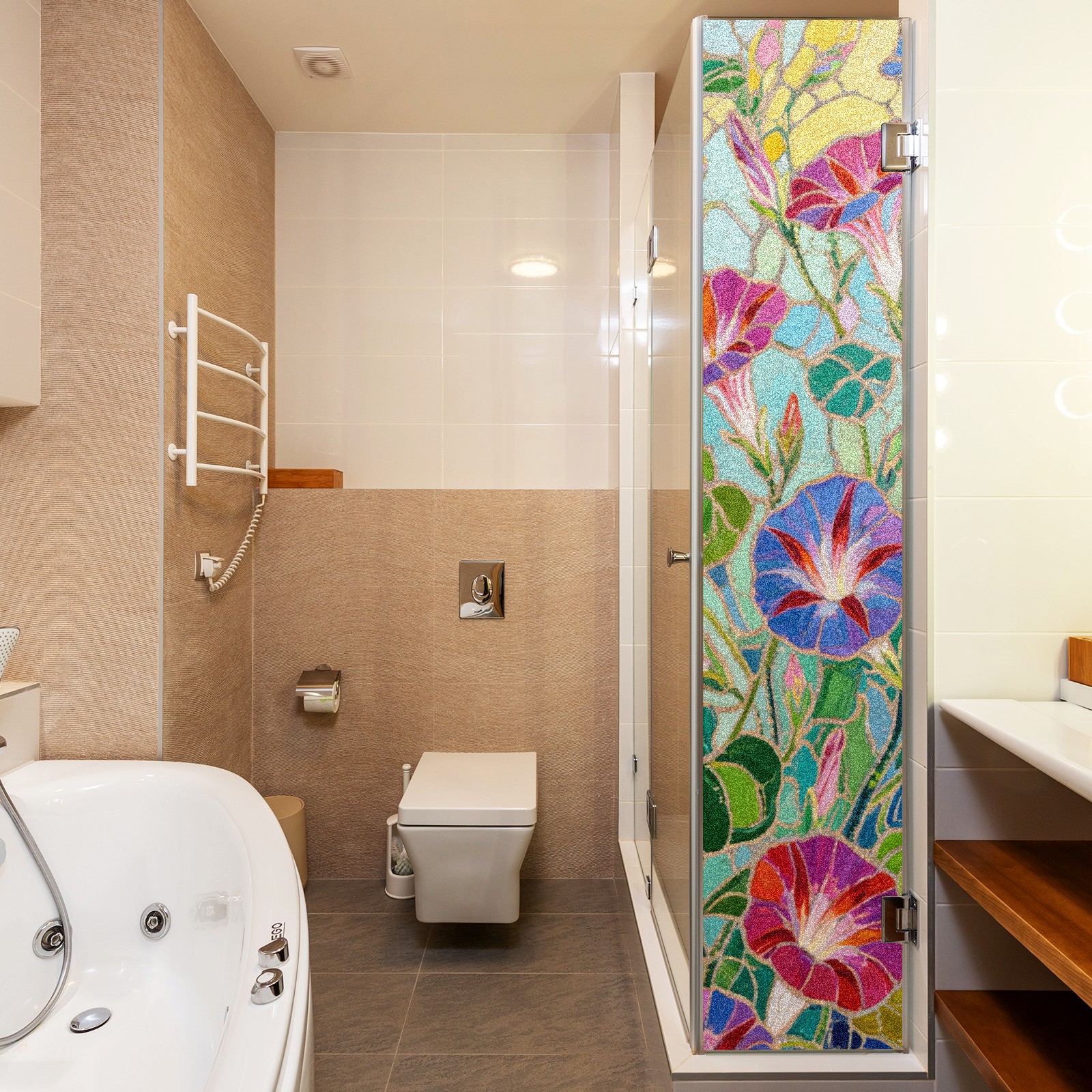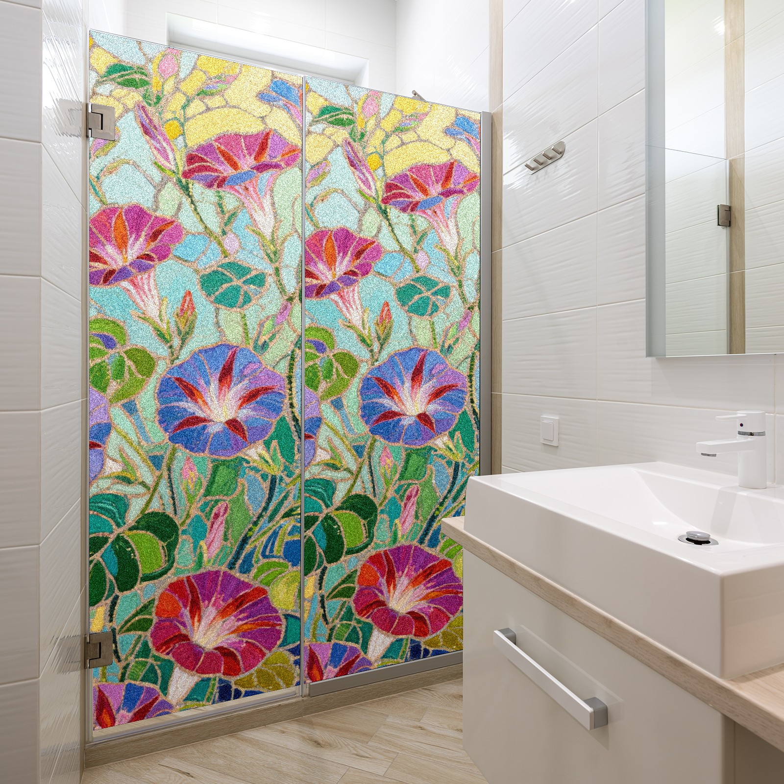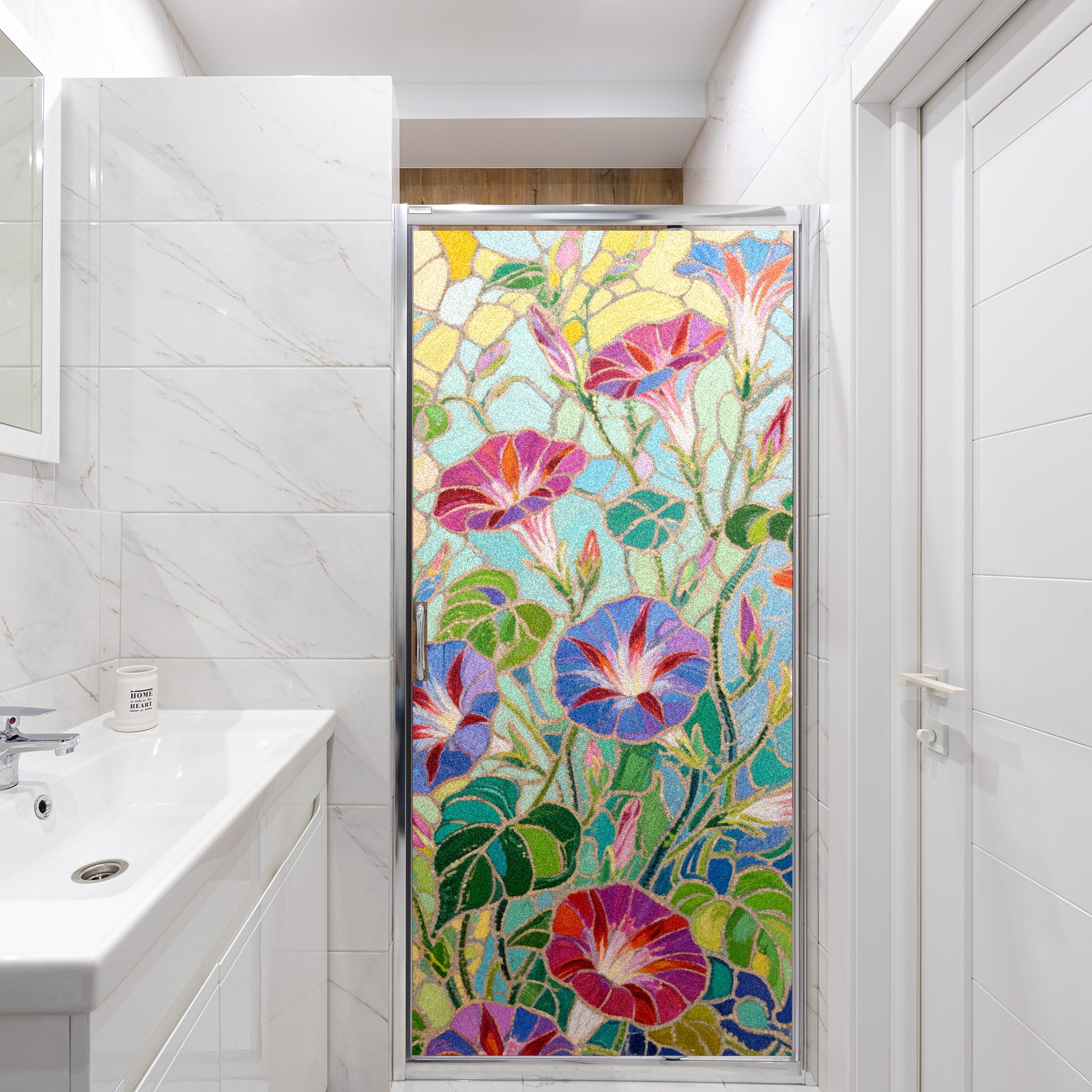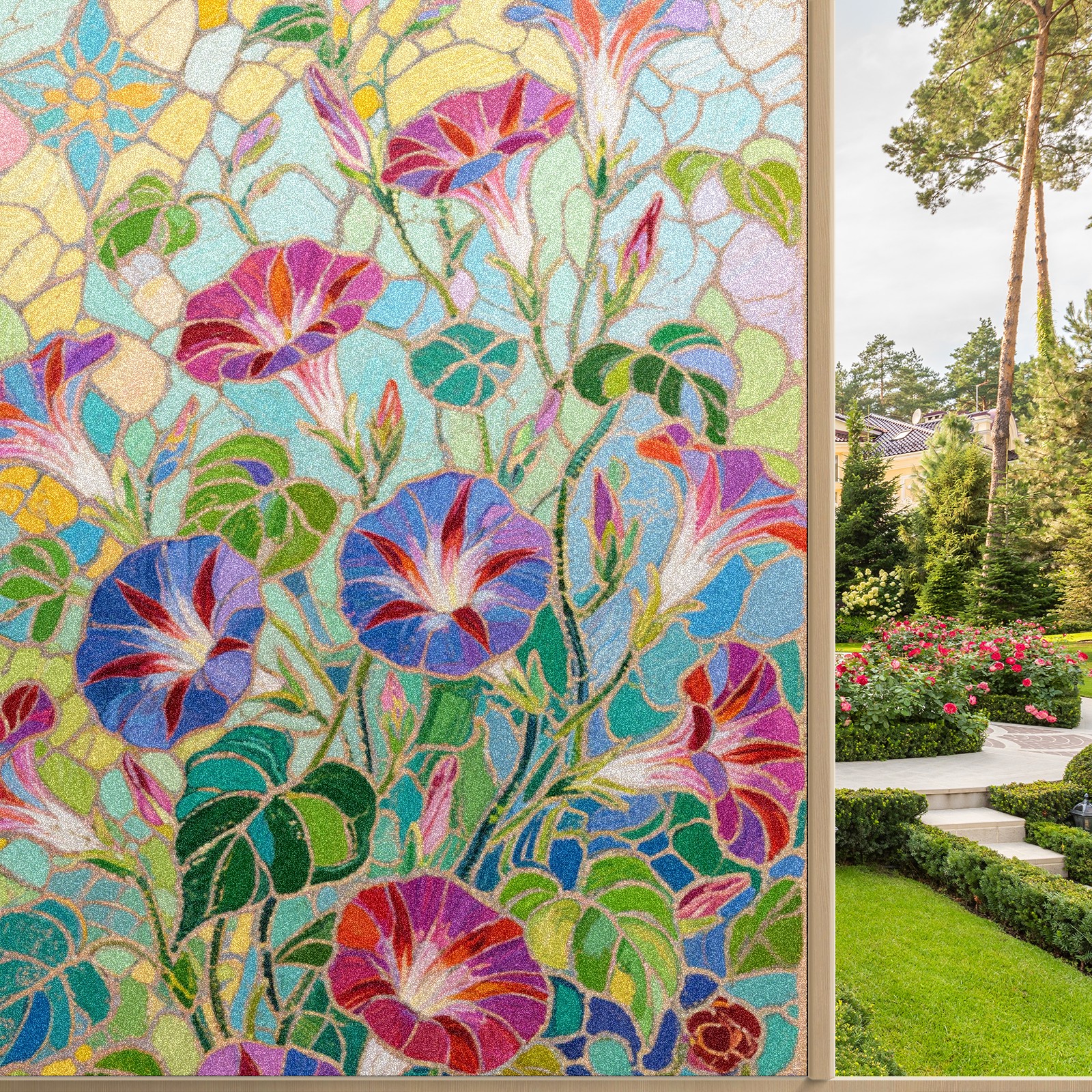 Single sided frosted full screen printed glass sticker soft pink green stripe seamless embroidery pattern privacy decoration Impressionist Morning Glory (1)