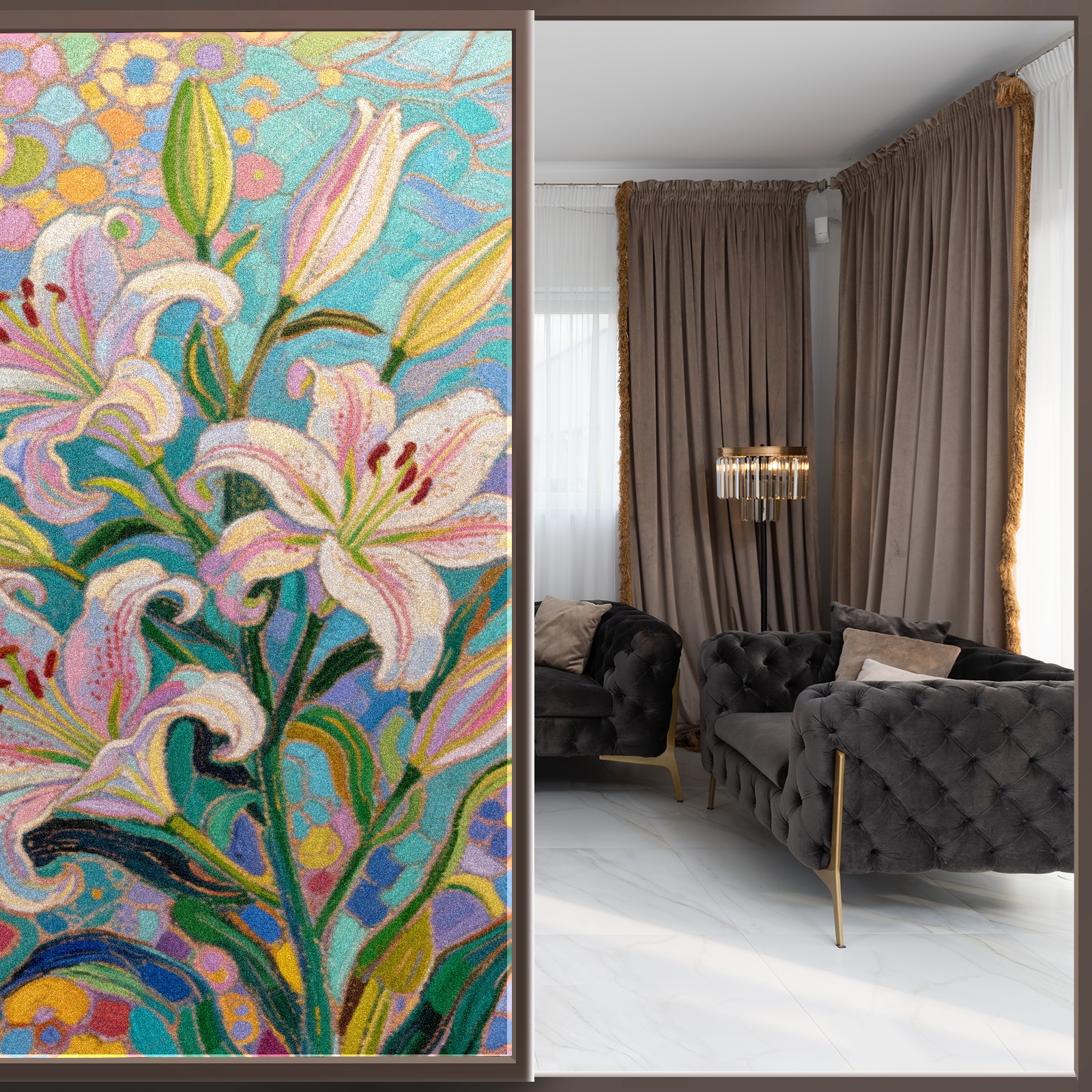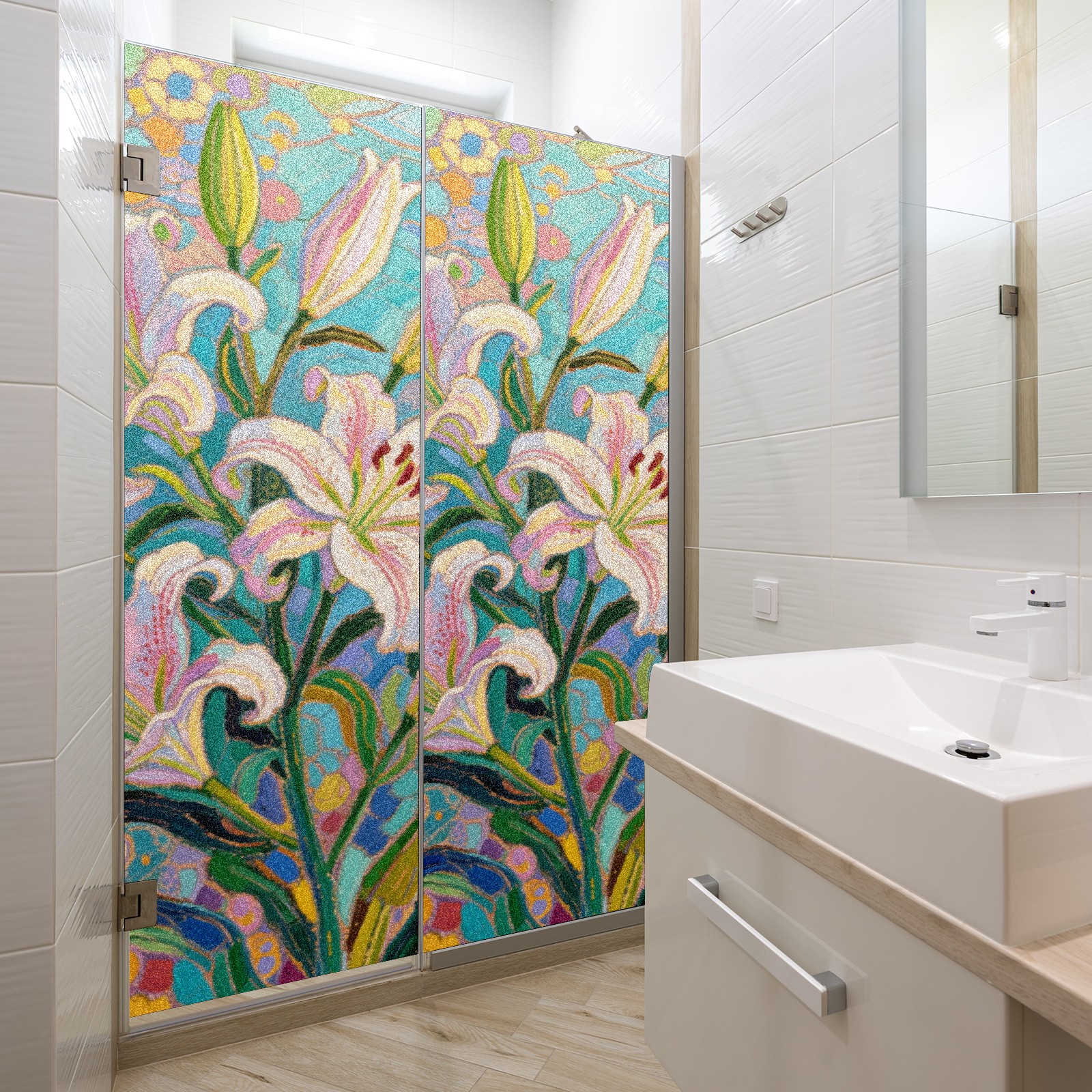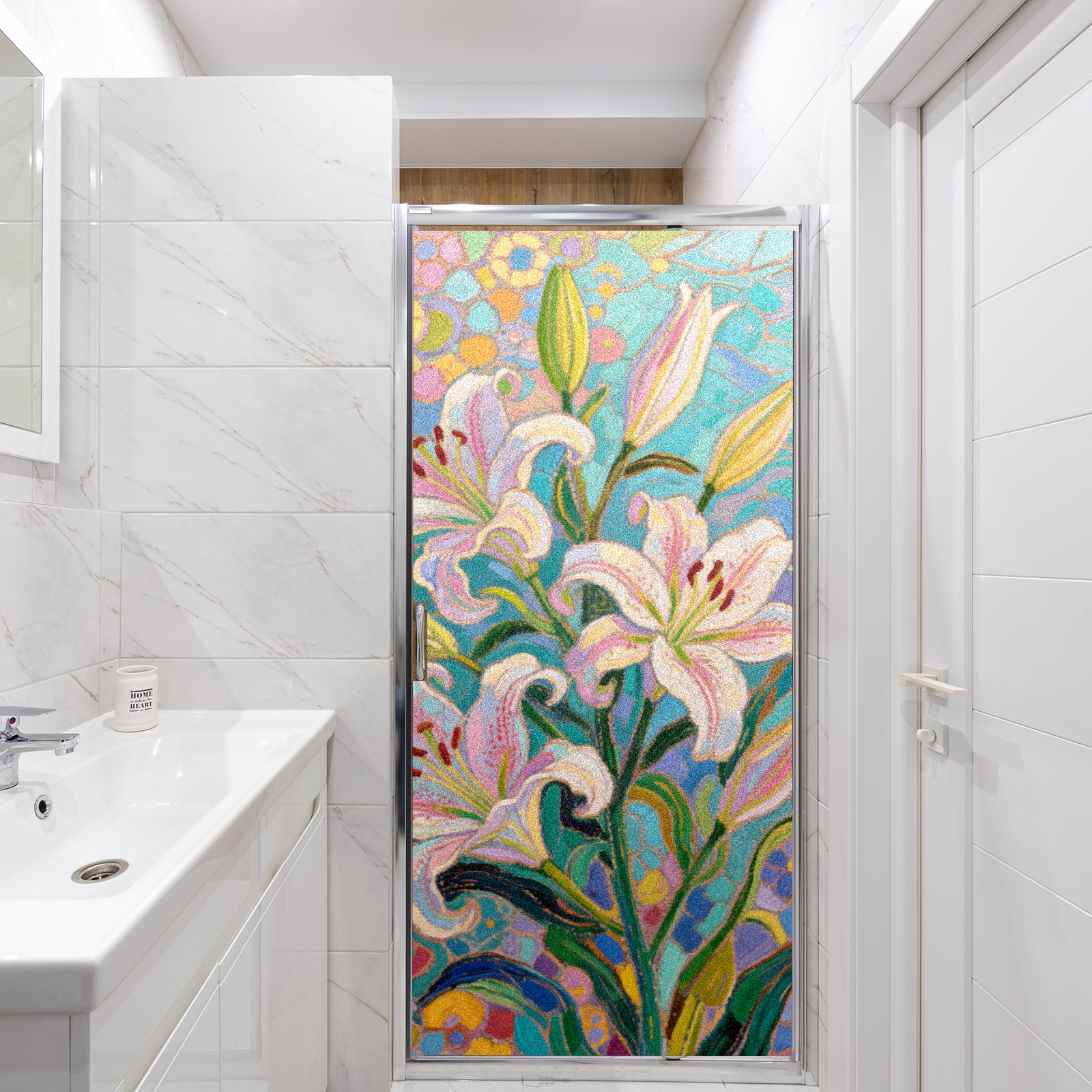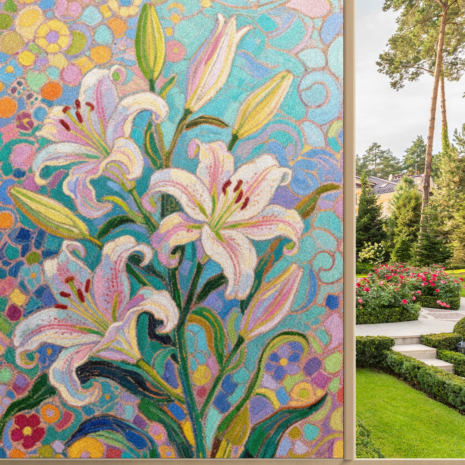Single sided frosted full screen printed glass sticker soft pink green stripe seamless embroidery pattern privacy decoration Impressionist Lily (2)