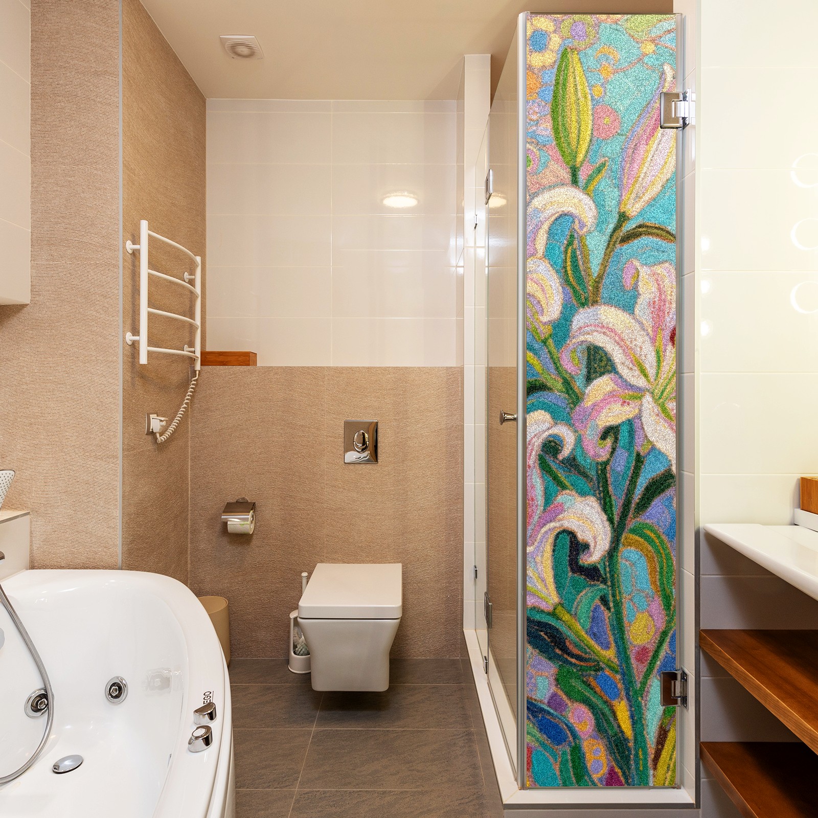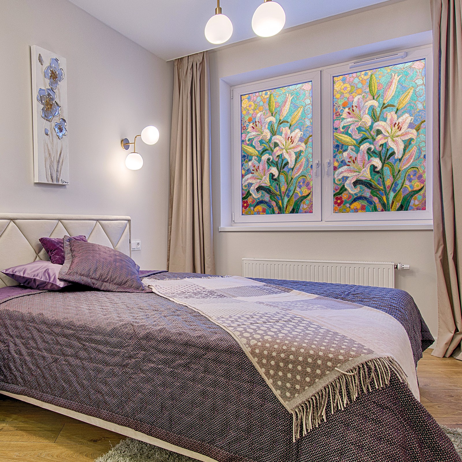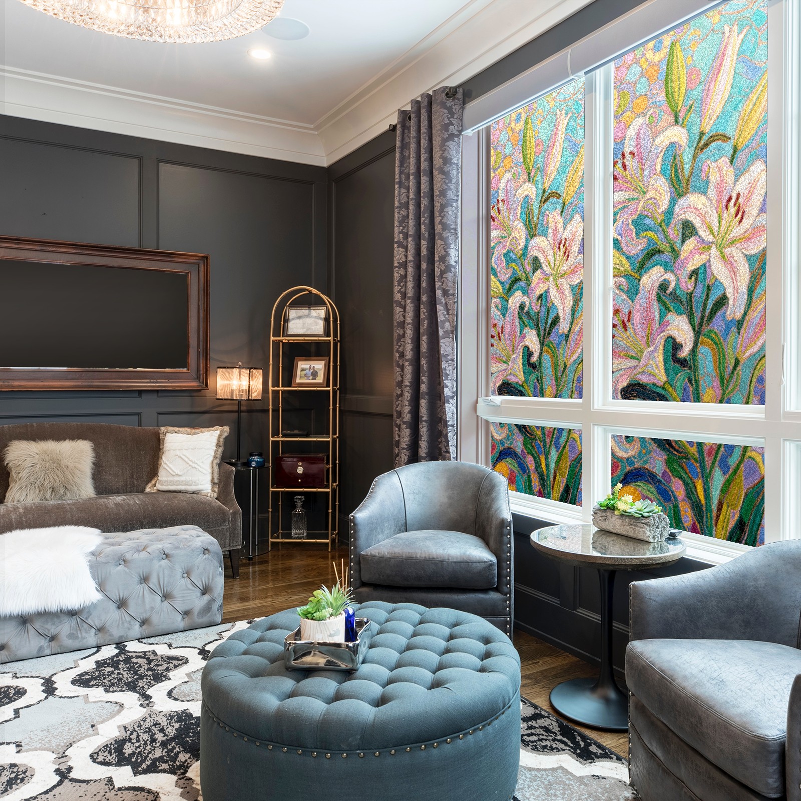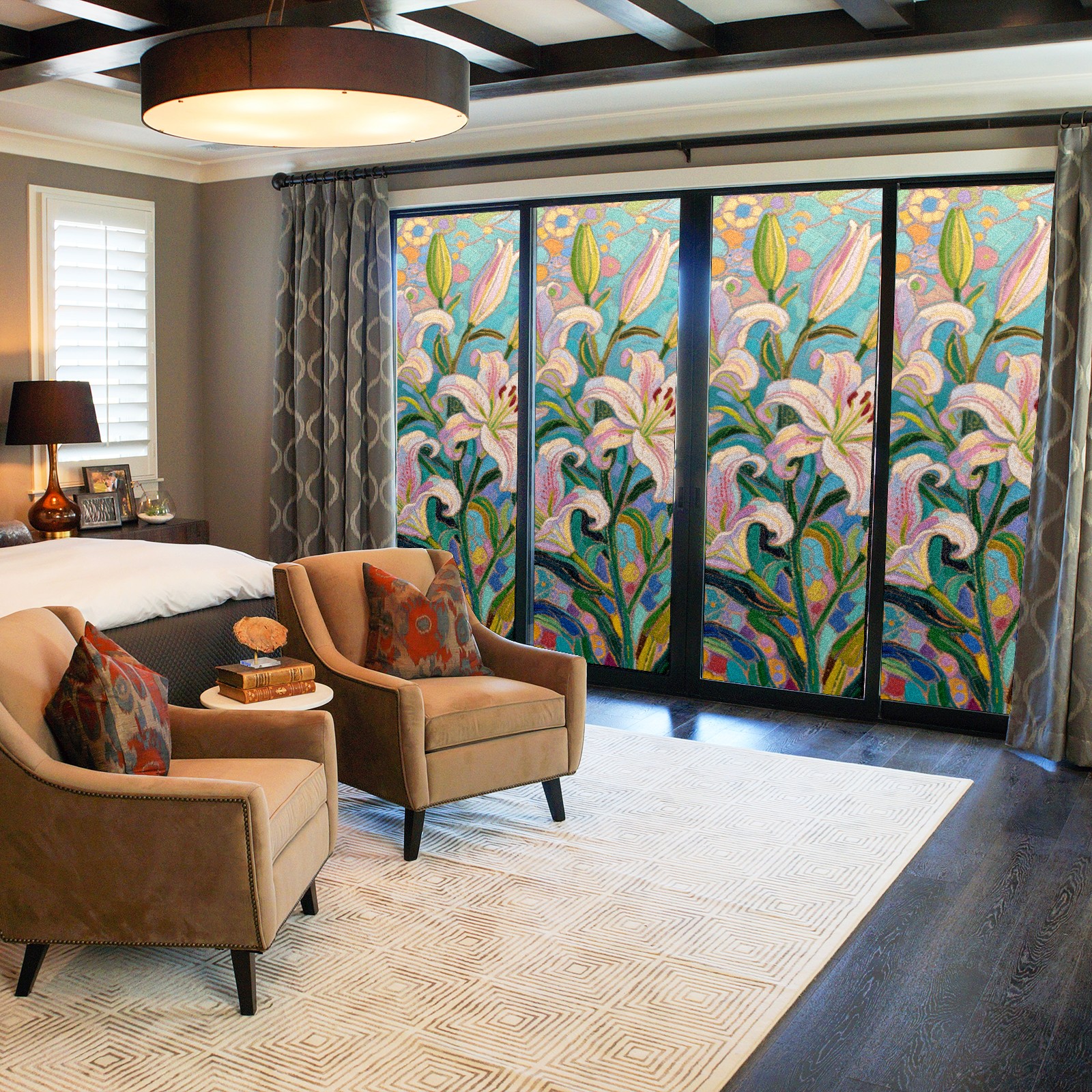 Single sided frosted full screen printed glass sticker soft pink green stripe seamless embroidery pattern privacy decoration Impressionist Lily (2)