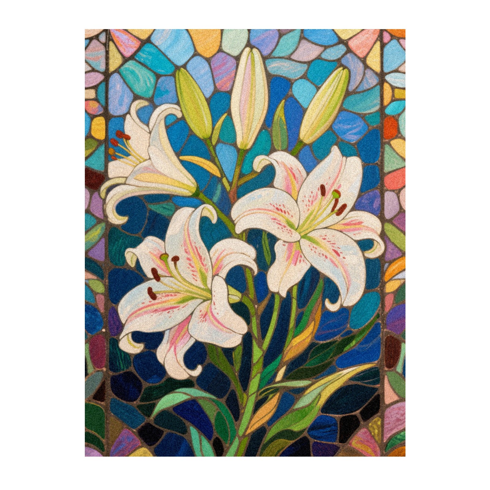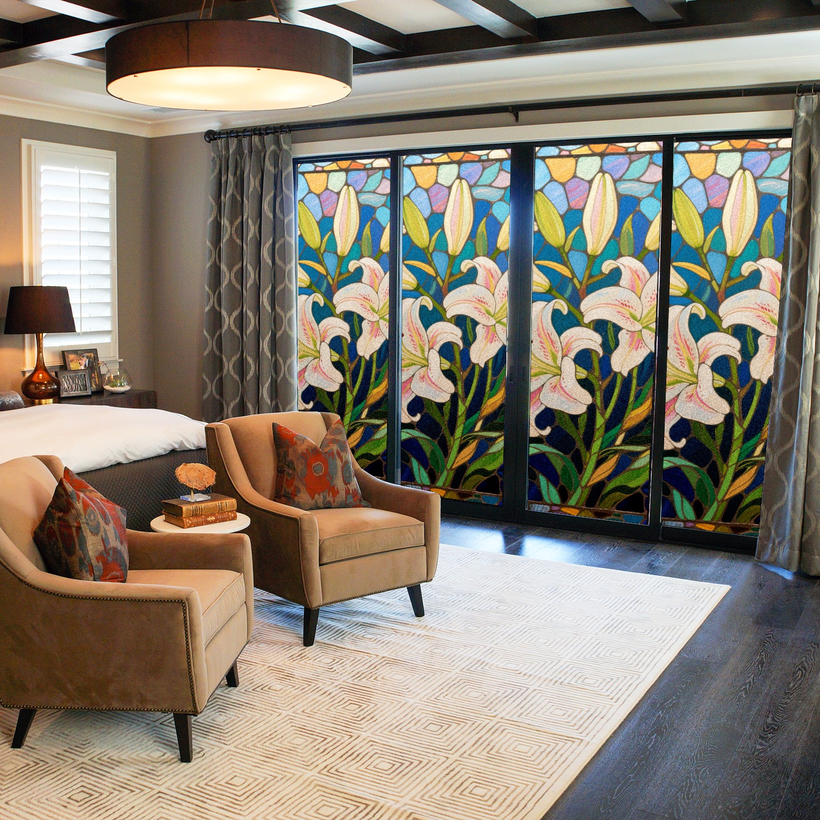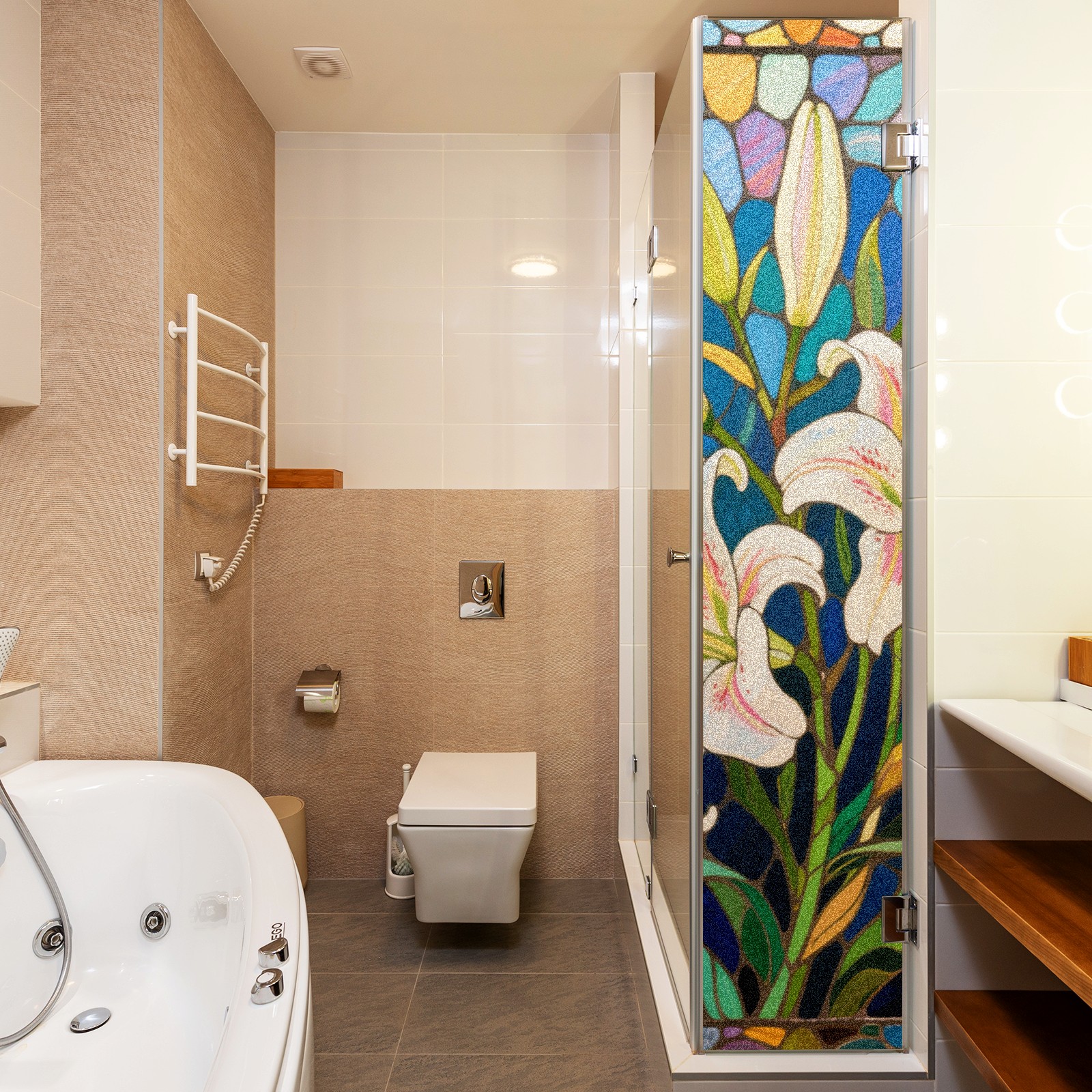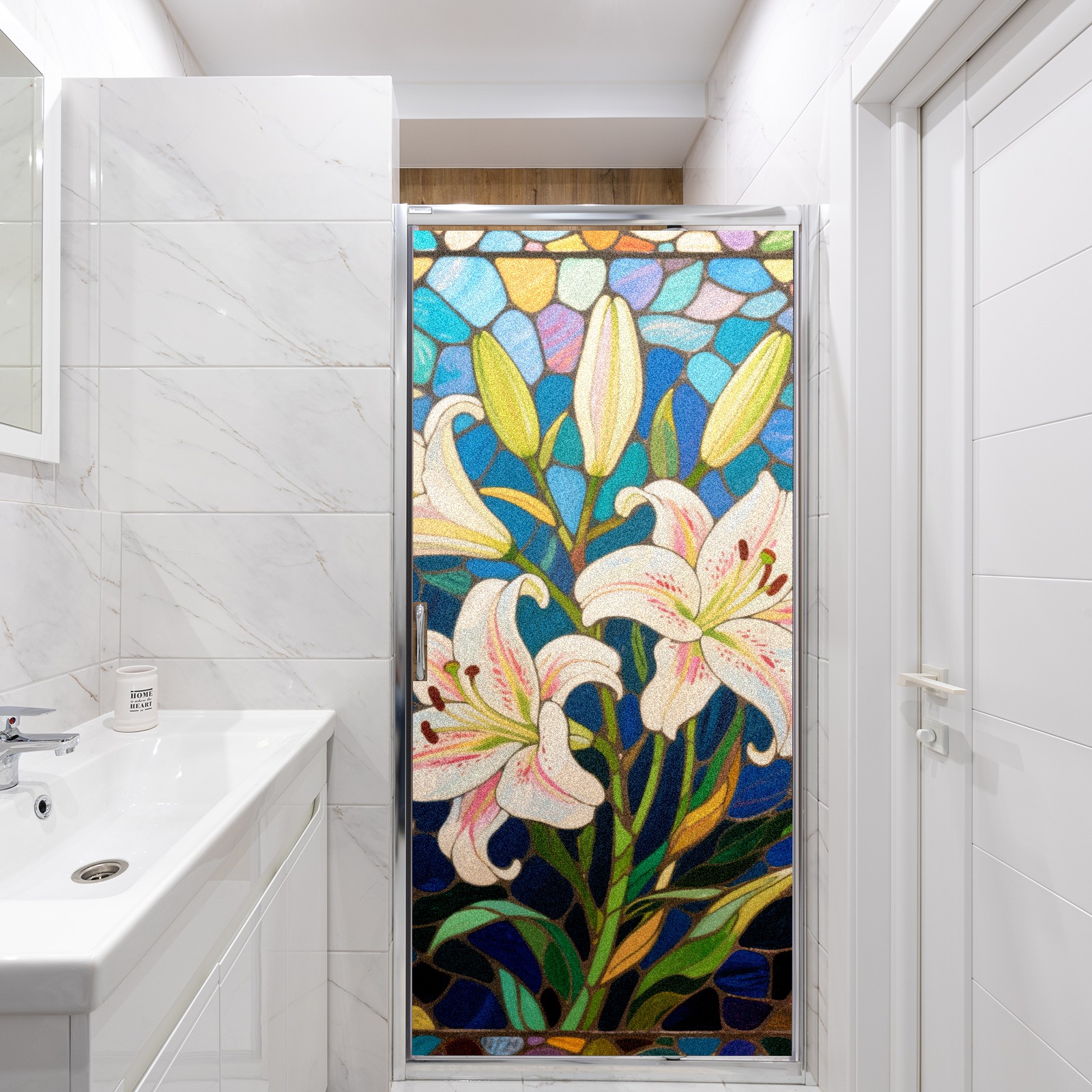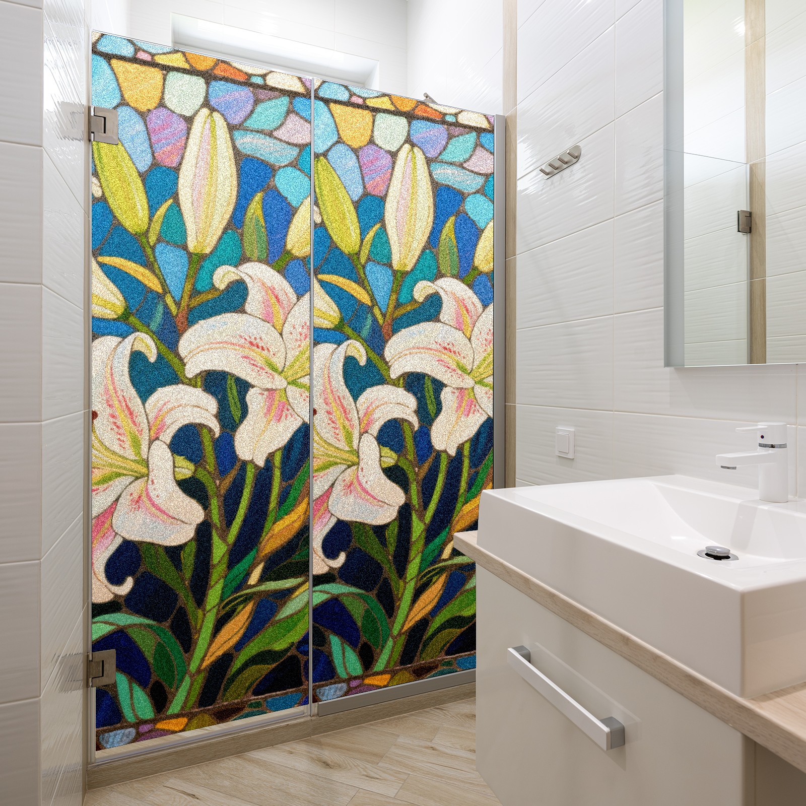 Single sided frosted full screen printed glass sticker soft pink green stripe seamless embroidery pattern privacy decoration Impressionist Lily (1)