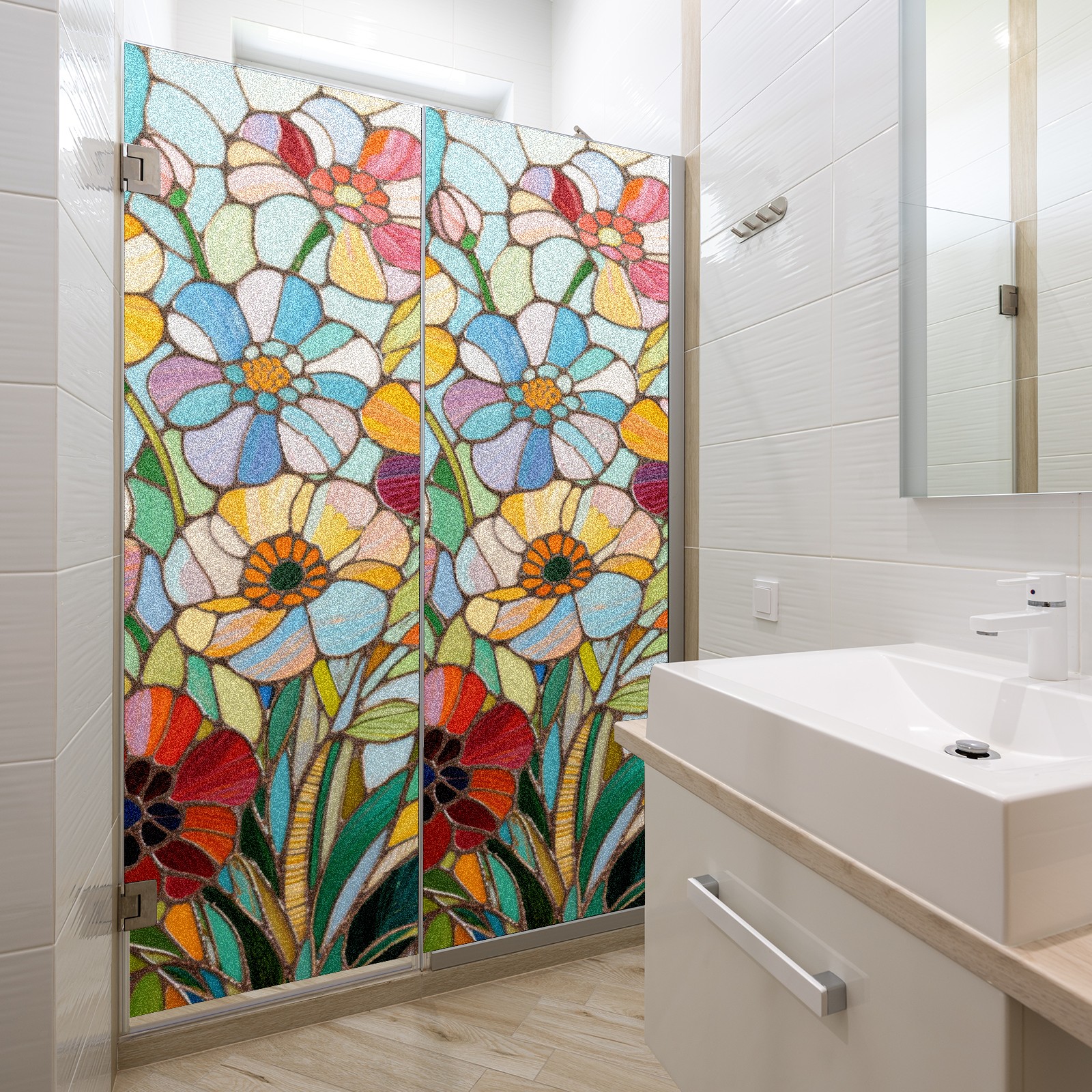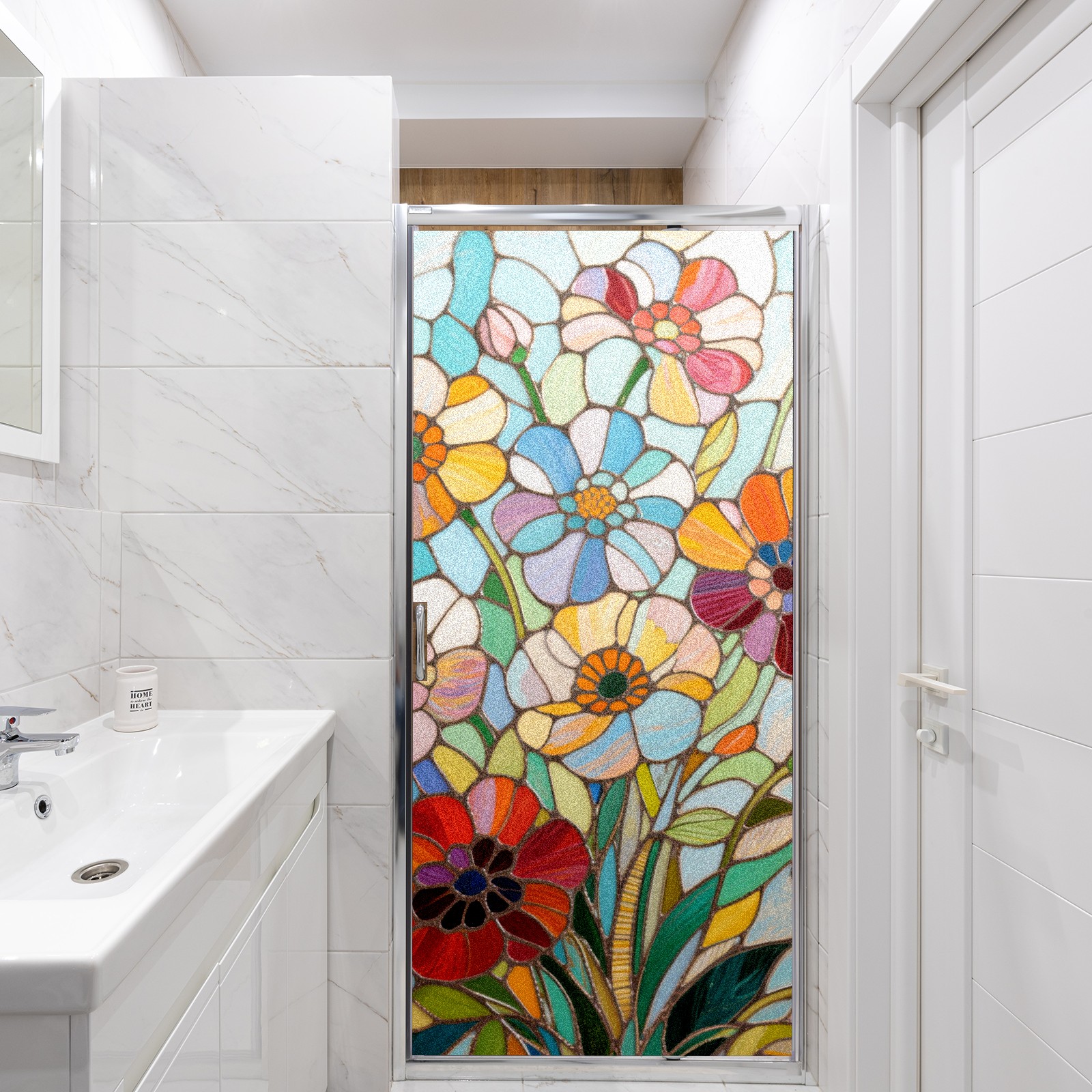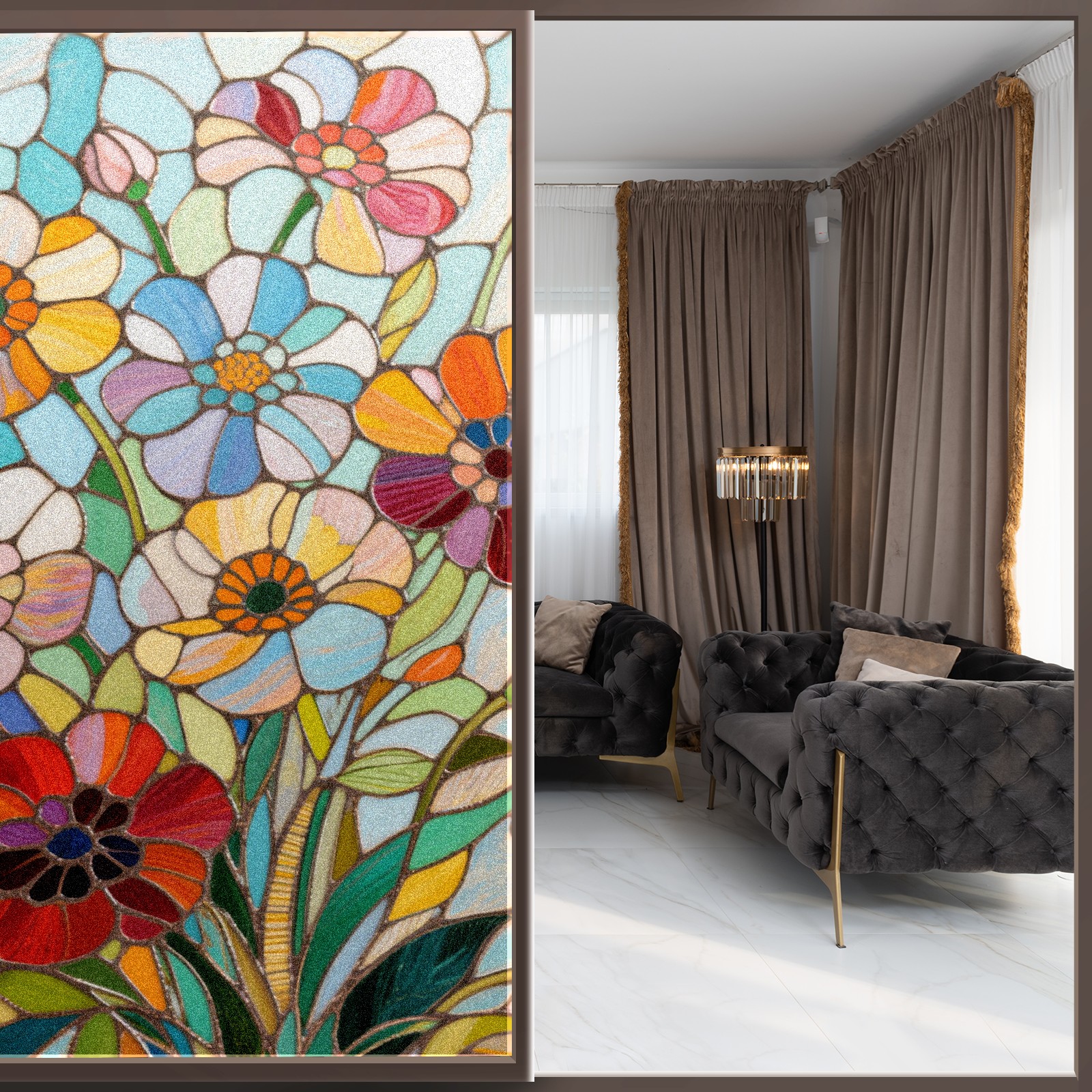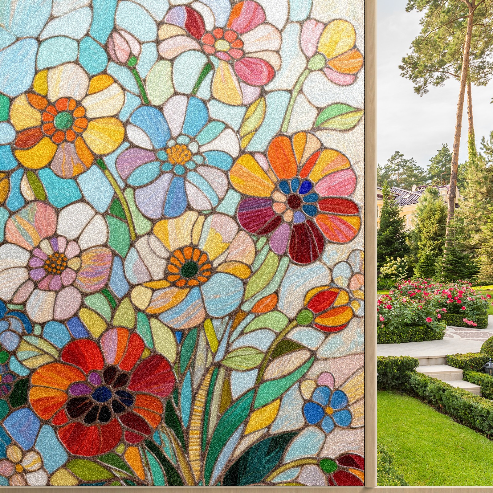 Single sided frosted full screen printed glass sticker soft pink green stripe seamless embroidery pattern privacy decoration Impressionist Flowers (3)