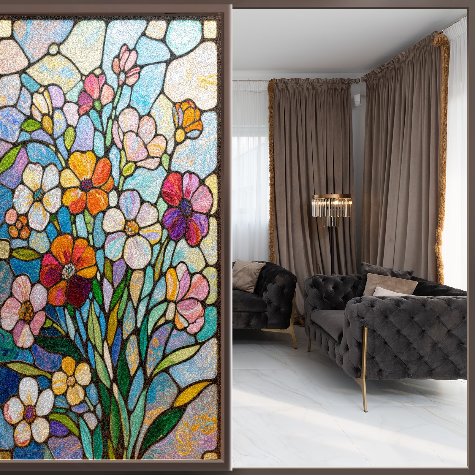 <p>Our film is made of food-grade PET material, safe and odorless, mother and baby families can rest assured that the use of explosion-proof impact resistance more peace of mind. High-definition full-sheet printing, delicate pattern does not fade, easy to enhance the tone of the home, suitable for a variety of decorative styles. Single-sided frosted design, effective protection of privacy, clear view during the day, night anti-peeping without embarrassment. Electrostatic adsorption installation, glue-free without leaving marks, can be repeatedly adjusted for use. It can also block ultraviolet rays, sunscreen insulation, protect furniture from fading, energy saving and more comfortable!&nbsp;&nbsp;</p>