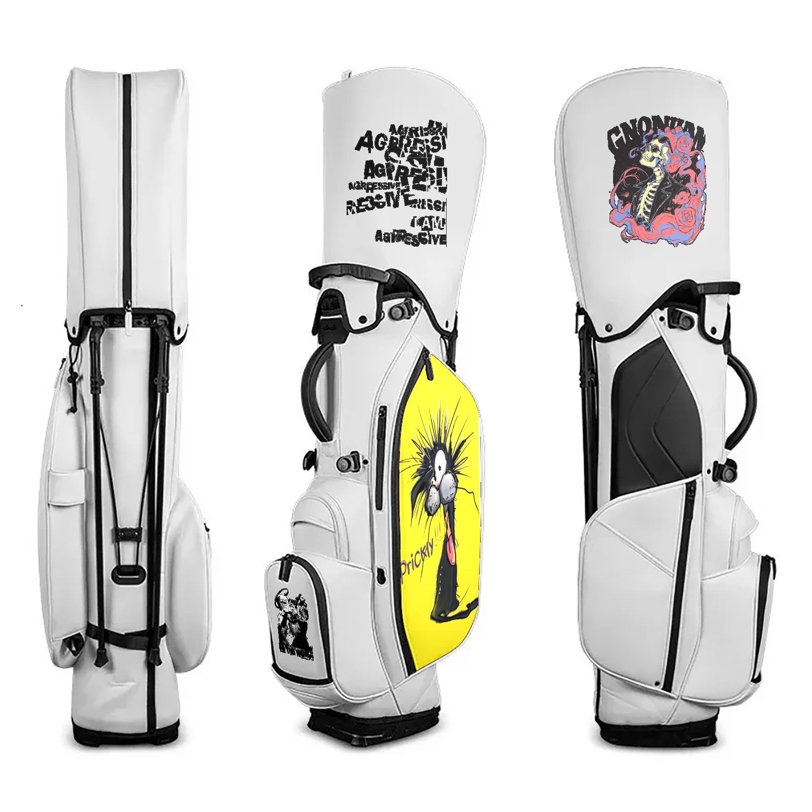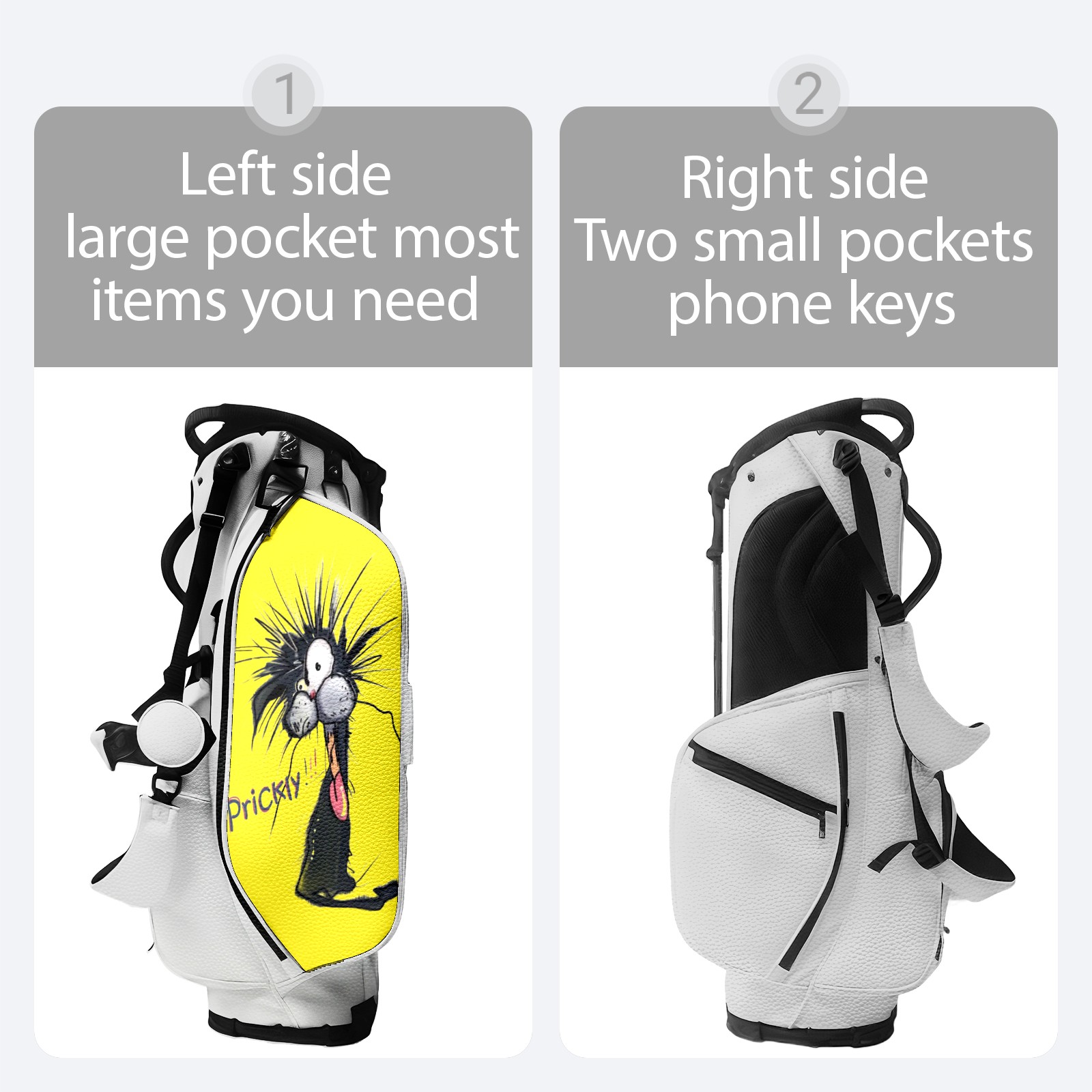 • <p>The Golf Stand Bag, designed specifically for golf enthusiasts, offers a choice of 5 - way and 14 - way top dividers. Its 5/14 - compartment design with independent full - size club compartments safeguards clubs from collisions. Equipped with a rain cover, waterproof zippered pockets (tested to resist moderate to heavy rain), and a high - performance cooler pouch that can keep drinks cold for hours, it ensures a convenient golfing experience. The bag features thickened, breathable neoprene shoulder straps and an adjustable chest buckle, reducing shoulder fatigue by 35% compared to regular bags, and its automatic aluminum alloy stand provides stable support on various terrains. Crafted from top - tier, water - resistant litchi - grain PU leather, with double - stitched edges, reliable zippers tested for over 15,000 cycles, and anti - abrasion bottom studs, it guarantees durability. You can personalize it with embroidery on the front pocket and rain cover side (15*15cm area), and it comes in classic black and white, with a matte finish and litchi - grain texture that combines business and leisure styles. Measuring 130 cm in height, 37 cm in width, and 31 cm in depth (including rain cover) and 90 cm x 31 cm x 37 cm (excluding rain cover), it strikes a balance between storage and portability, capable of holding 14 standard - sized clubs and other essentials, and it also includes a dust cover. It's truly the perfect choice for golfers.<br></p>