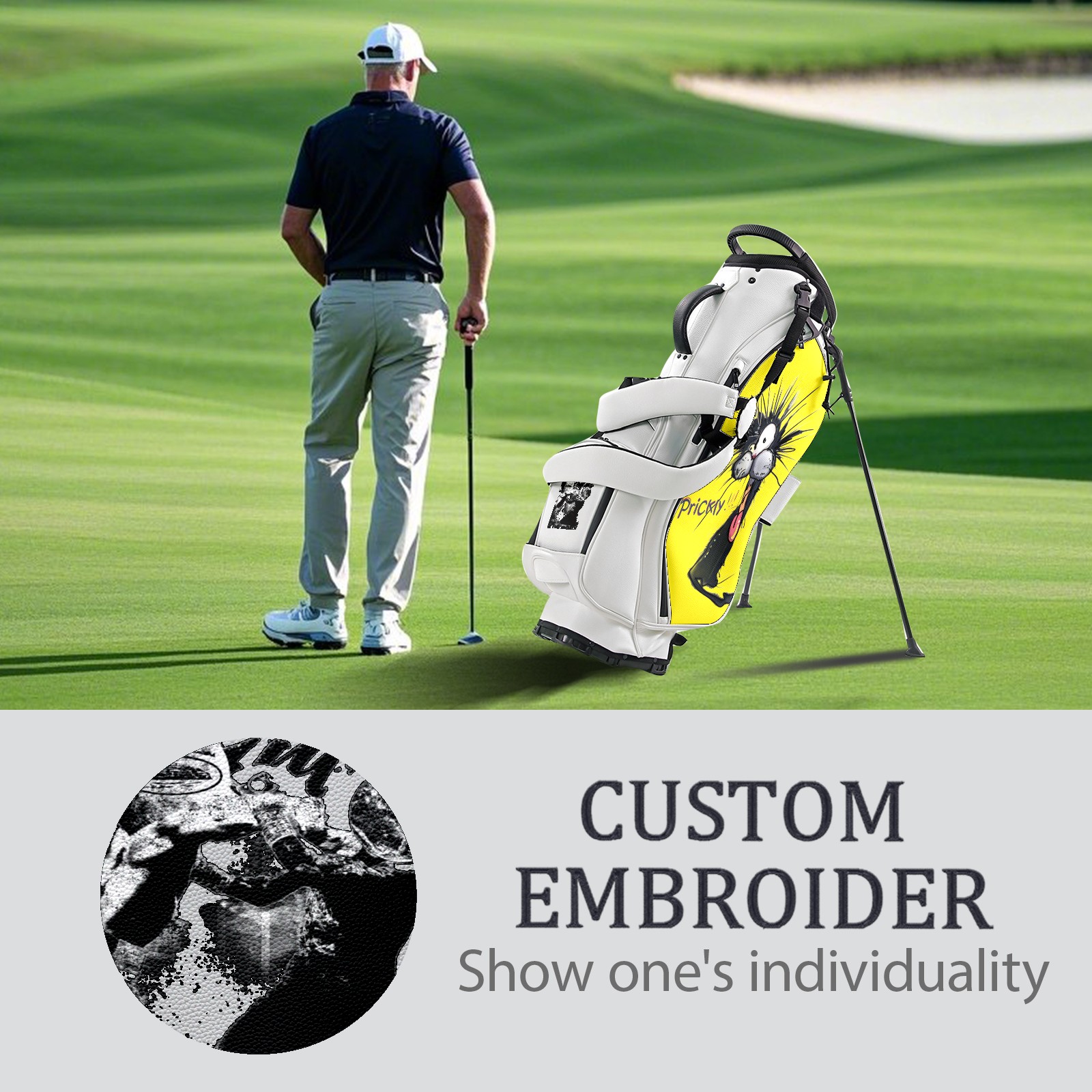 <p>The Golf Stand Bag, designed specifically for golf enthusiasts, offers a choice of 5 - way and 14 - way top dividers. Its 5/14 - compartment design with independent full - size club compartments safeguards clubs from collisions. Equipped with a rain cover, waterproof zippered pockets (tested to resist moderate to heavy rain), and a high - performance cooler pouch that can keep drinks cold for hours, it ensures a convenient golfing experience. The bag features thickened, breathable neoprene shoulder straps and an adjustable chest buckle, reducing shoulder fatigue by 35% compared to regular bags, and its automatic aluminum alloy stand provides stable support on various terrains. Crafted from top - tier, water - resistant litchi - grain PU leather, with double - stitched edges, reliable zippers tested for over 15,000 cycles, and anti - abrasion bottom studs, it guarantees durability. You can personalize it with embroidery on the front pocket and rain cover side (15*15cm area), and it comes in classic black and white, with a matte finish and litchi - grain texture that combines business and leisure styles. Measuring 130 cm in height, 37 cm in width, and 31 cm in depth (including rain cover) and 90 cm x 31 cm x 37 cm (excluding rain cover), it strikes a balance between storage and portability, capable of holding 14 standard - sized clubs and other essentials, and it also includes a dust cover. It's truly the perfect choice for golfers.<br></p>