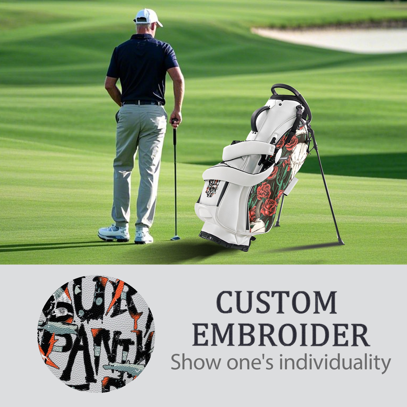 <p>The Golf Stand Bag, designed specifically for golf enthusiasts, offers a choice of 5 - way and 14 - way top dividers. Its 5/14 - compartment design with independent full - size club compartments safeguards clubs from collisions. Equipped with a rain cover, waterproof zippered pockets (tested to resist moderate to heavy rain), and a high - performance cooler pouch that can keep drinks cold for hours, it ensures a convenient golfing experience. The bag features thickened, breathable neoprene shoulder straps and an adjustable chest buckle, reducing shoulder fatigue by 35% compared to regular bags, and its automatic aluminum alloy stand provides stable support on various terrains. Crafted from top - tier, water - resistant litchi - grain PU leather, with double - stitched edges, reliable zippers tested for over 15,000 cycles, and anti - abrasion bottom studs, it guarantees durability. You can personalize it with embroidery on the front pocket and rain cover side (15*15cm area), and it comes in classic black and white, with a matte finish and litchi - grain texture that combines business and leisure styles. Measuring 130 cm in height, 37 cm in width, and 31 cm in depth (including rain cover) and 90 cm x 31 cm x 37 cm (excluding rain cover), it strikes a balance between storage and portability, capable of holding 14 standard - sized clubs and other essentials, and it also includes a dust cover. It's truly the perfect choice for golfers.<br></p>