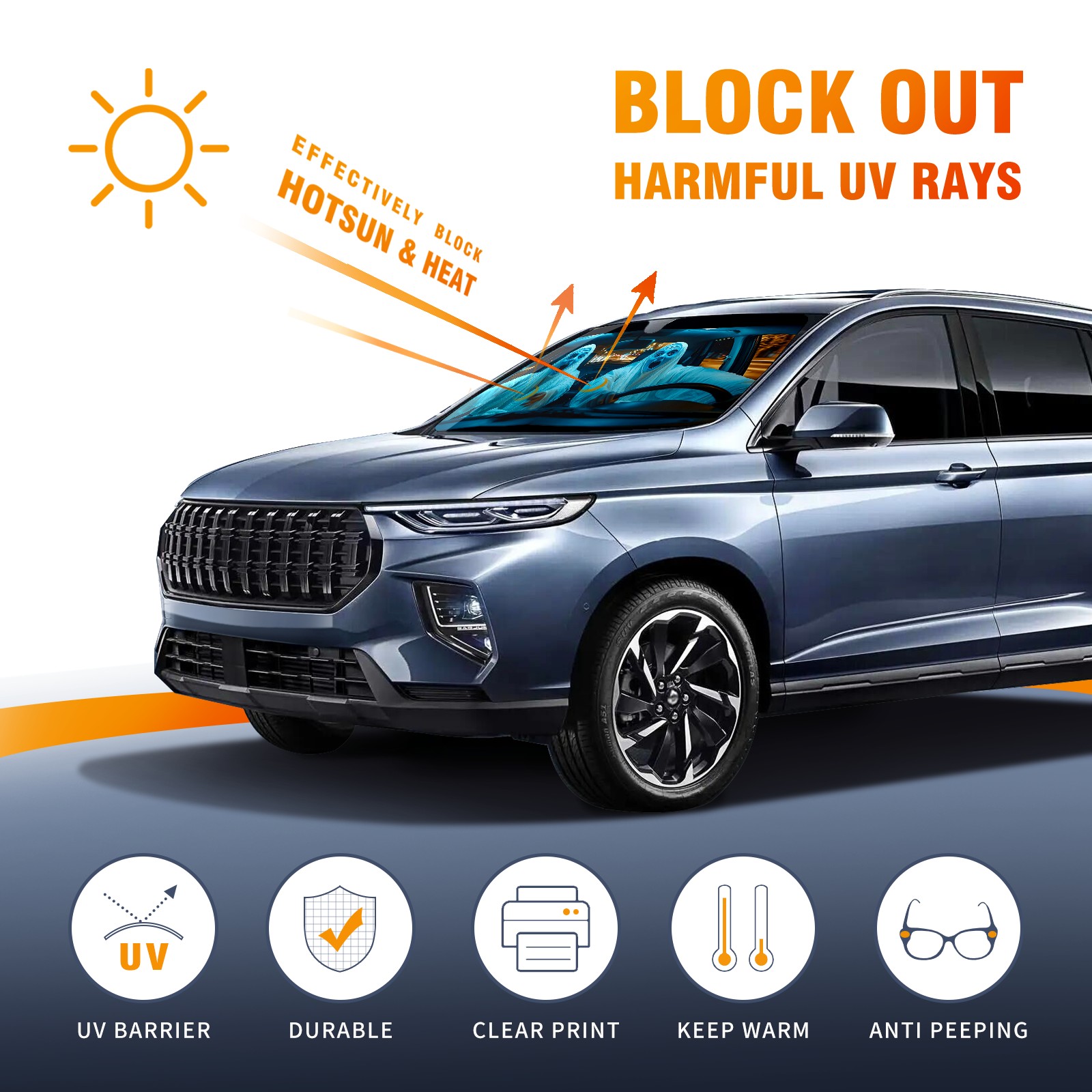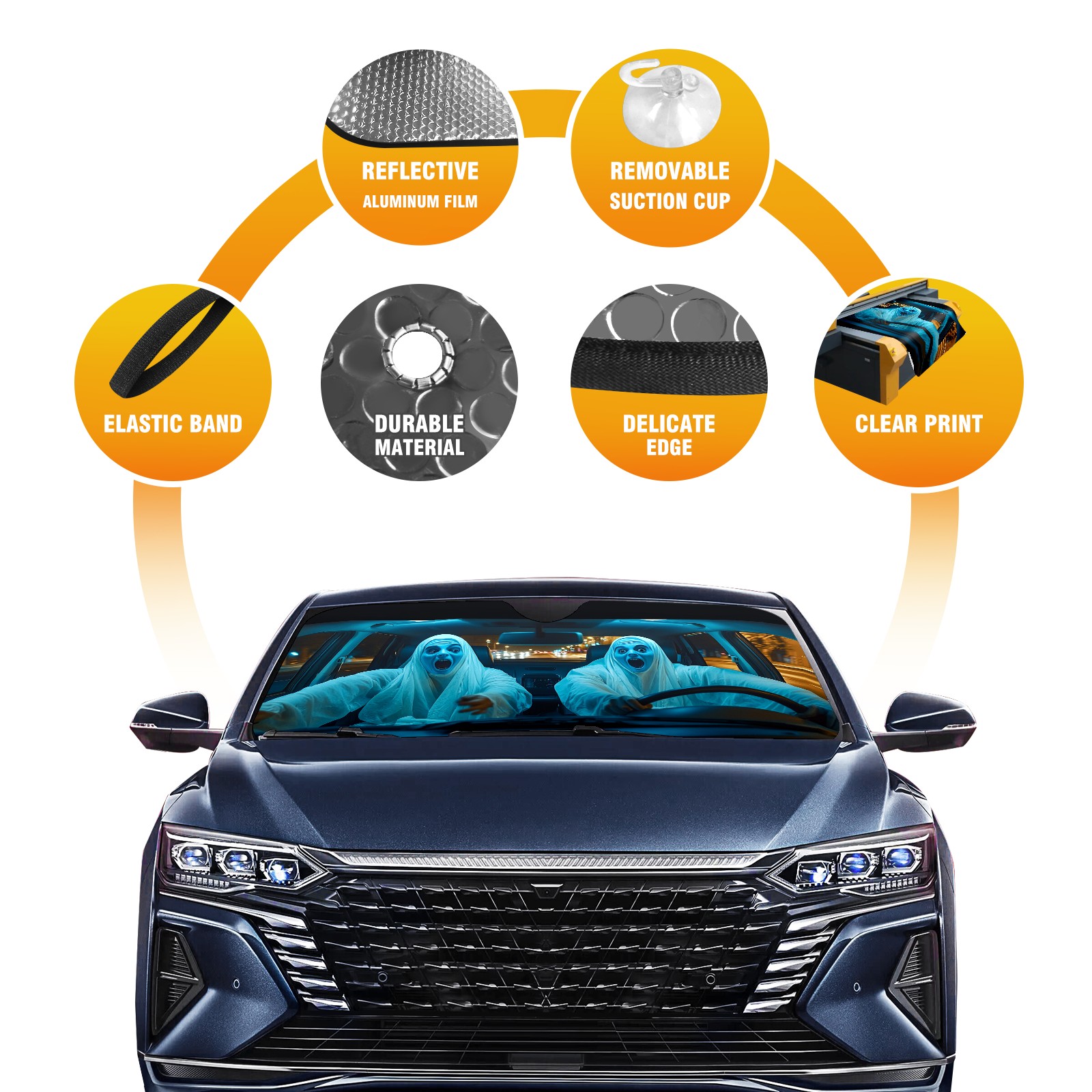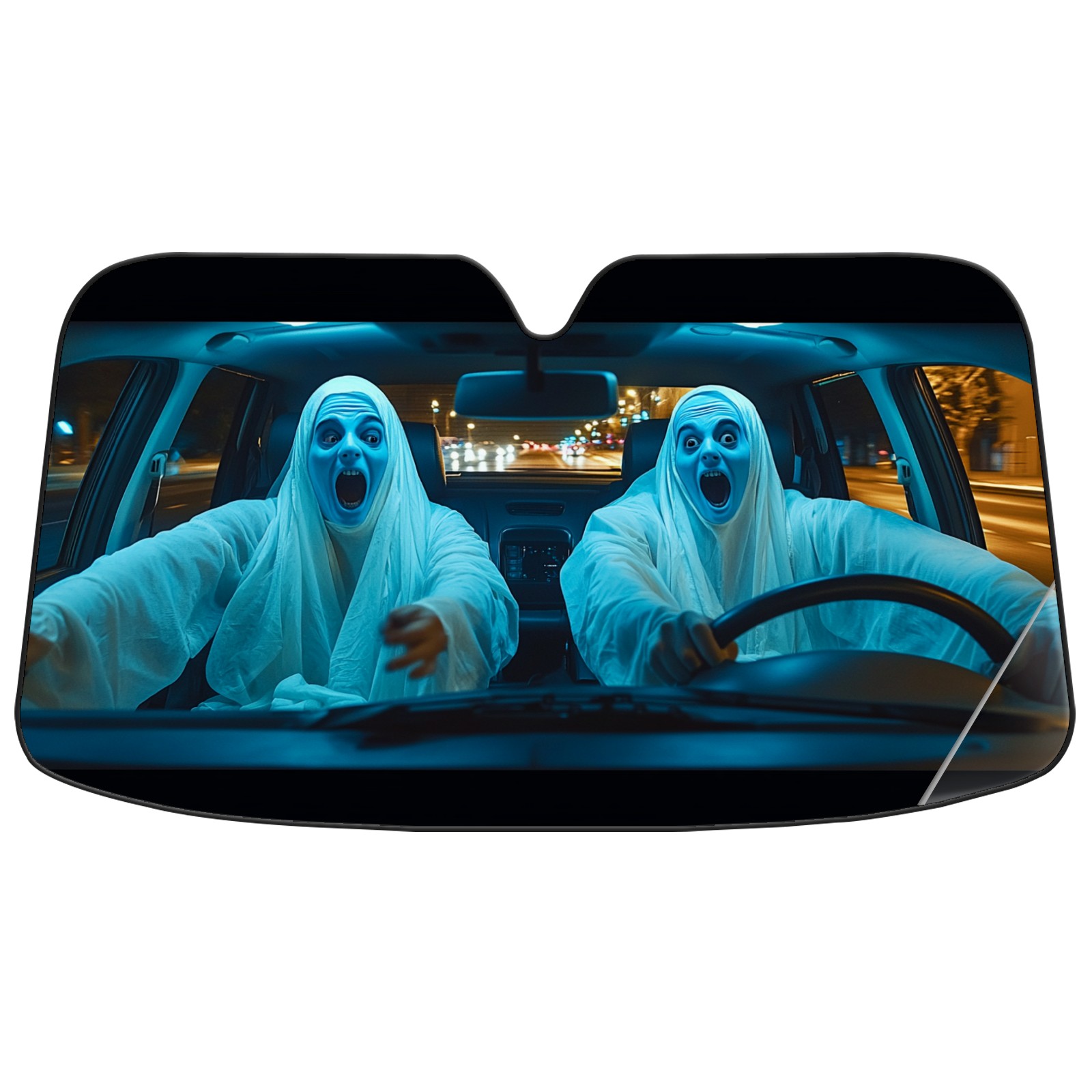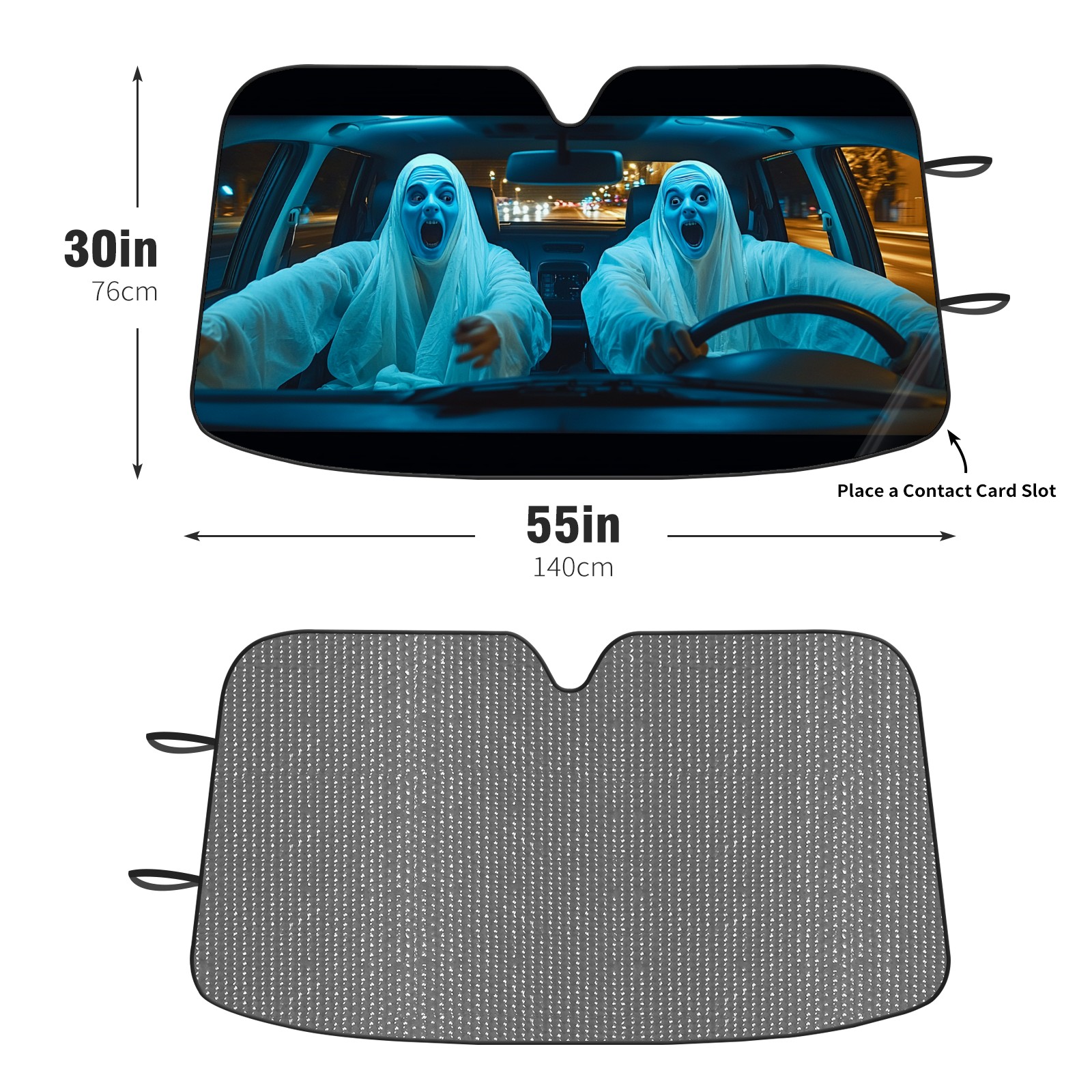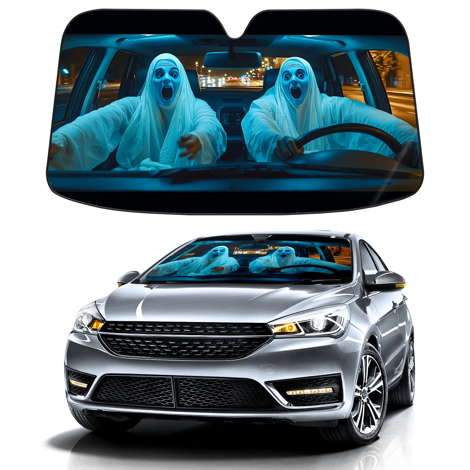 Car Windshield Sun Shade Foldable-Universal Fit Sunshade for Front Windows, UV Protection Heat Shield for Most Vehicles (55x30in)-Sun Visor Extender, Dashboard Cover(Two Ghosts Driving)