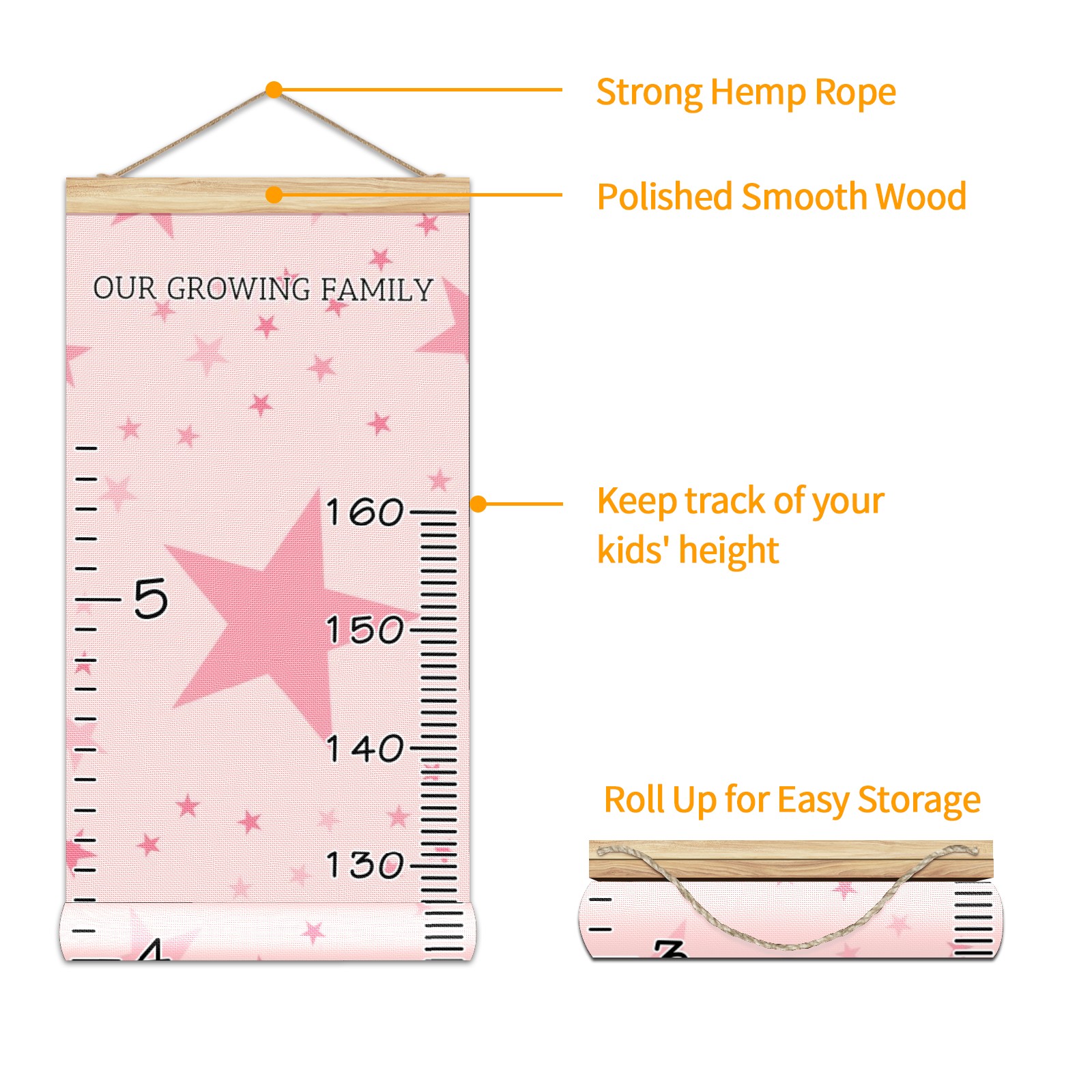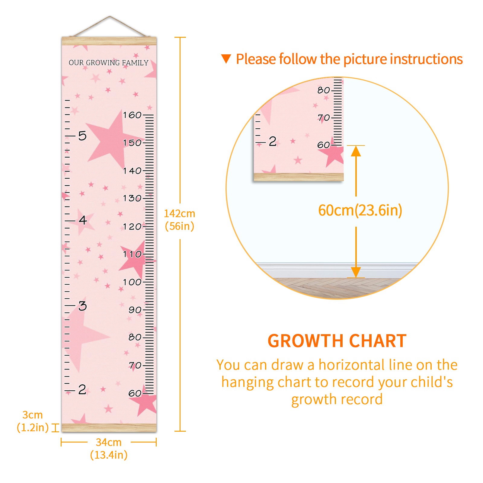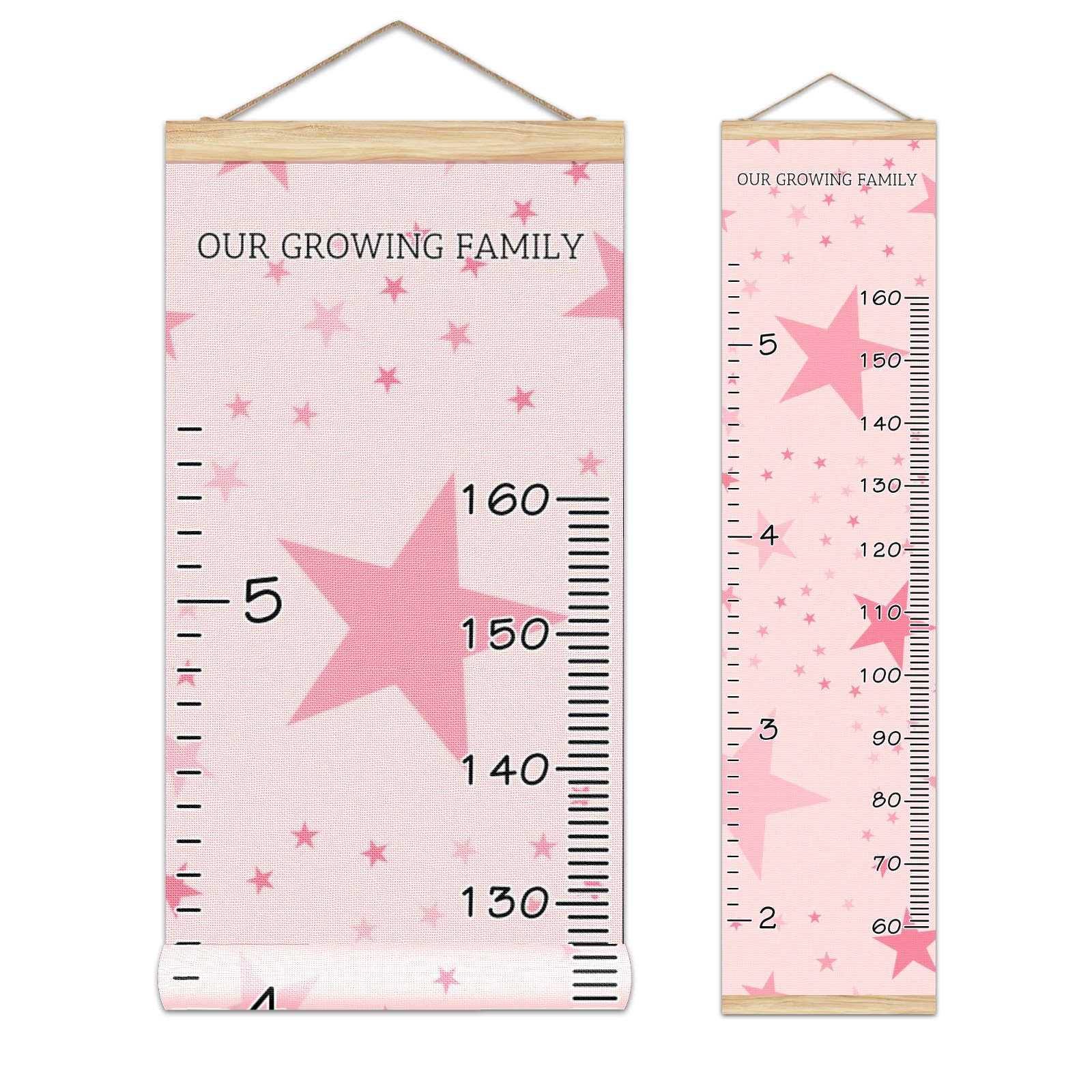 Personalized Kids Name Growth Chart Ruler for Wall Wood Frame Canvas Height Measure Chart 13.4x56 in Hanging Growth Chart Pink Stars5.26 Boys Girls Room Decor