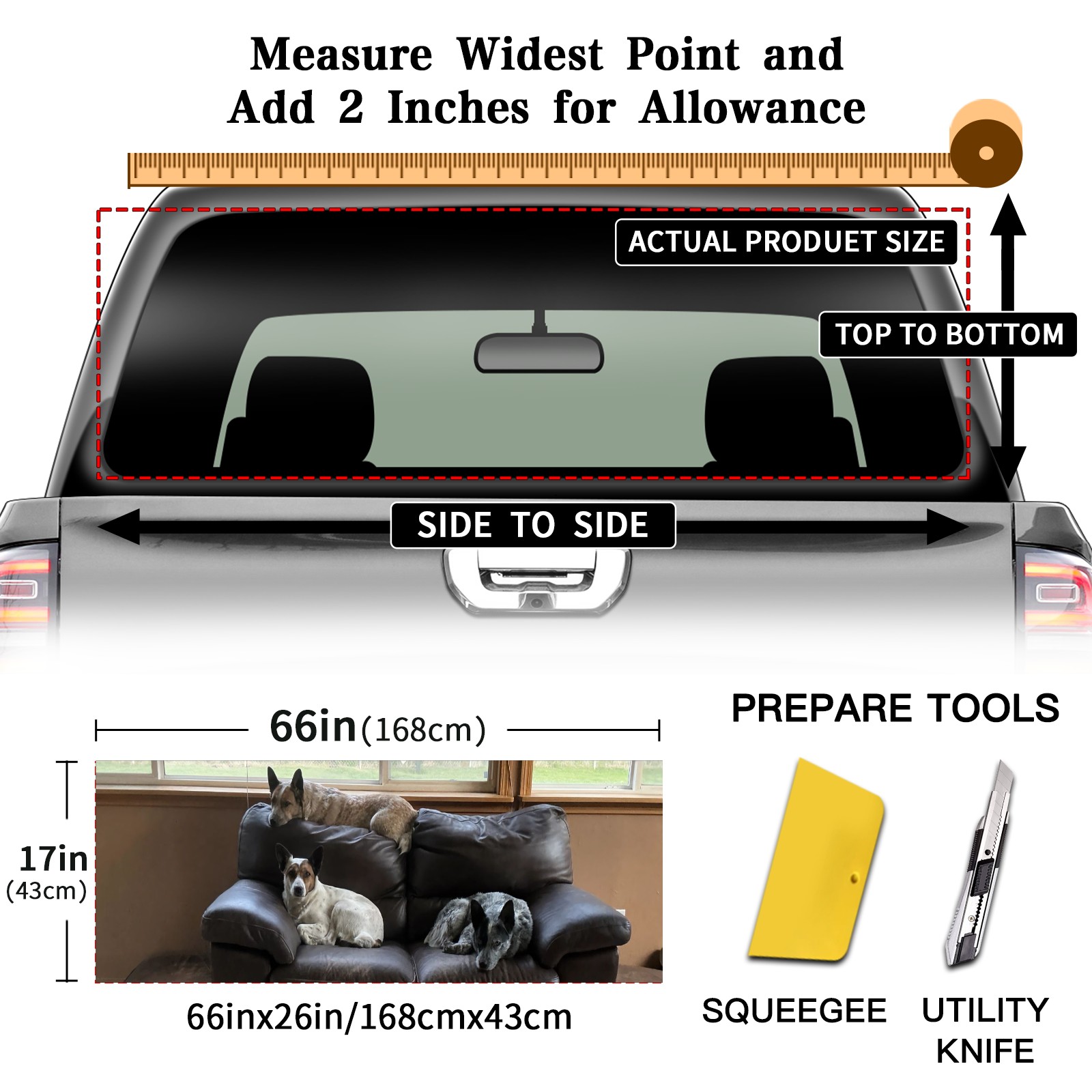 <p><strong>Truck Rear Window Graphics Decals Pickup Trucks Back Window Film Stickers 66" x 22" Perforated Vinyl Wrap Stickers Decorations for Car Rear Window</strong></p><p><strong><br /></strong></p><p><strong>Features :</strong></p><p>- Size of the rear window decals for trucks is 66x22 Inches (168x56cm).</p><p>- High quality perforated vinyl window film, one way vision sticker.</p><p>- Perforated is see through from the inside but not from outside.</p><p>- Clear printing, waterproof and durable.</p><p>- The car back window graphics stickers fits most truck and makes your vehicle more beautiful.&nbsp;</p><p><br /></p><p><strong>【Installation Instructions】</strong></p><p><strong>1. CLEAN SURFACE -</strong> Clean the rear window thoroughly and make sure the surface clean.</p><p><strong>2. STICK THE DECALS -</strong> Tear off the paper on the back and stick the decal on the window.</p><p><strong>3. SCRAPE OFF AIR BUBBLES -</strong> Use a squeegee or other card to scrape off the excess air bubbles.</p><p><strong>4. TRIM THE EXCESS -</strong> Use a knife to cut off the excess stickers of the window, finally complete.</p><p><br /></p><p>1. Please measure the size before purchasing, back window graphics decal for truck can be cut to your desired size.</p><p>2.The graphics stickers for truck back window is a great gift for yourself also can as a birthday / halloween / christmas gift for your friends and family.</p>