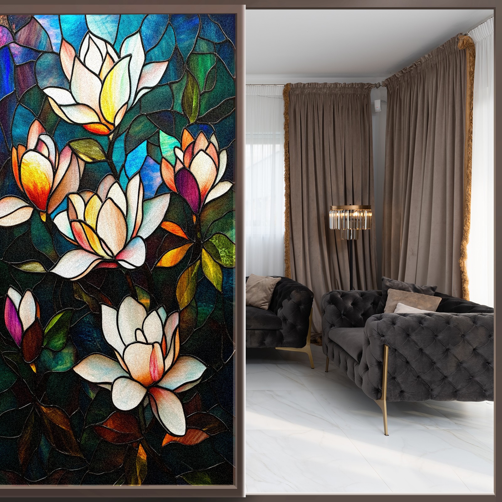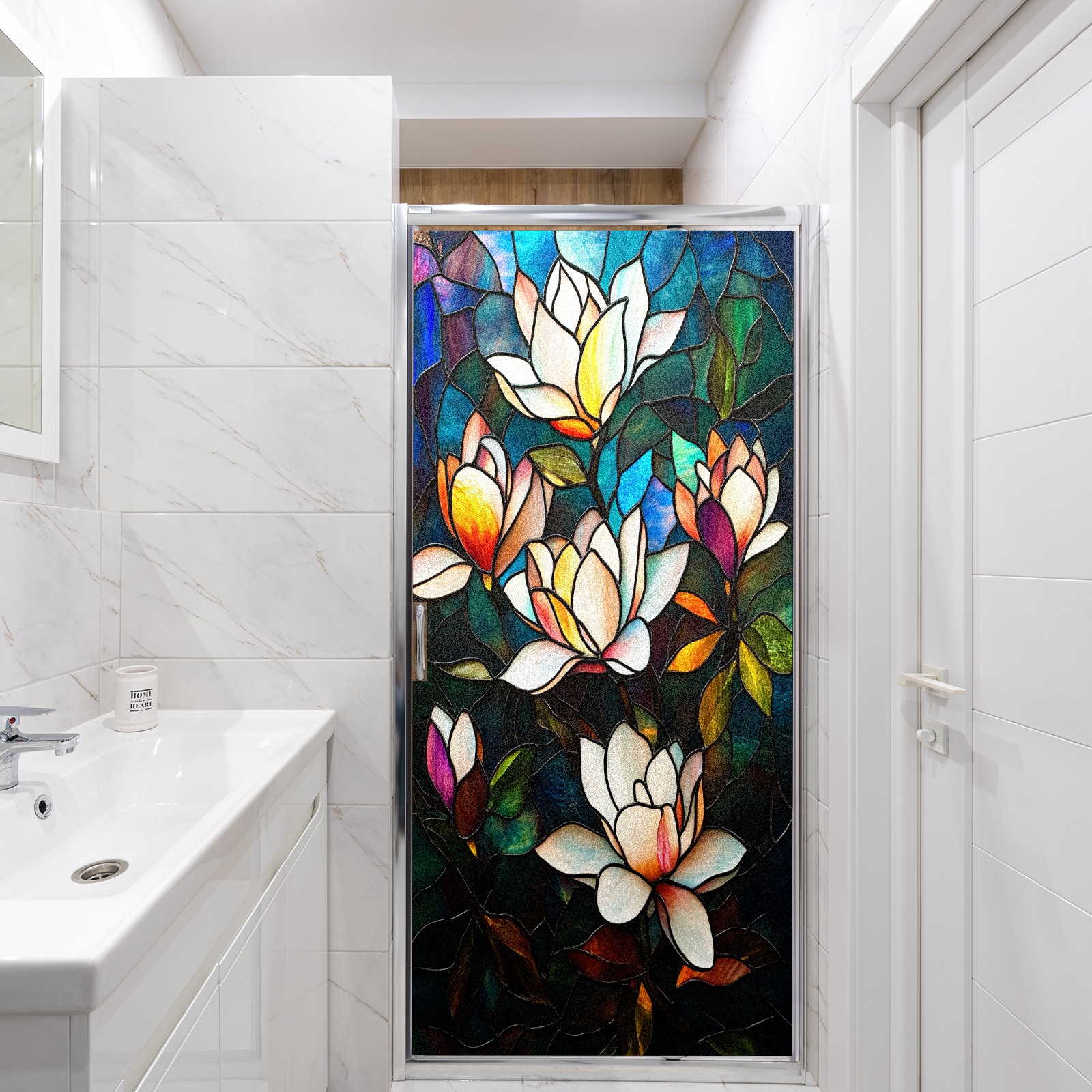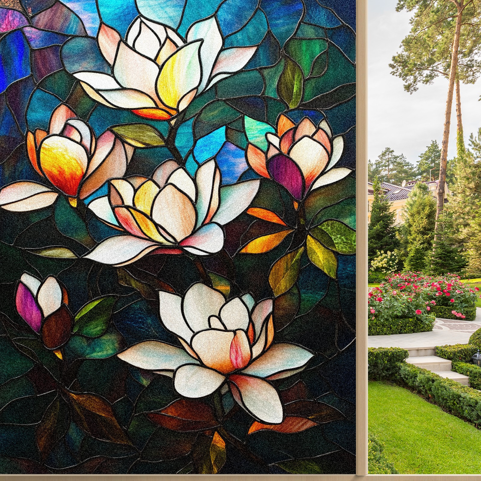 MSINMKOK Window Privacy Film Stained Glass Magnolia Flowers Decorative Frosted Glass Window Film for Glass Door Bathroom Window 17.7'' x 23.6'' Non-Adhesive Window Decals Stickers