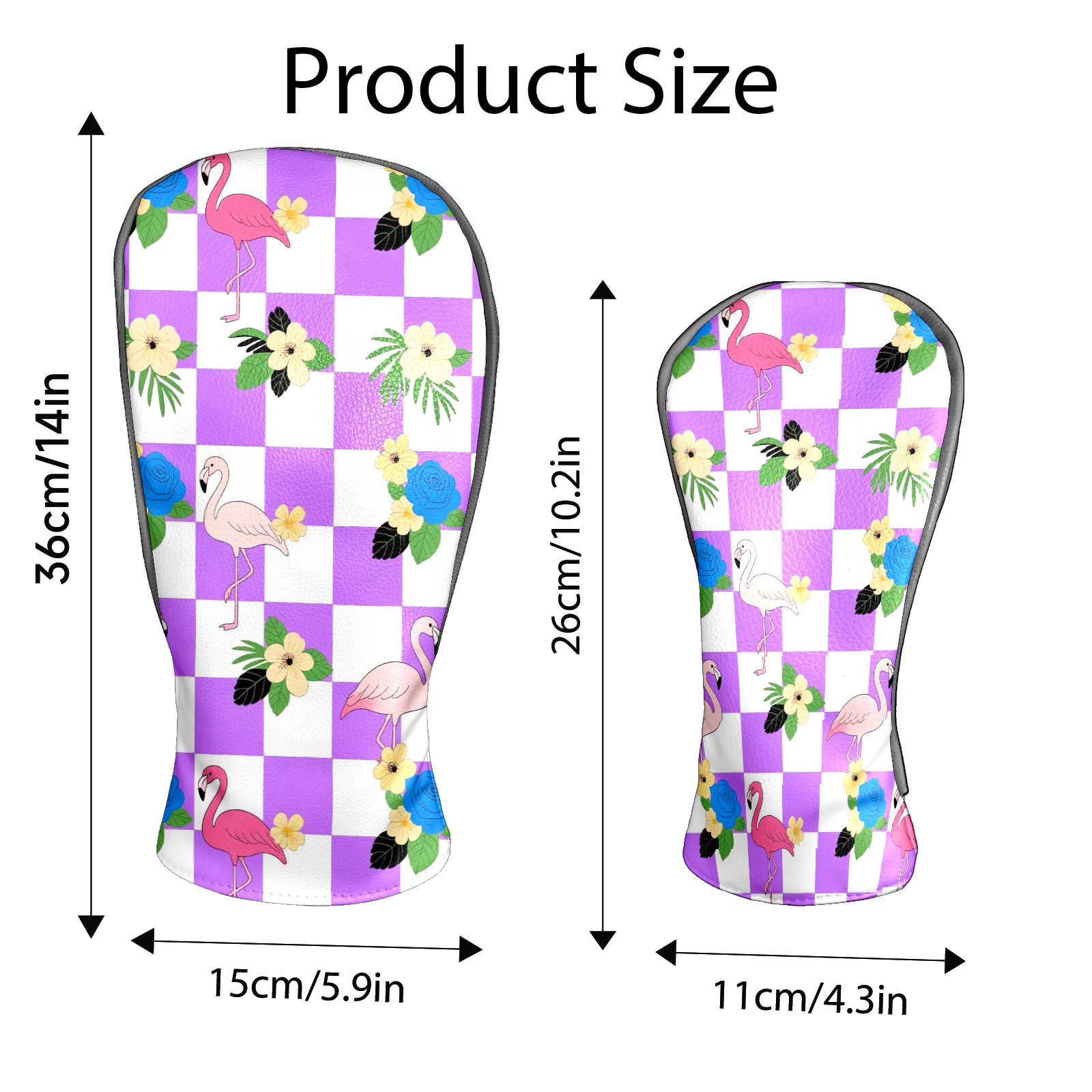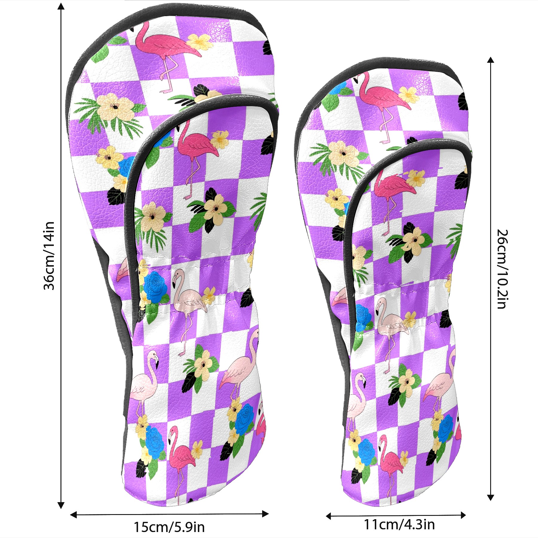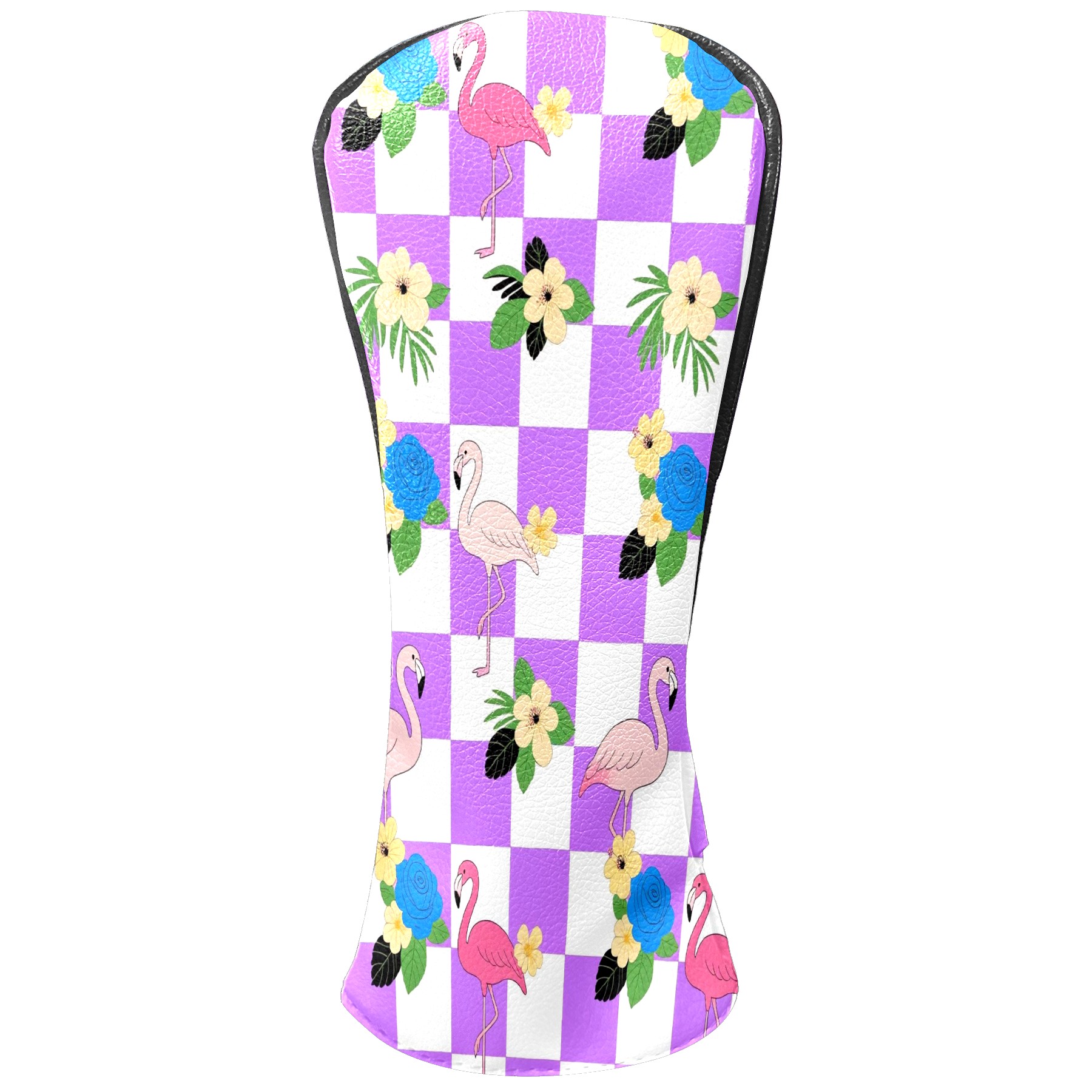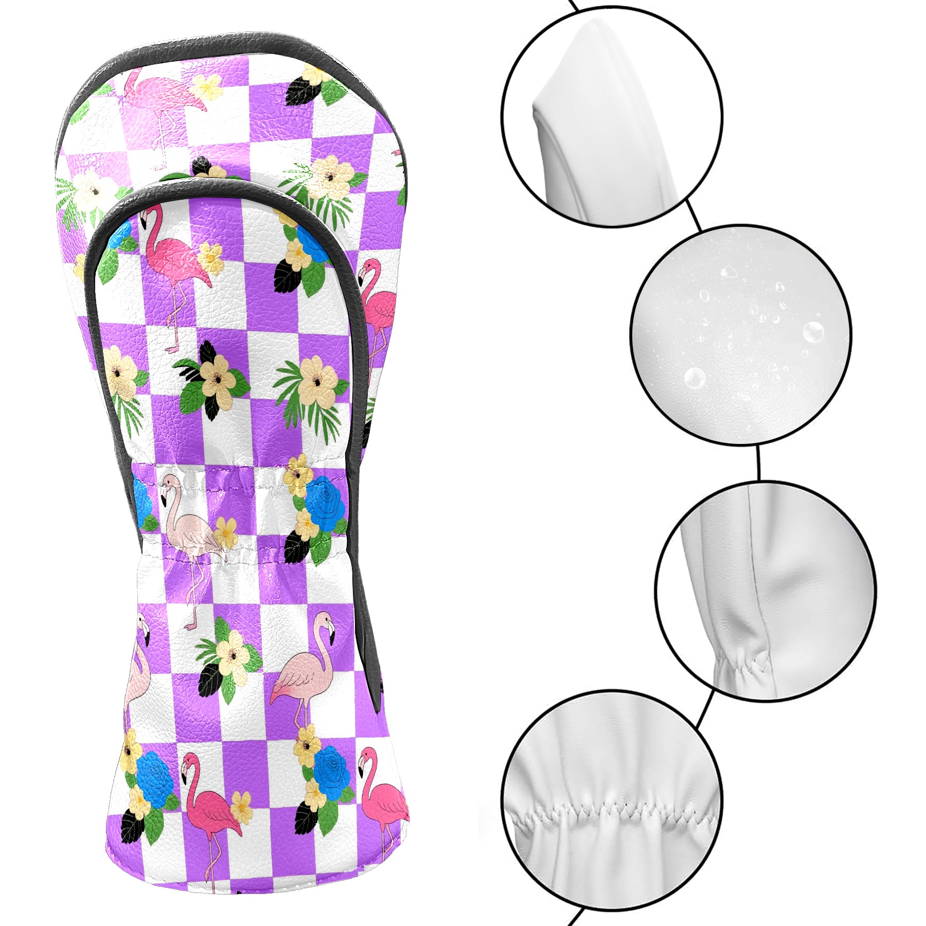 Golf Club Head Cover Premium Leather Driver Headcover, Golf Head Covers for Woods and Driver Waterproof Golf Headcovers with Anti-Scratch Lining for Men Women (Purple Checkered Flamingo)