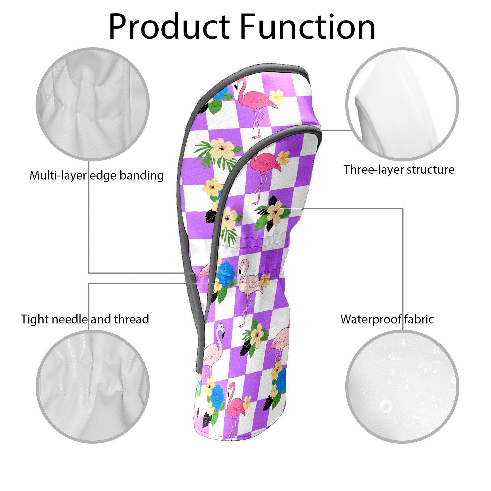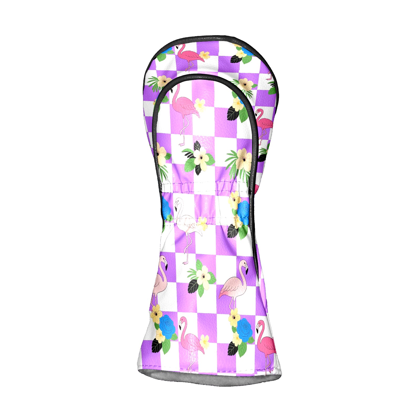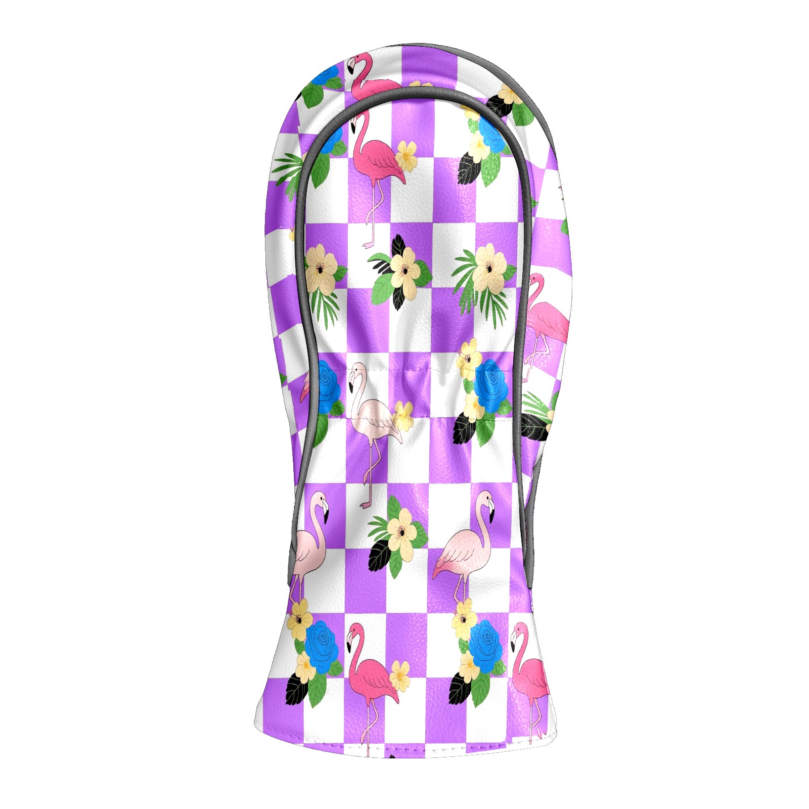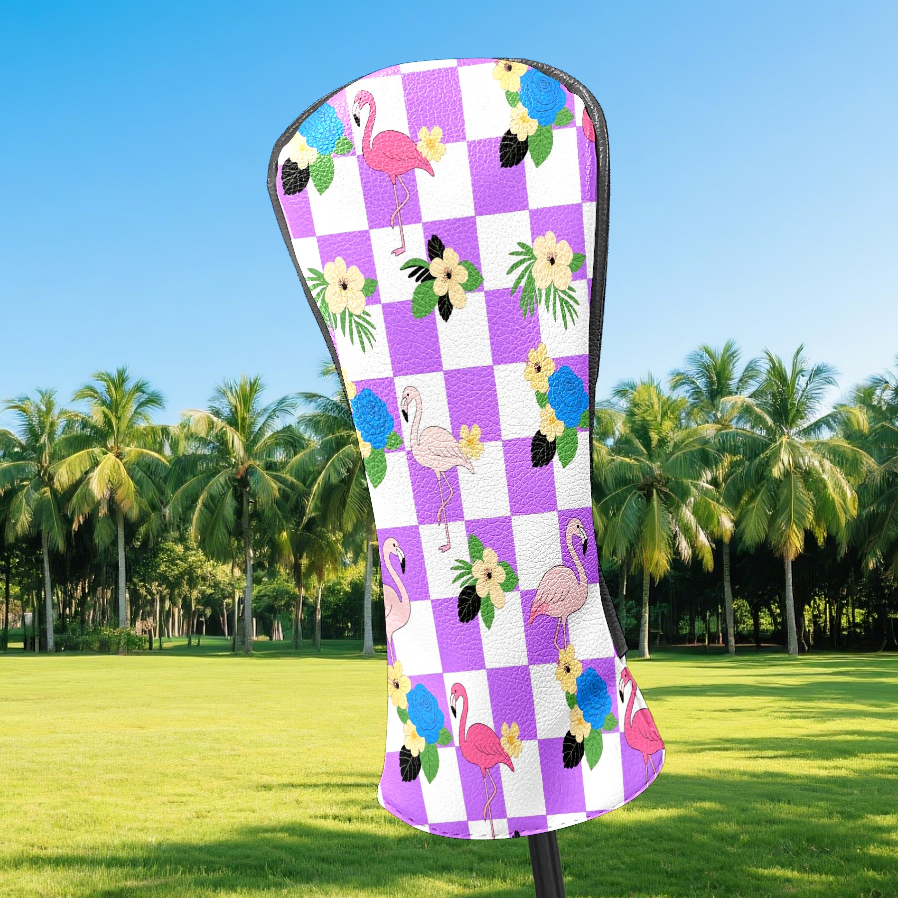 Golf Club Head Cover Premium Leather Driver Headcover, Golf Head Covers for Woods and Driver Waterproof Golf Headcovers with Anti-Scratch Lining for Men Women (Purple Checkered Flamingo)