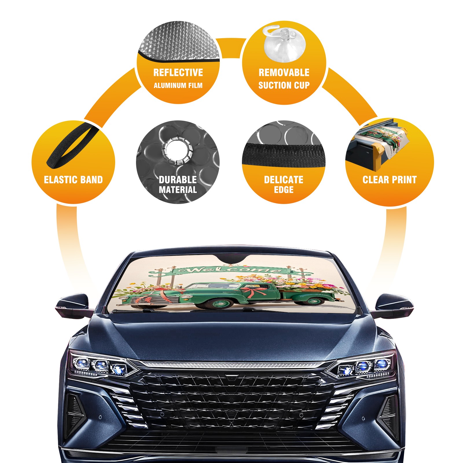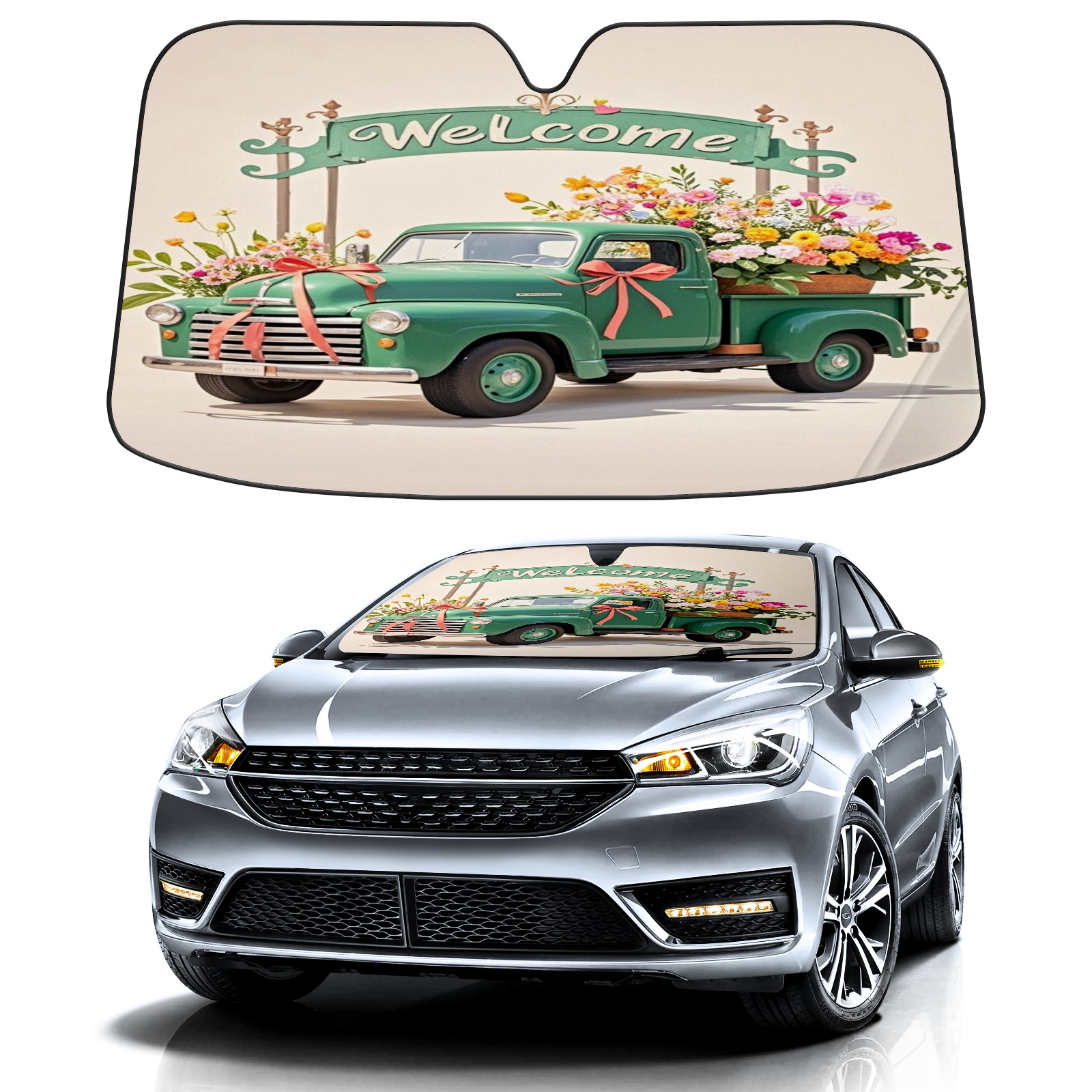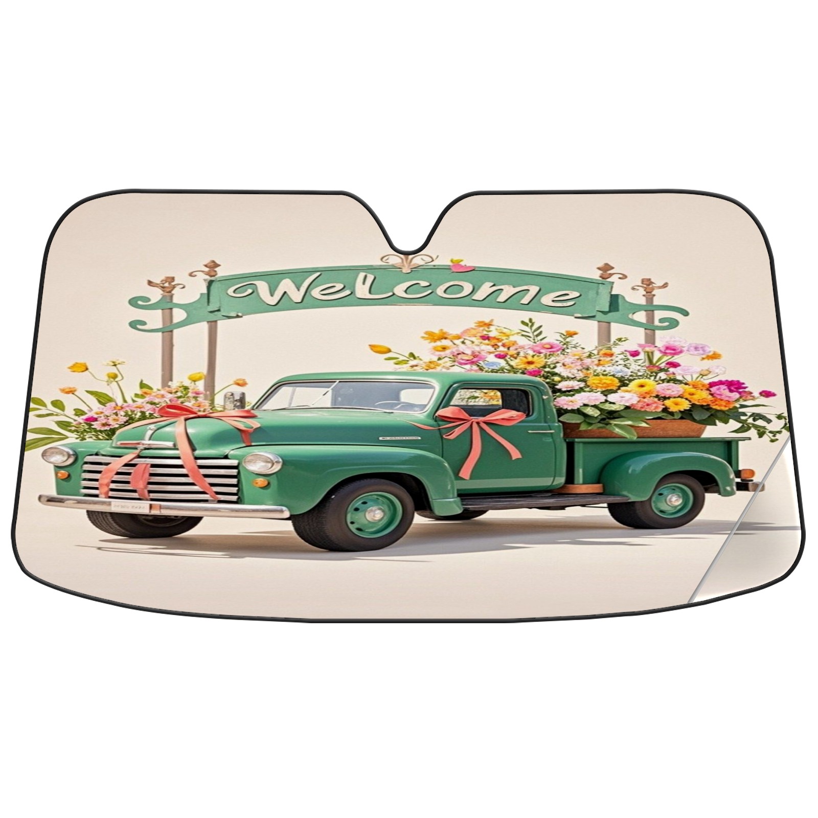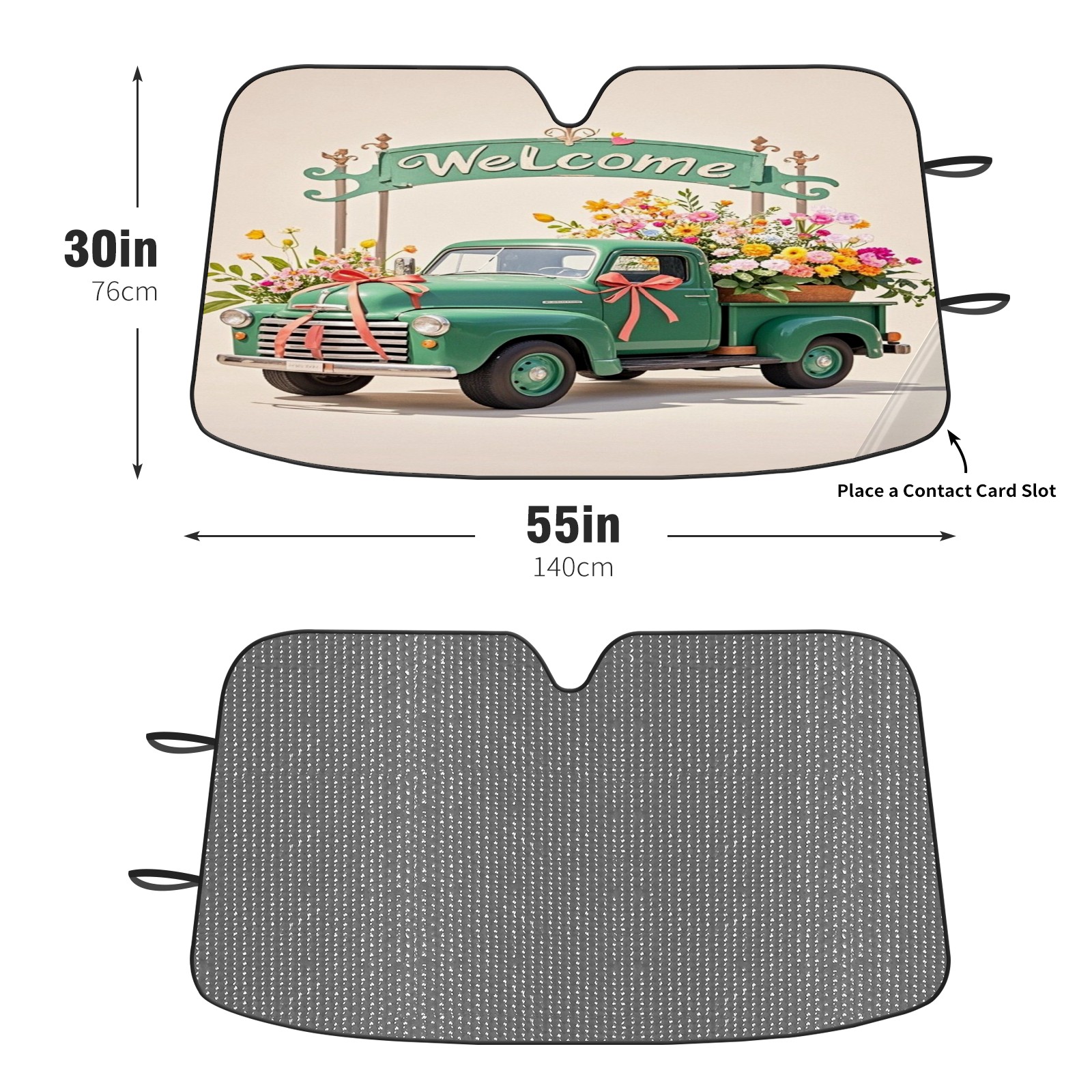 Foldable Aluminum Foil Polyester Car Sunshade Pad | 99% Heat Insulation & Sun Protection | Transparent Number Pocket | Lightweight & Portable | Fits Cars/SUVs/Trucks Green Car And Fiower
