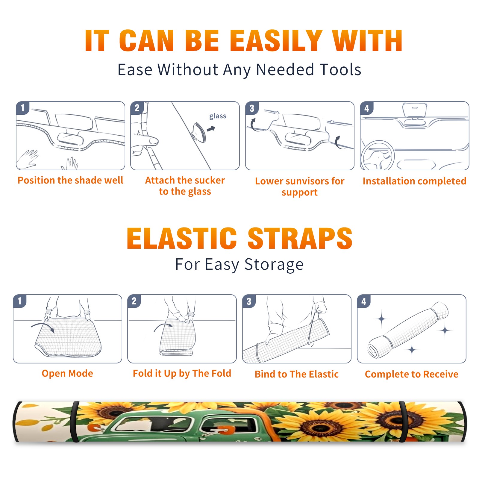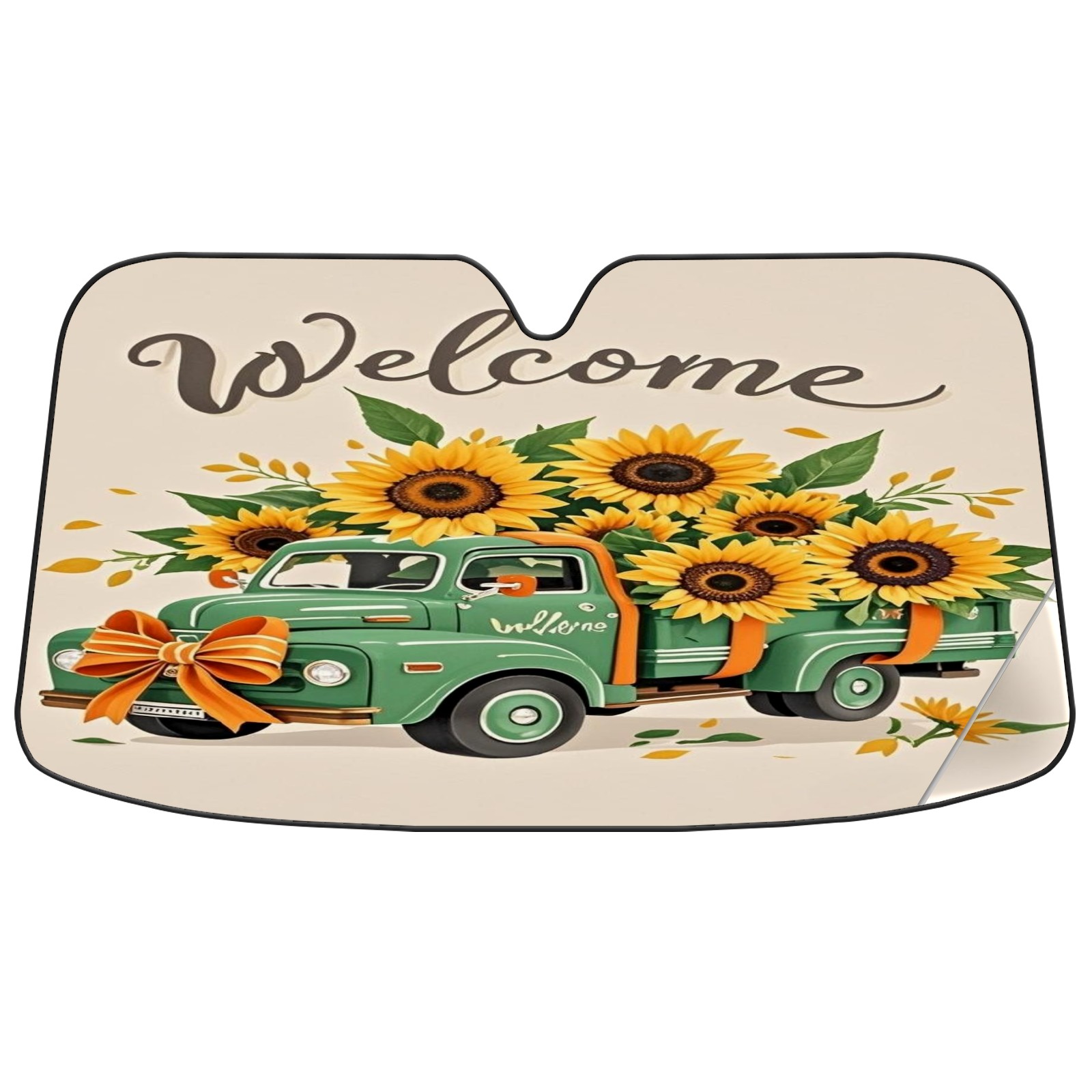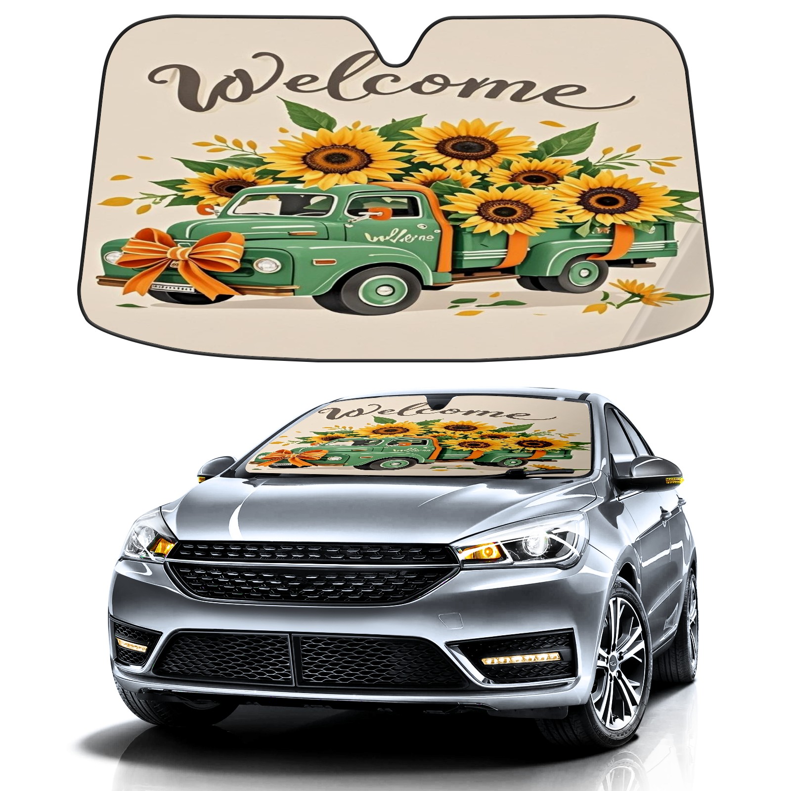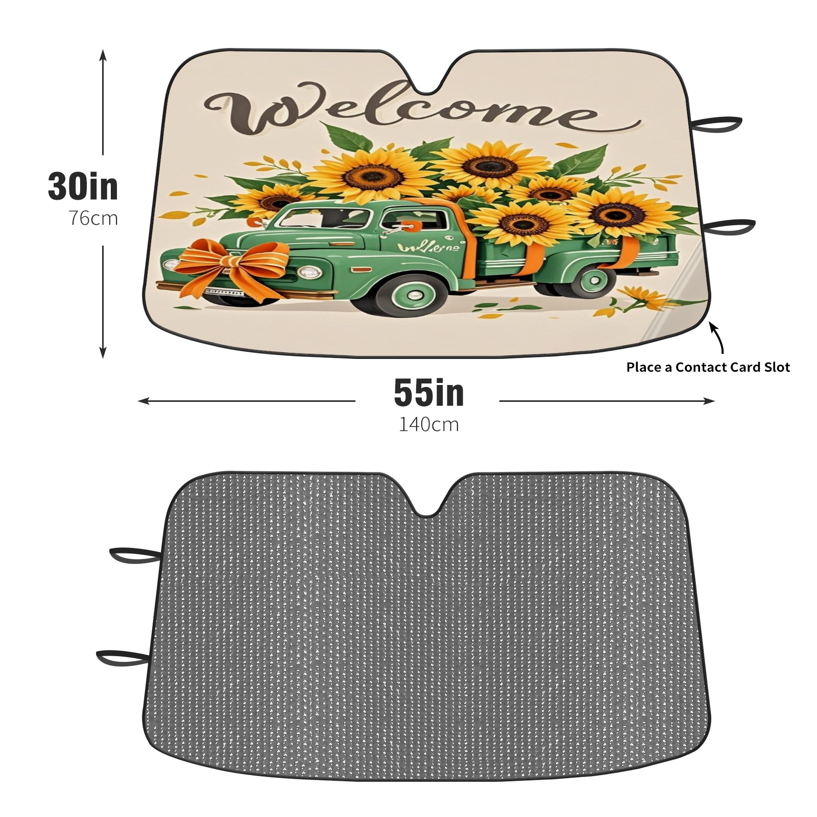 Foldable Aluminum Foil Polyester Car Sunshade Pad | 99% Heat Insulation & Sun Protection | Transparent Number Pocket | Lightweight & Portable | Fits Cars/SUVs/Trucks Green Car And Sunflower