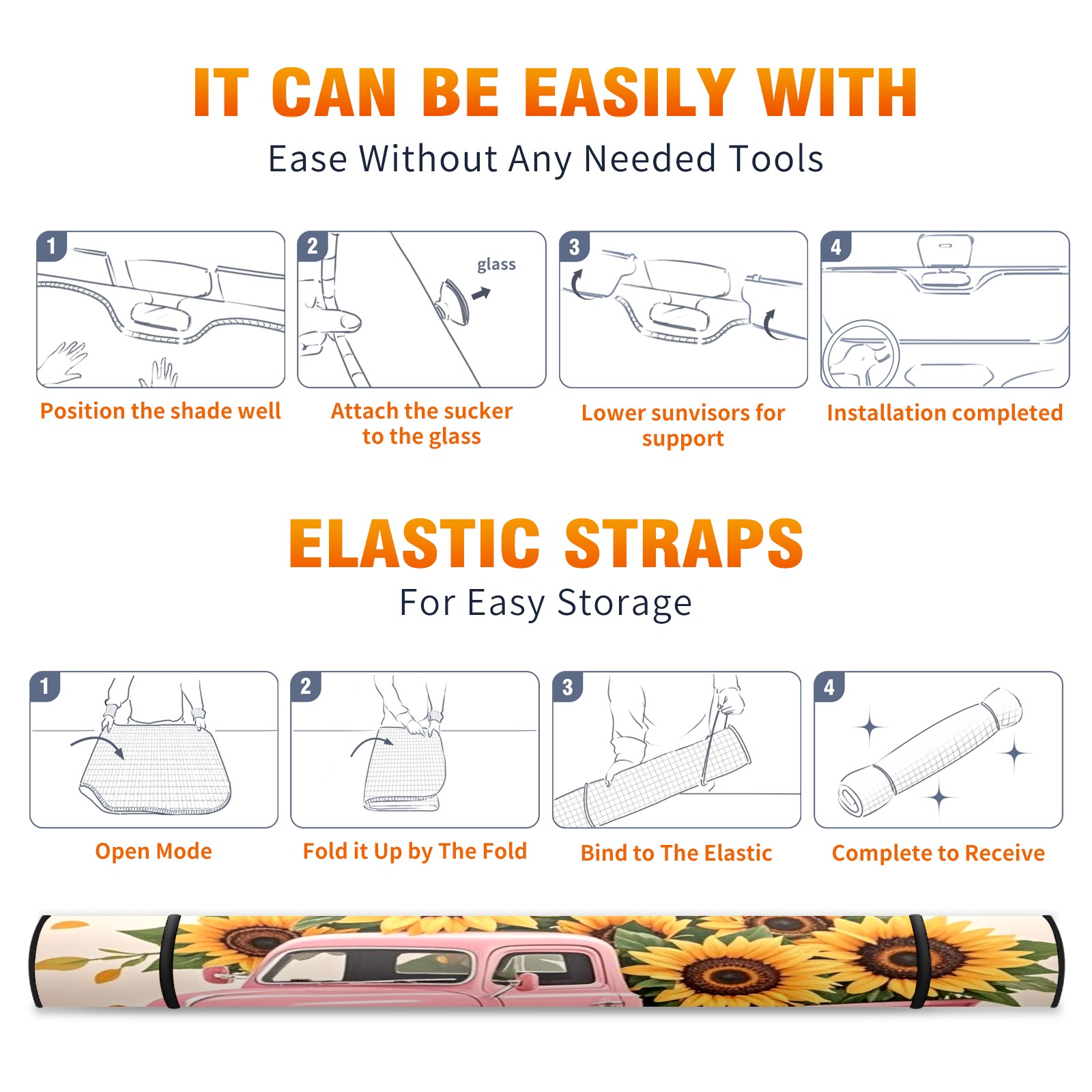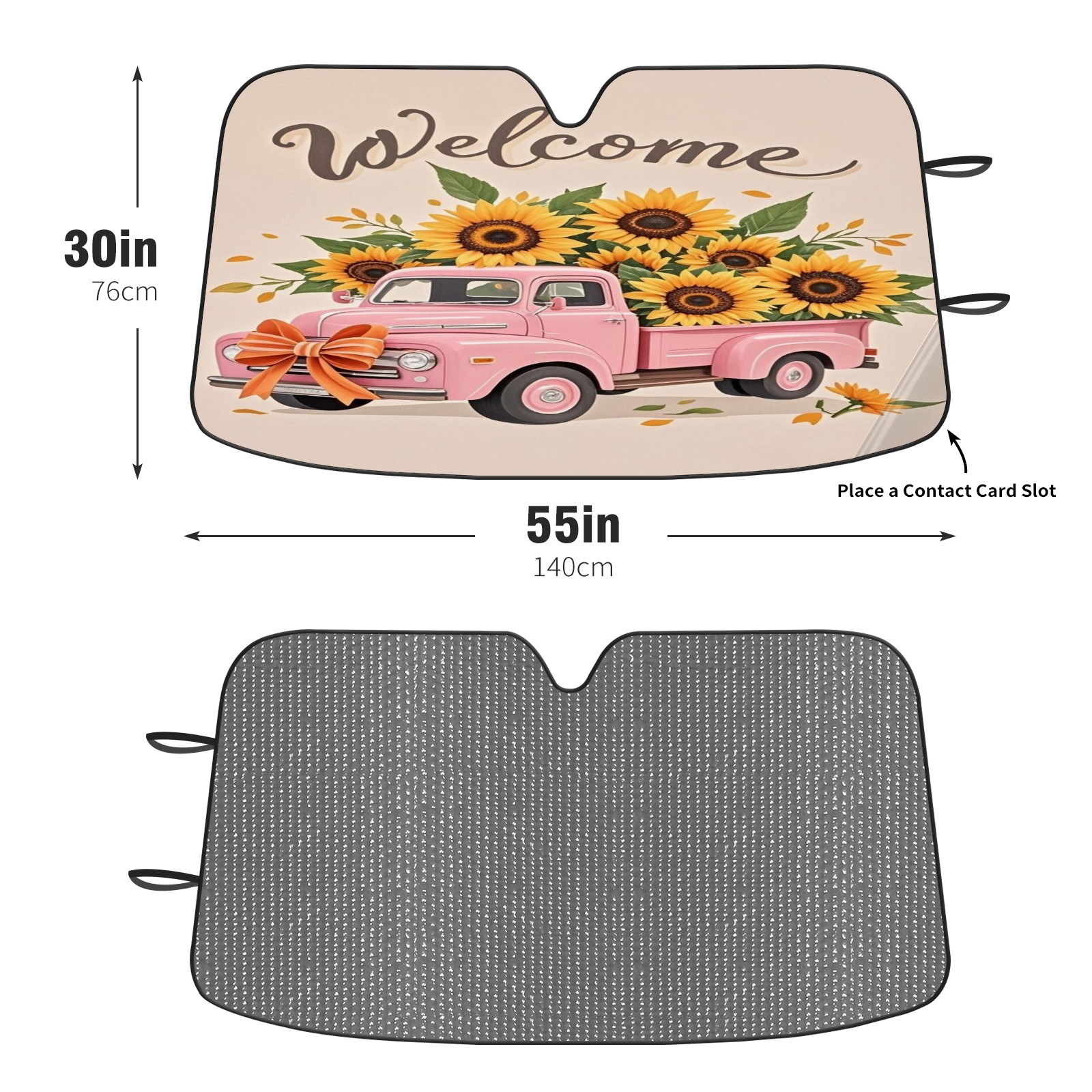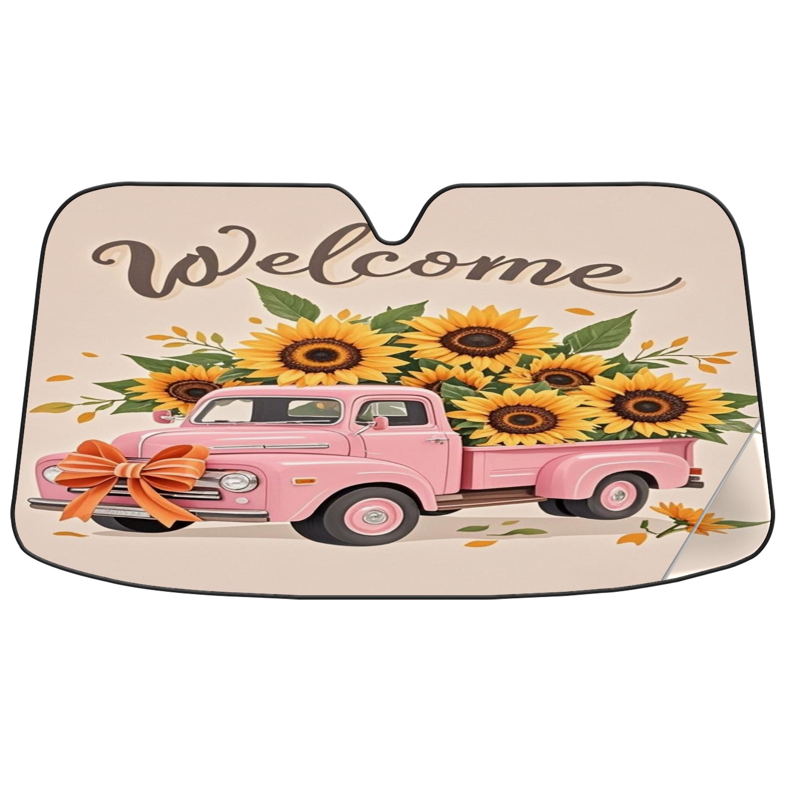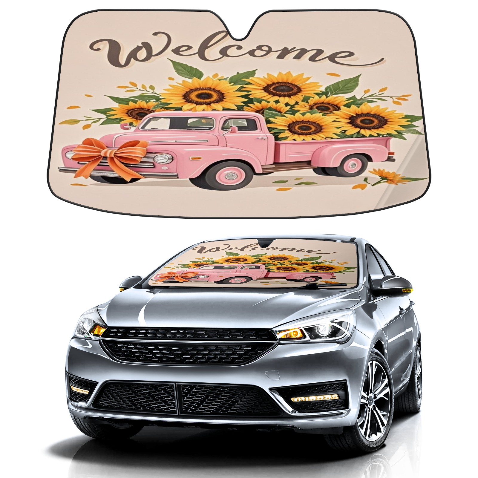 Foldable Aluminum Foil Polyester Car Sunshade Pad | 99% Heat Insulation & Sun Protection | Transparent Number Pocket | Lightweight & Portable | Fits Cars/SUVs/Trucks Pink Car And Sunflower