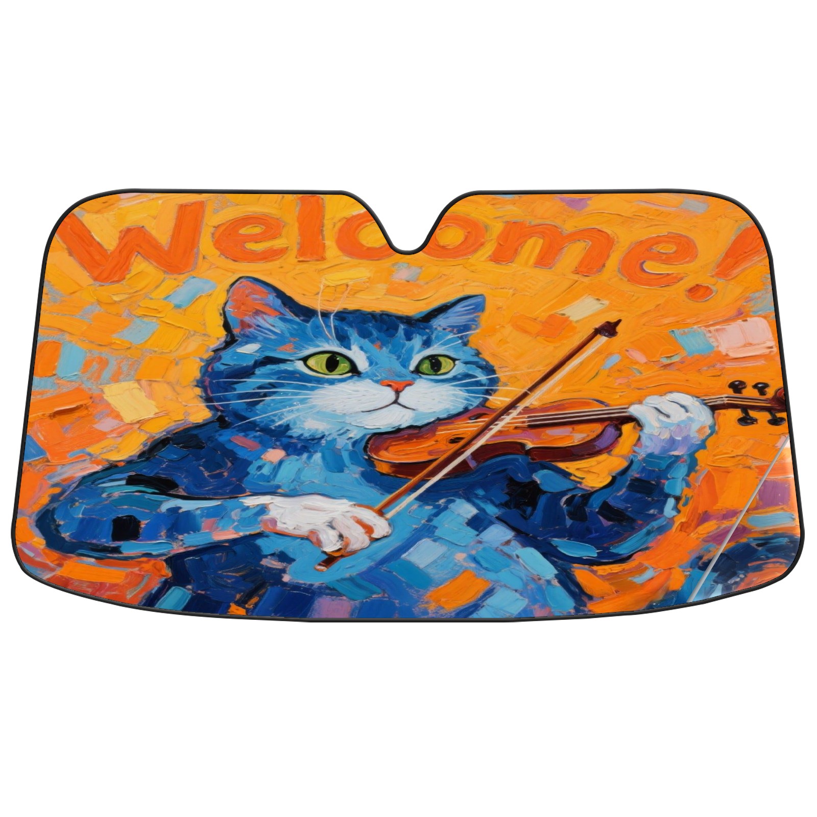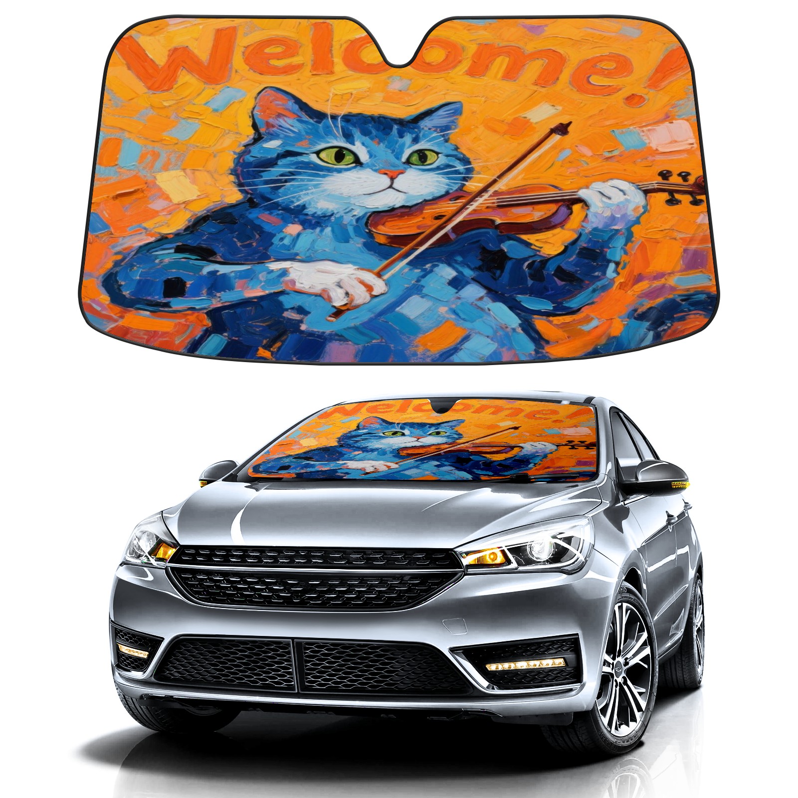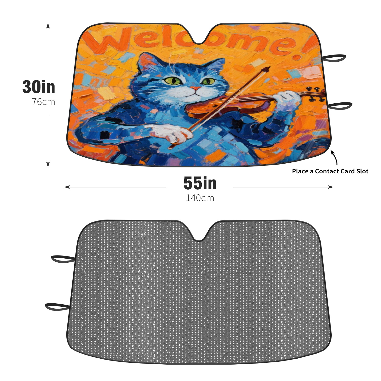 Foldable Aluminum Foil Polyester Car Sunshade Pad | 99% Heat Insulation & Sun Protection | Transparent Number Pocket | Lightweight & Portable | Fits Cars/SUVs/Trucks Blue Cat