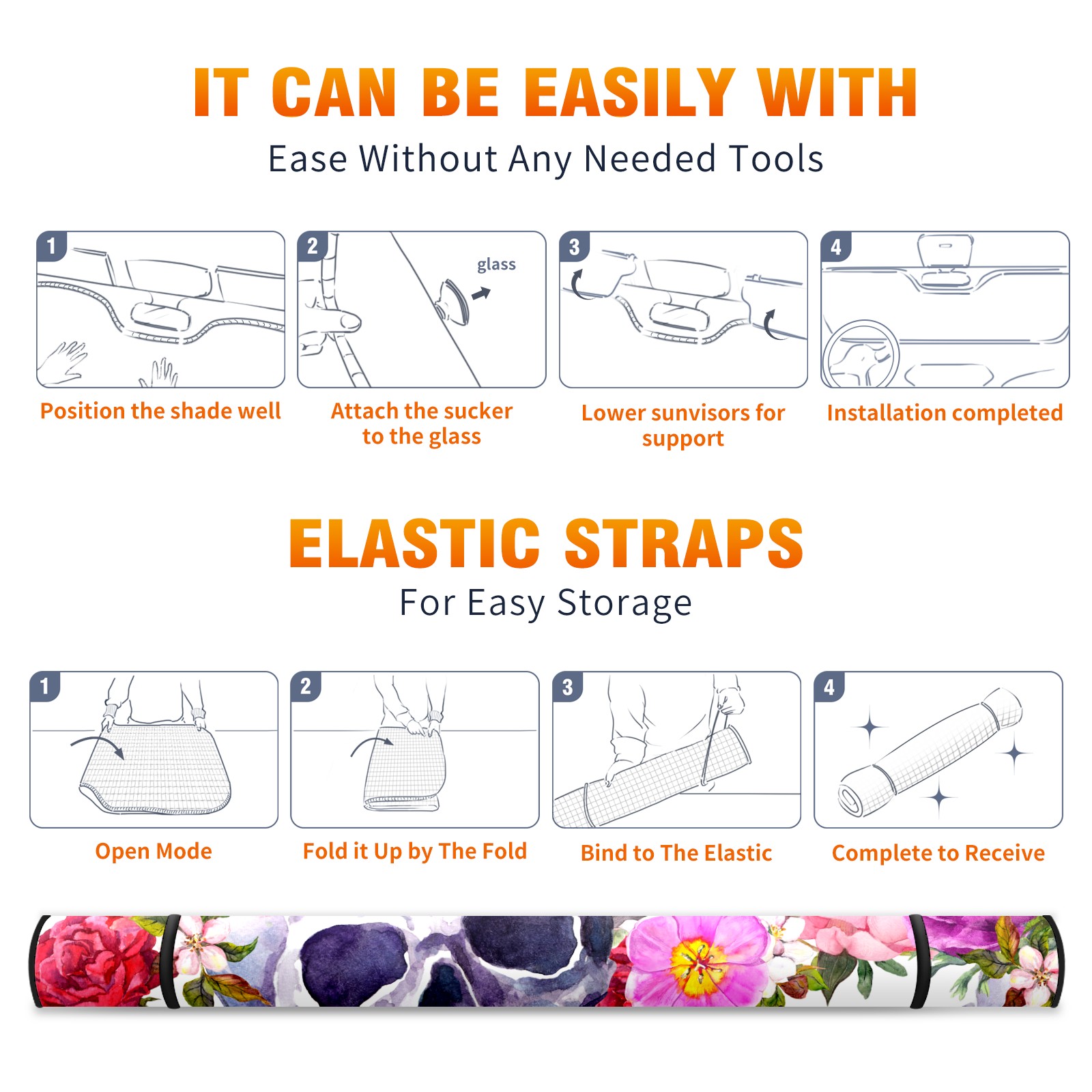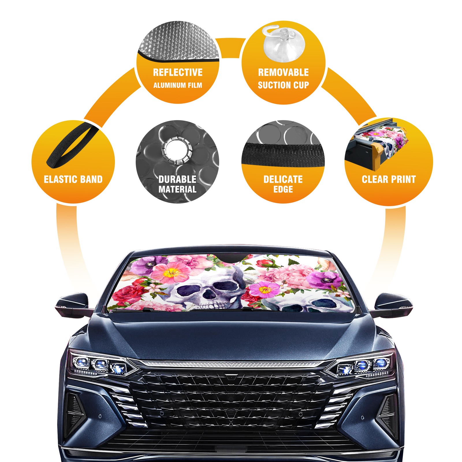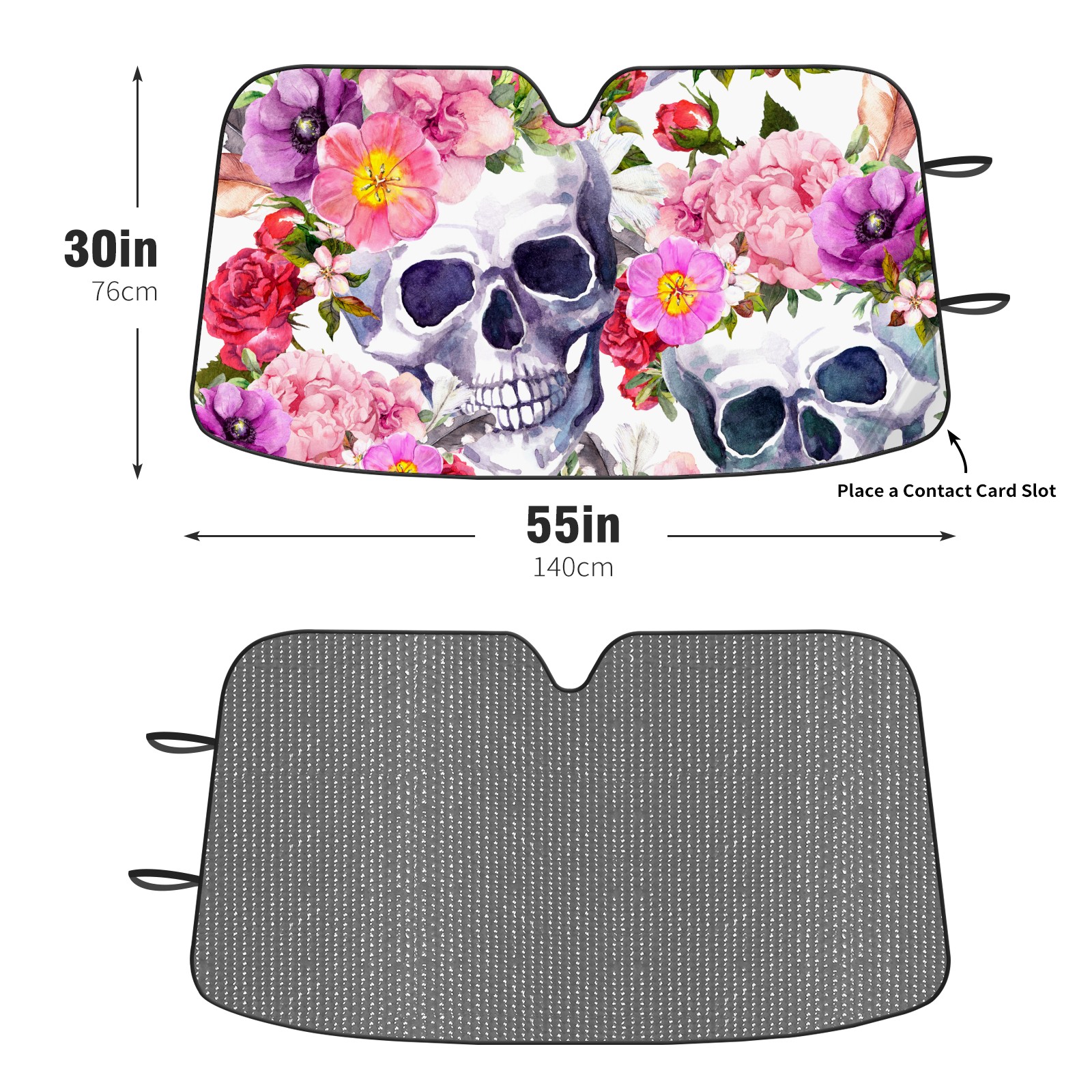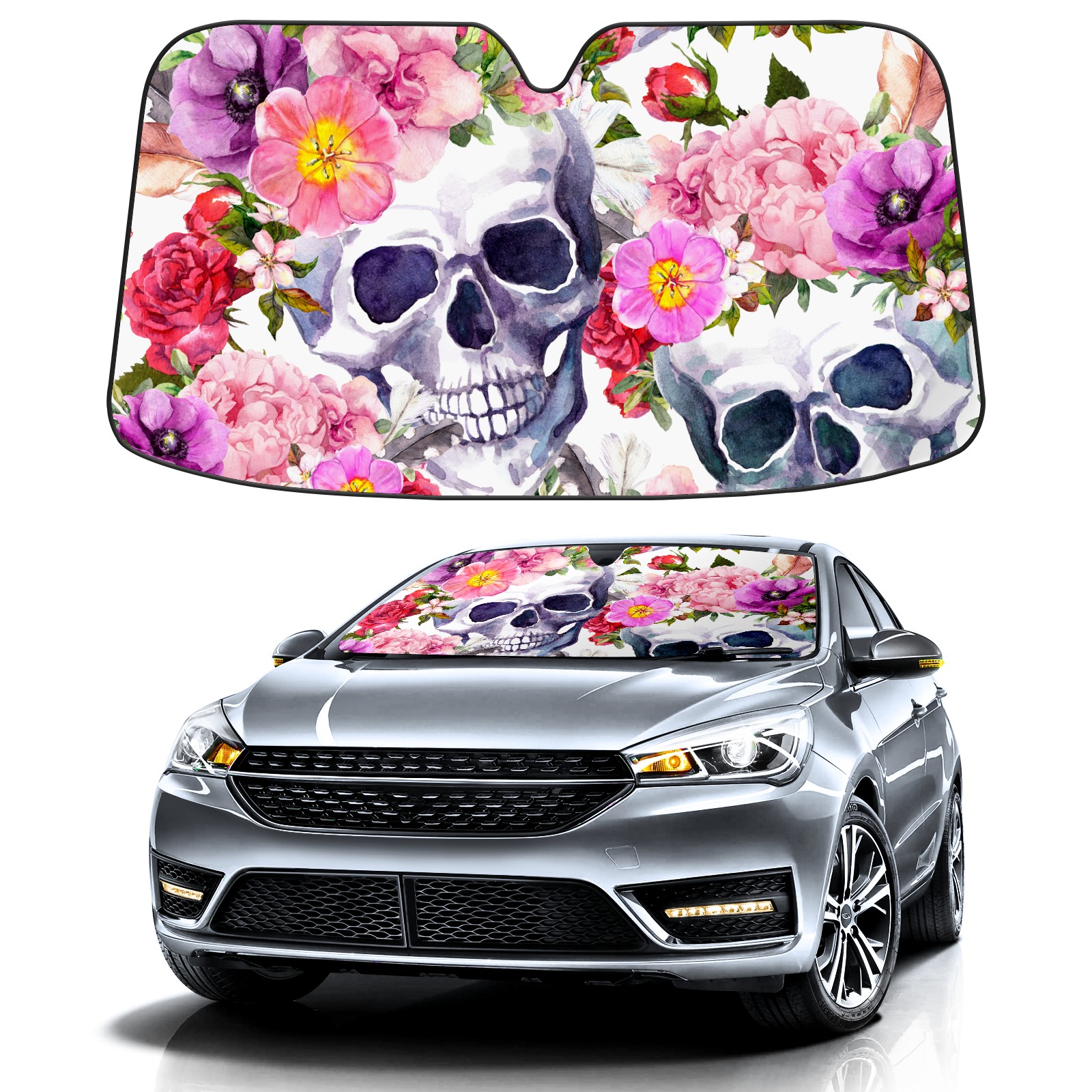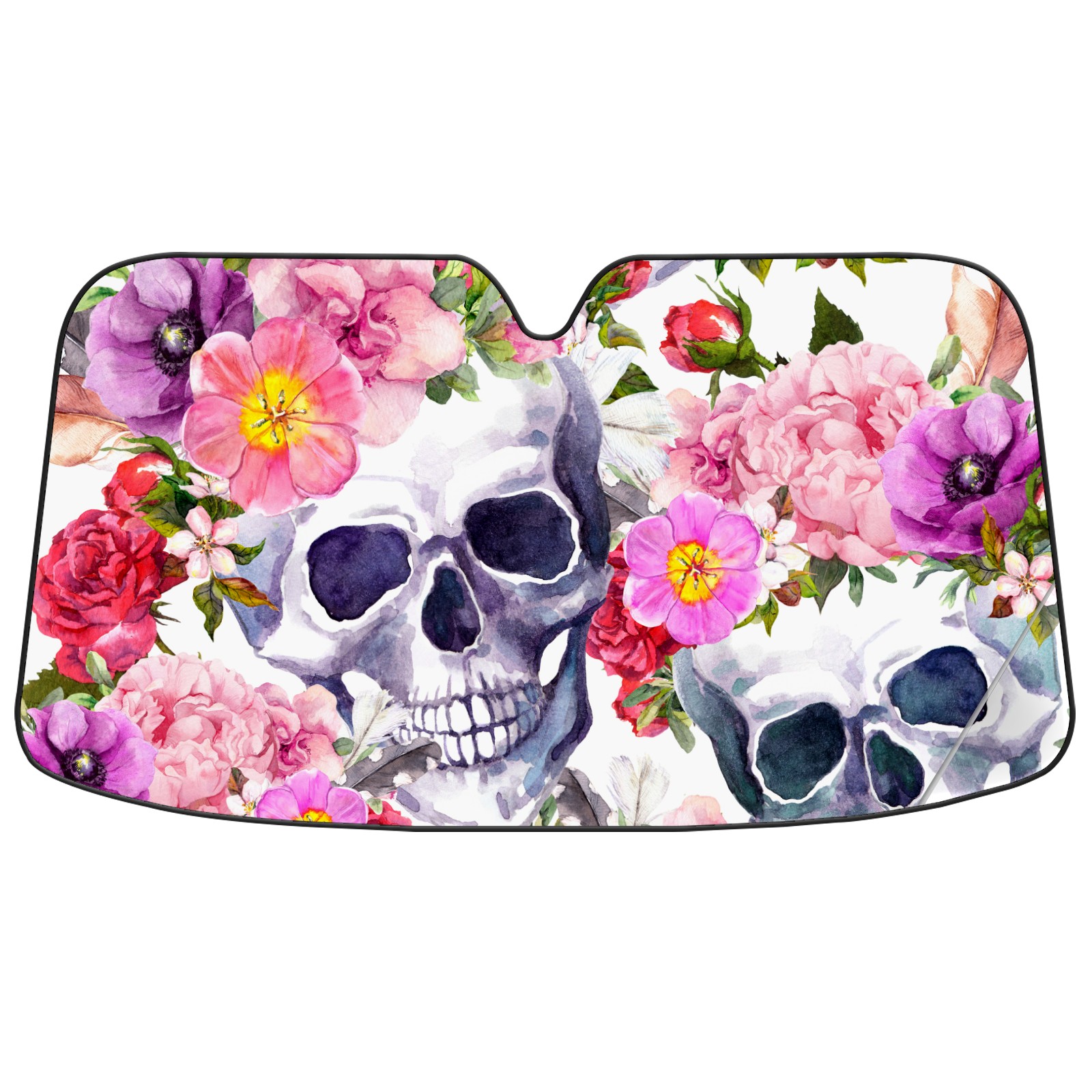 Car Windshield Sun Shade Polyester Car Sunshade Pad, Heat Insulation And Sun Protection Skull With Pink Flower Pattern