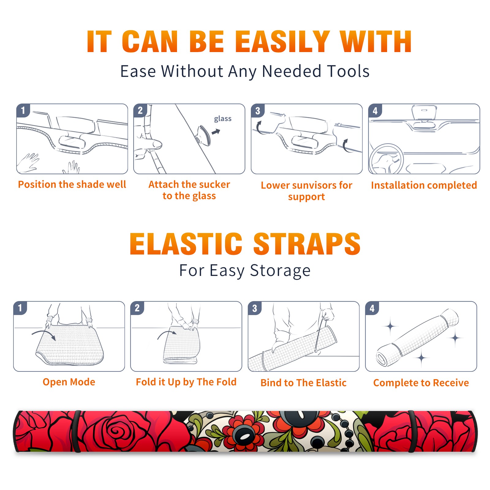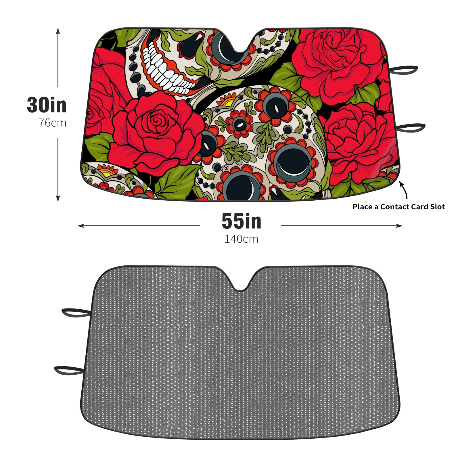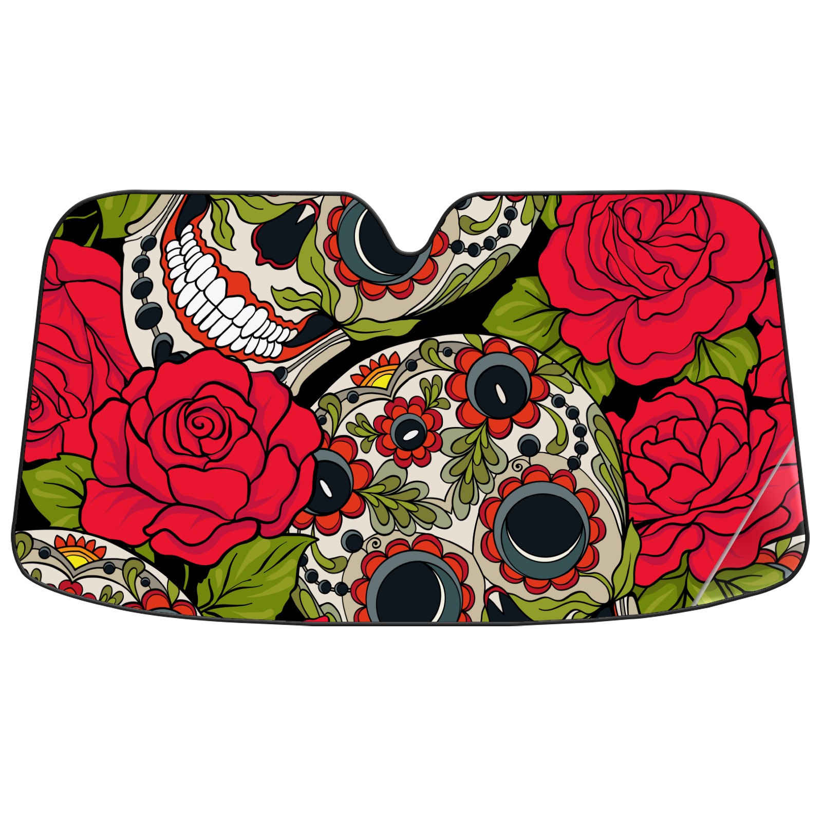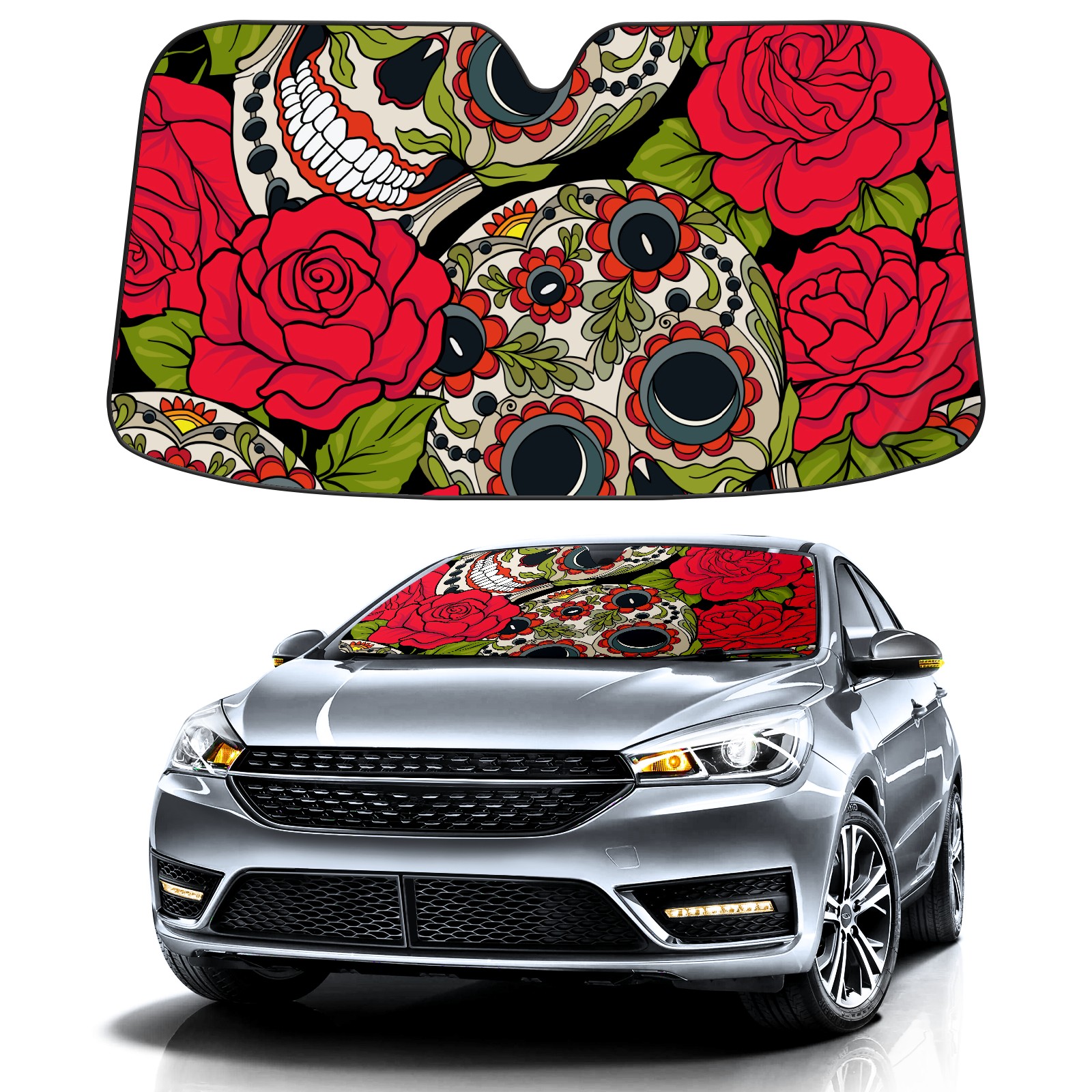 Car Windshield Sun Shade Polyester Car Sunshade Pad, Heat Insulation And Sun Protection Skull Red Flowers Pattern Funny