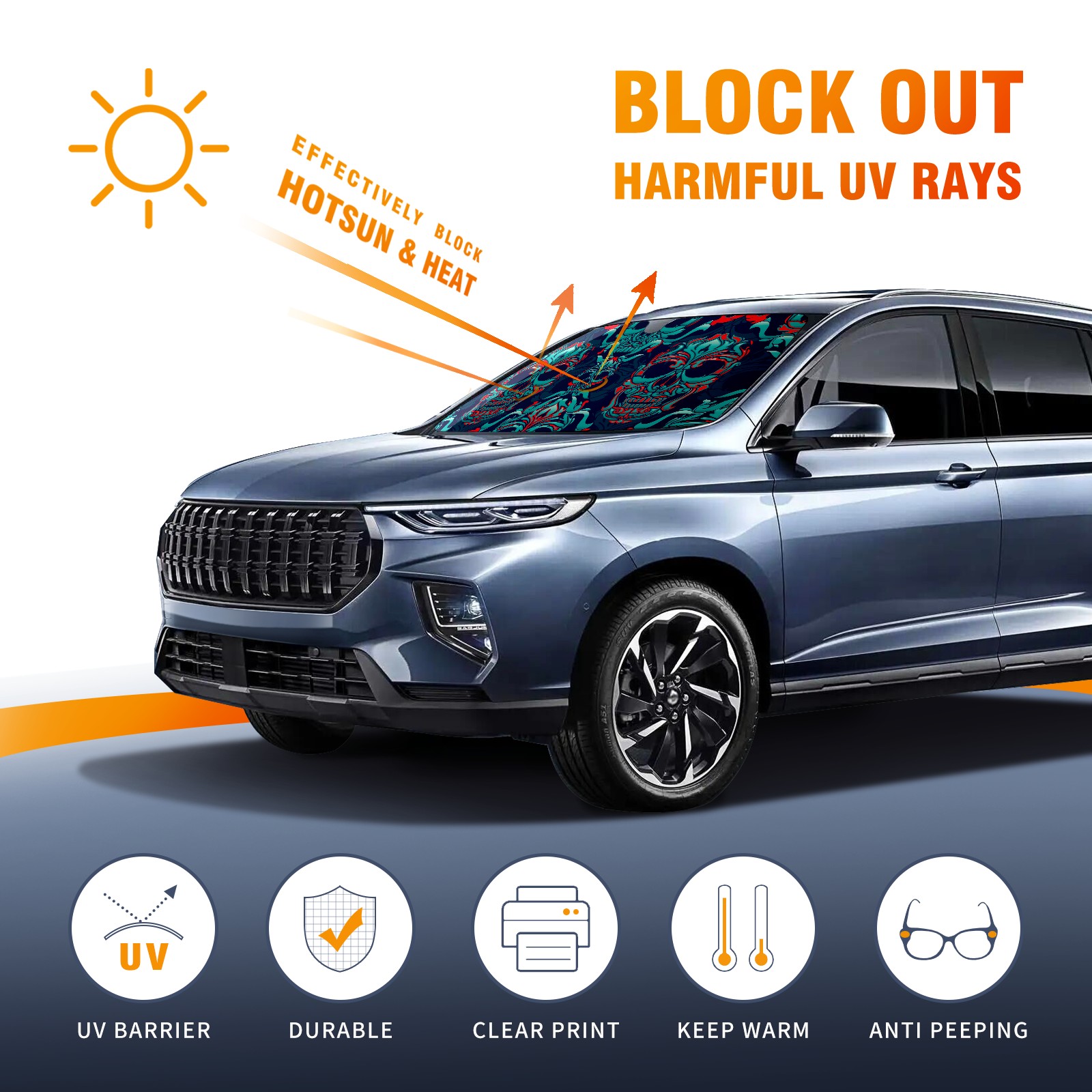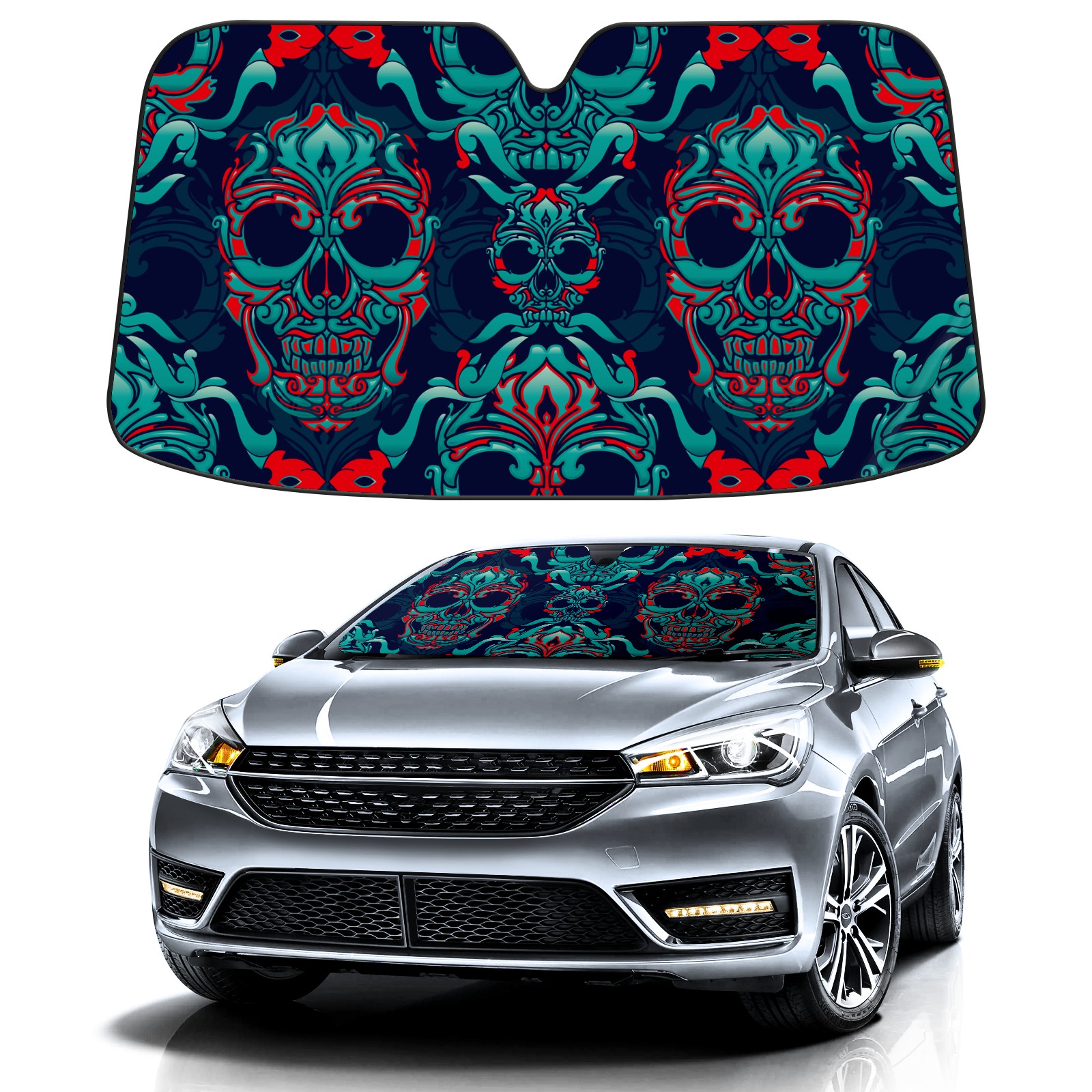 Car Windshield Sun Shade Polyester Car Sunshade Pad, Heat Insulation And Sun Protection Funny Skulls Pattern Skeleton