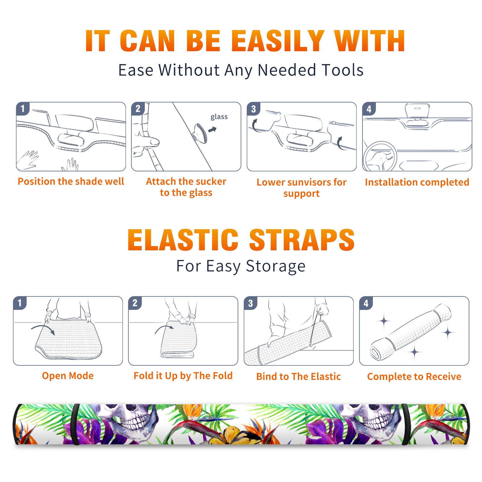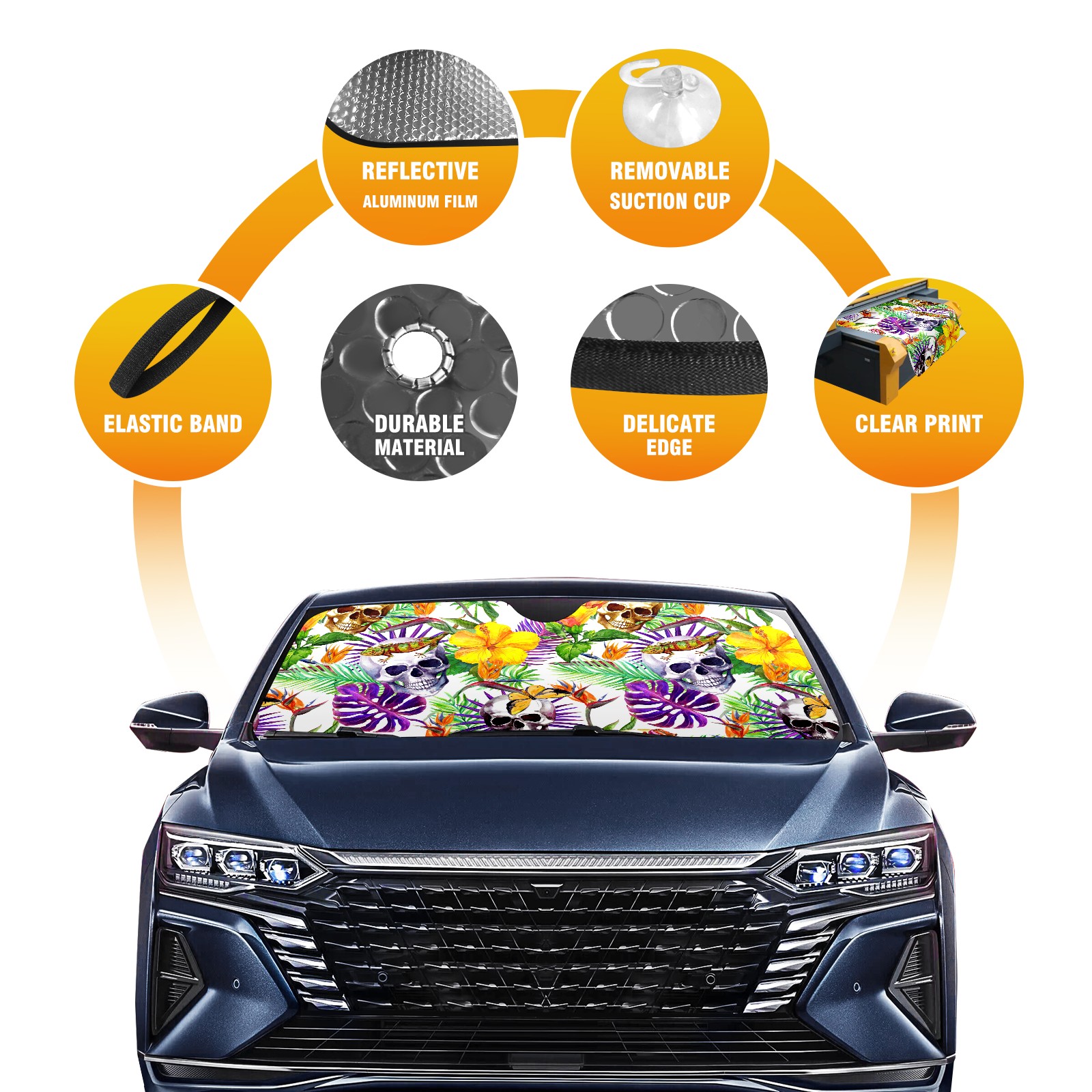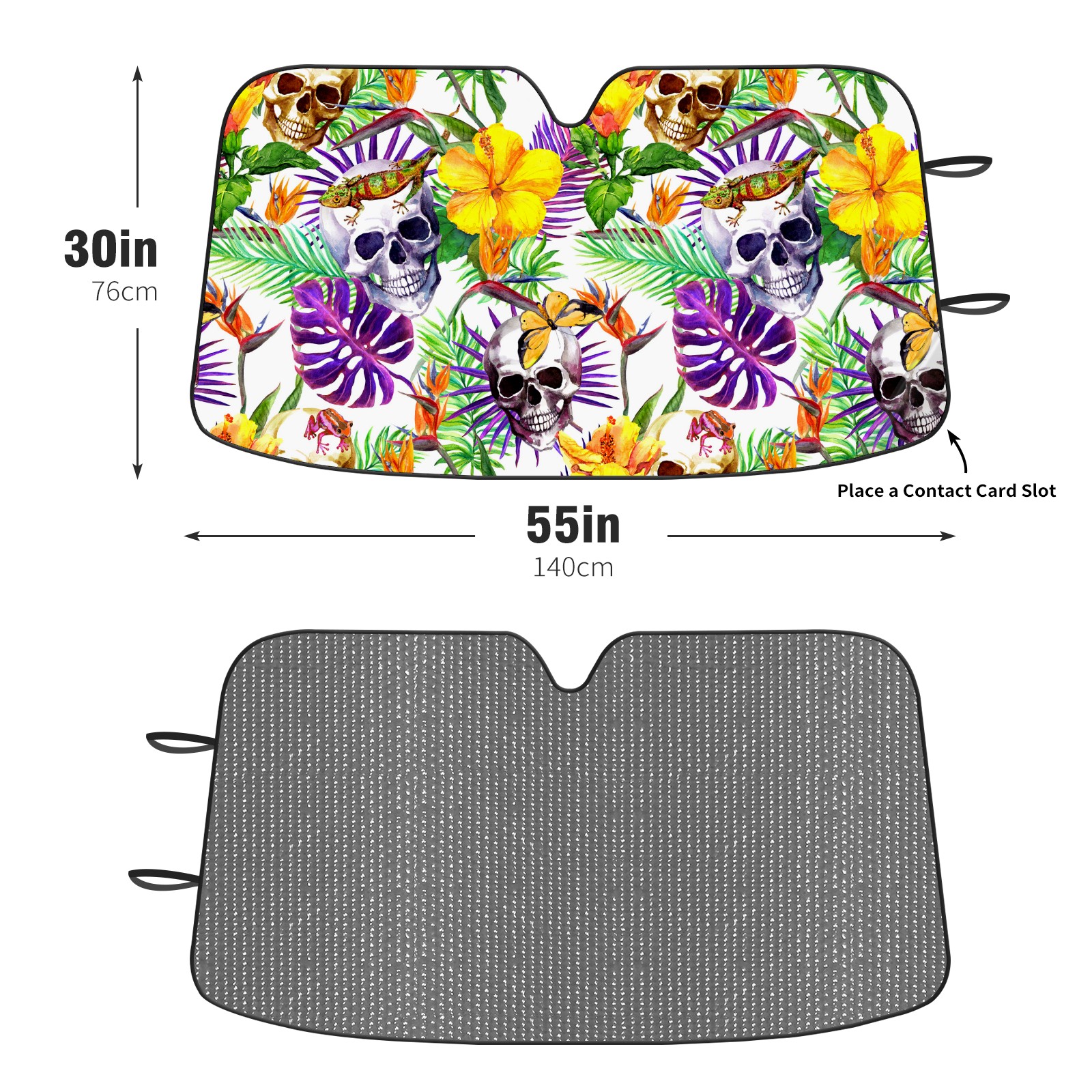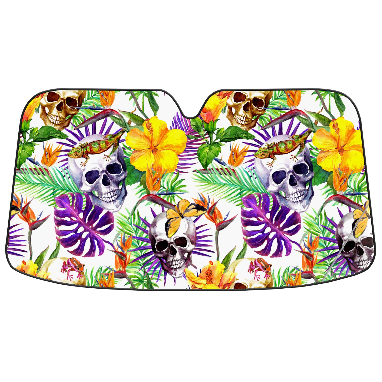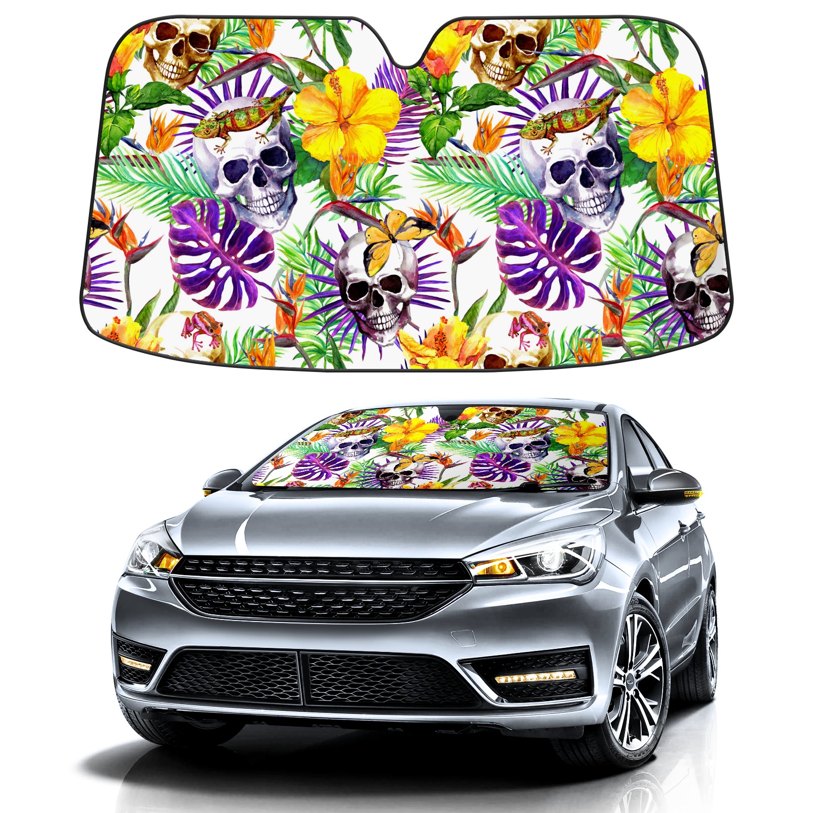 Car Windshield Sun Shade Polyester Car Sunshade Pad, Heat Insulation And Sun Protection Funny Skull With Leaves