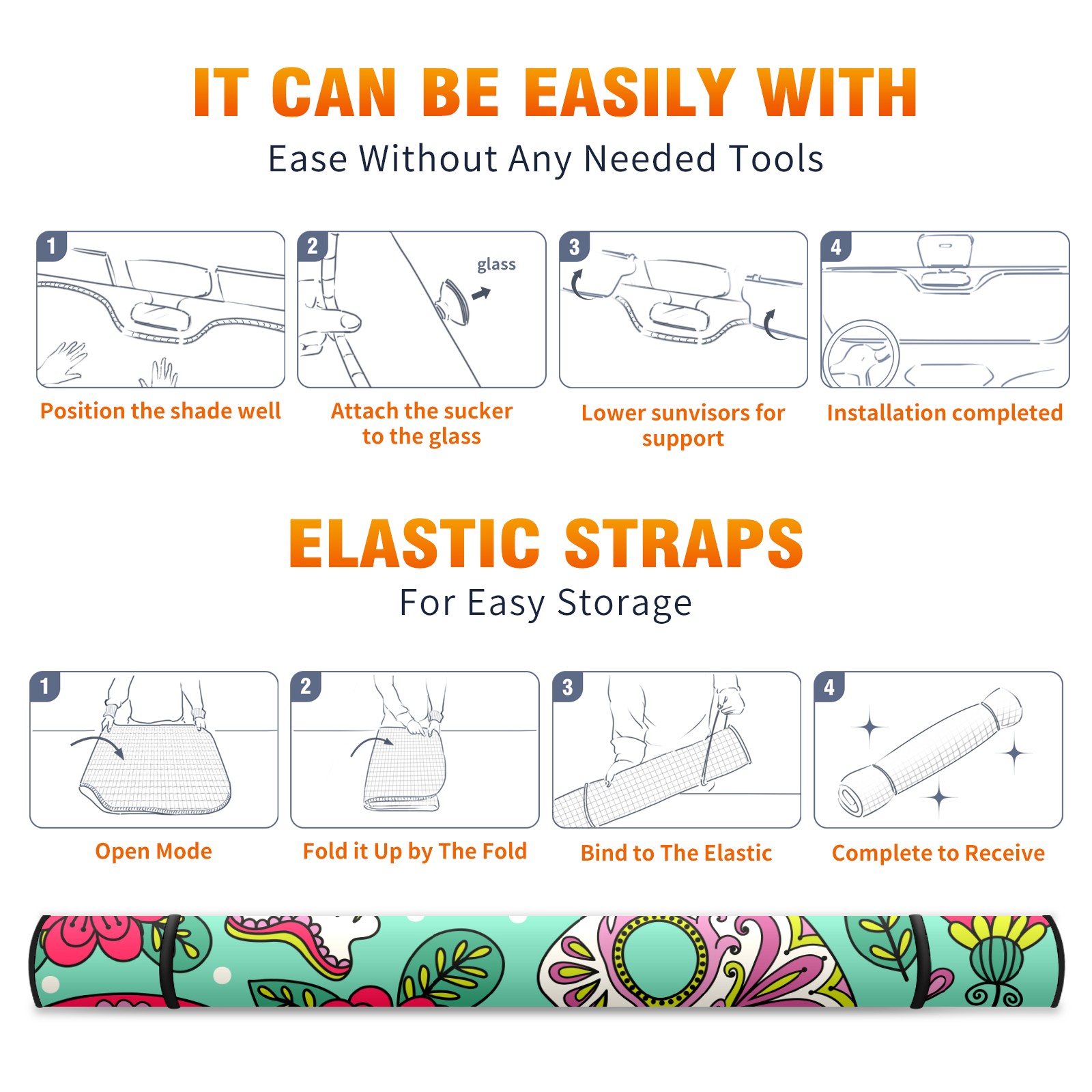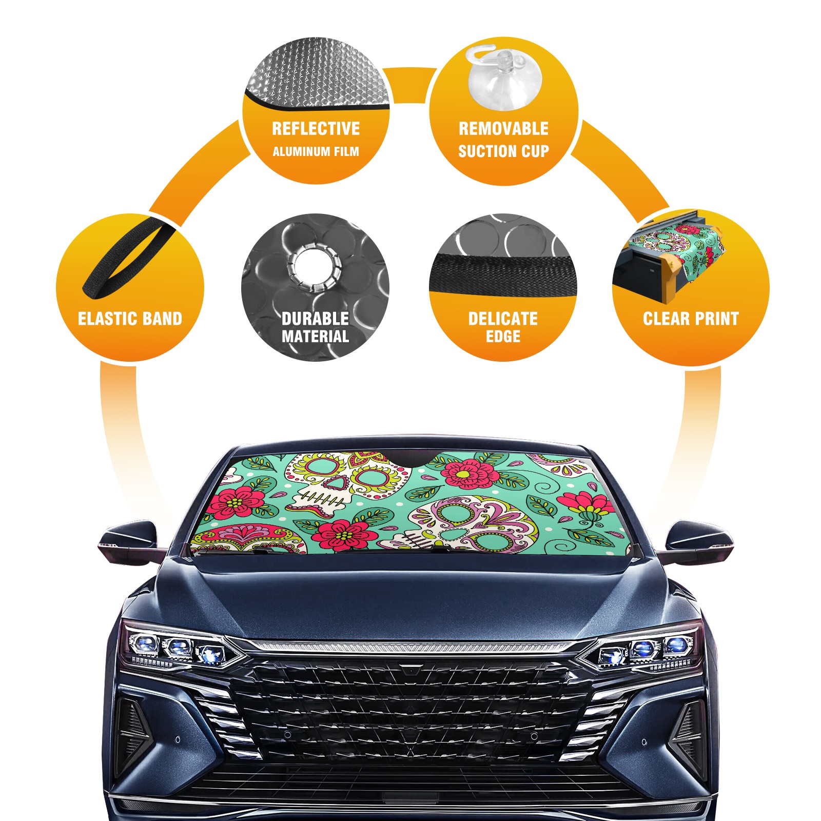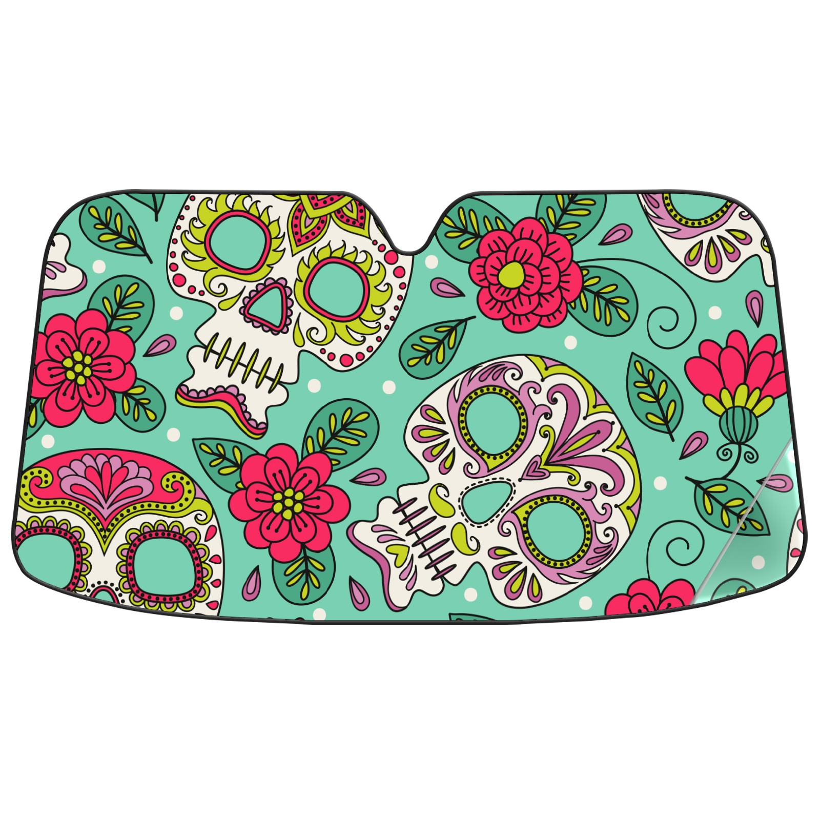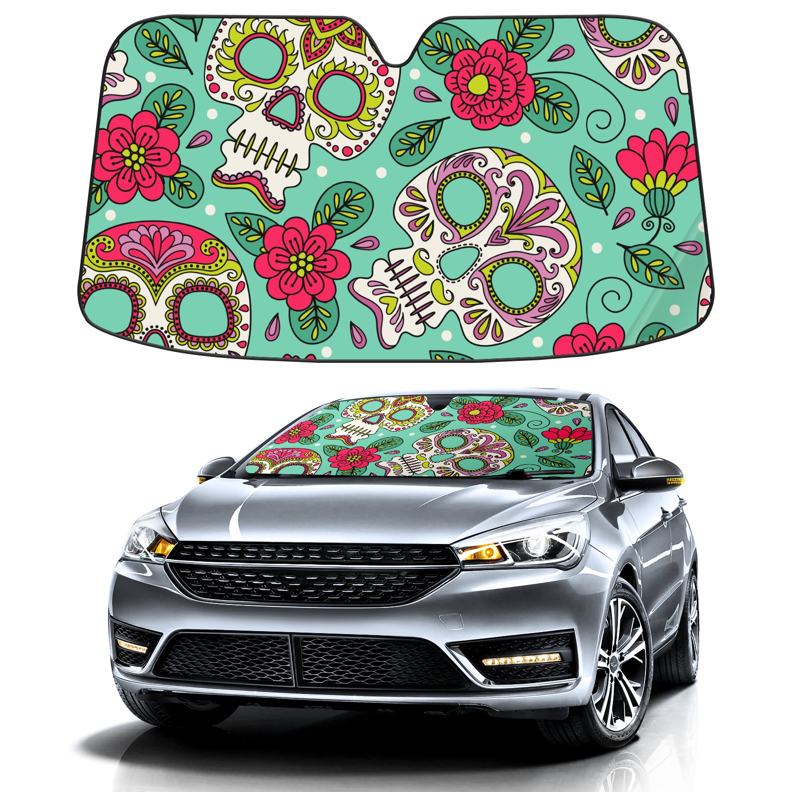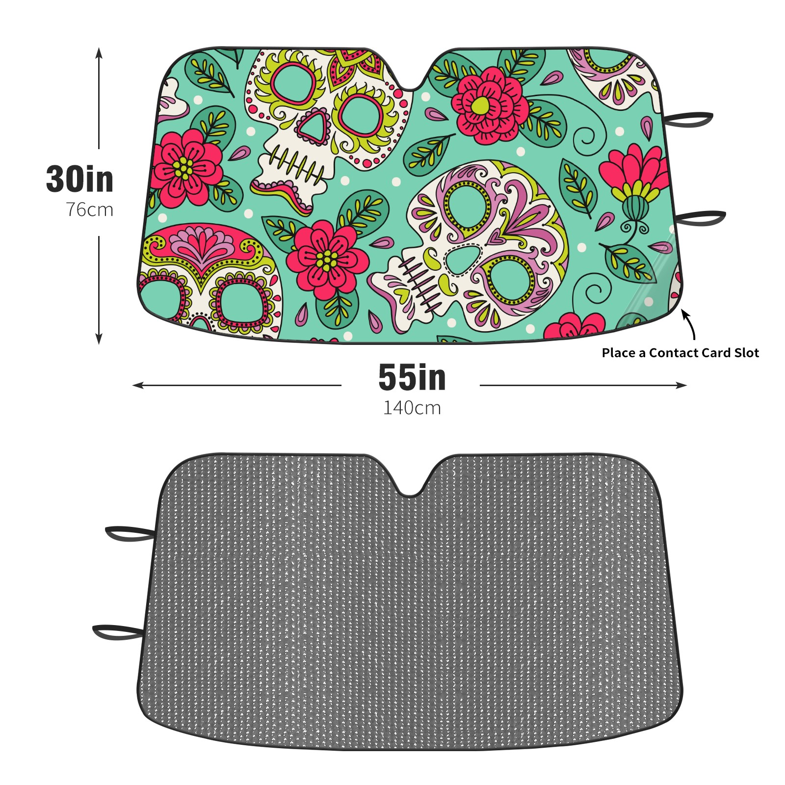 Car Windshield Sun Shade Polyester Car Sunshade Pad, Heat Insulation And Sun Protection Flowers Skull Pattern Green