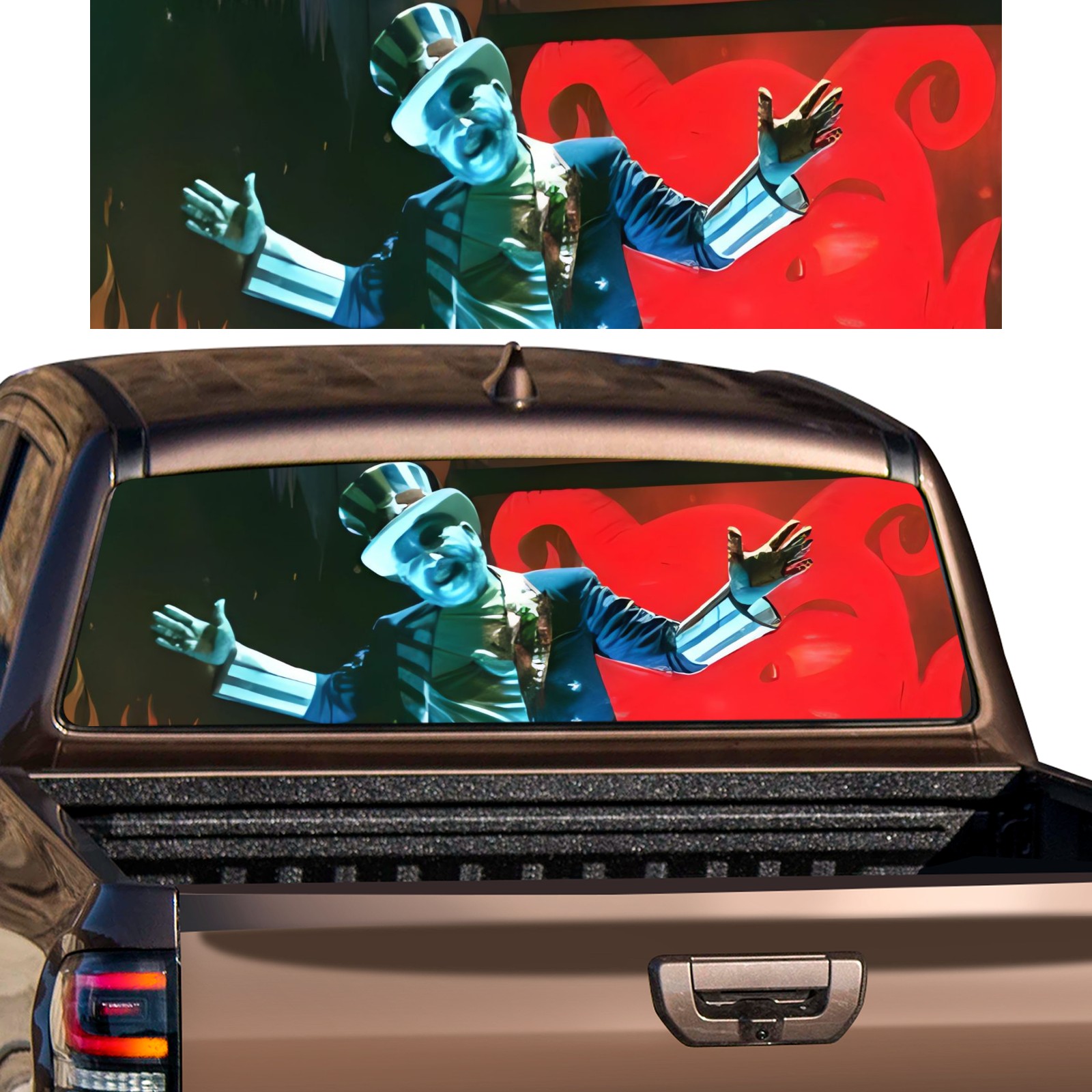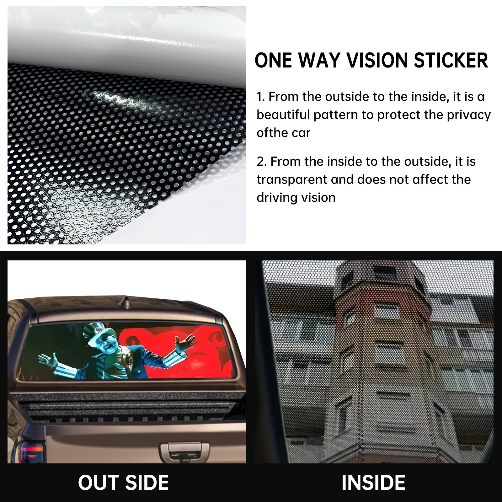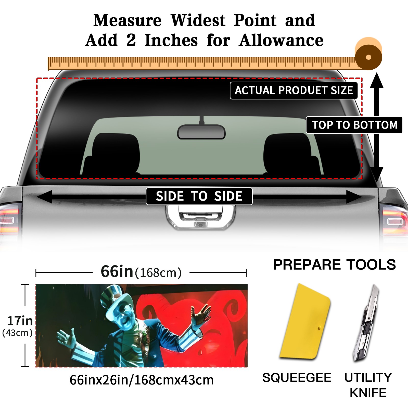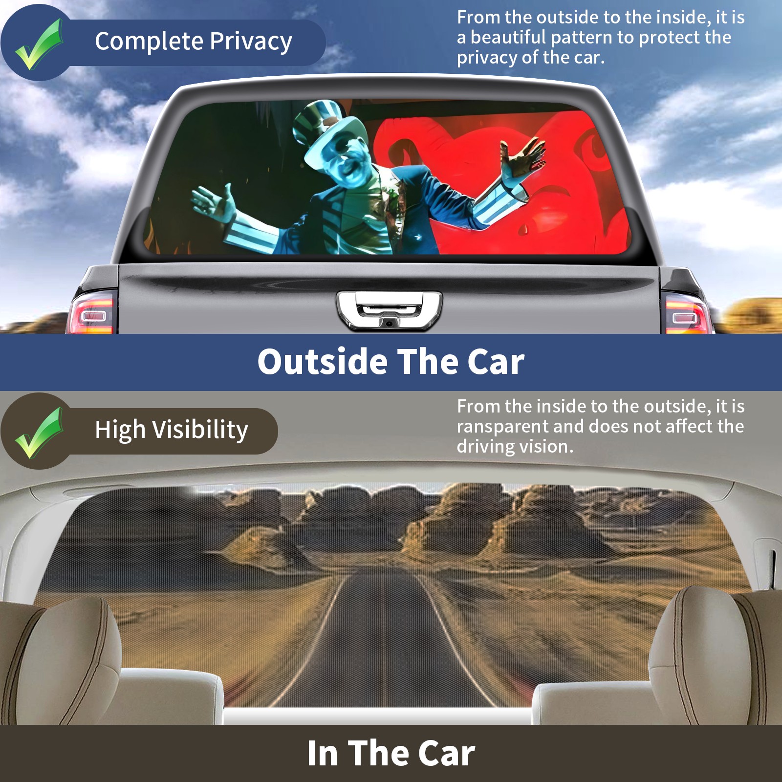 <p><strong>Truck Rear Window Graphics Decals Pickup Trucks Back Window Film Stickers 66" x 22" Perforated Vinyl Wrap Stickers Decorations for Car Rear Window</strong></p><p><strong><br /></strong></p><p><strong>Features :</strong></p><p>- Size of the rear window decals for trucks is 66x22 Inches (168x56cm).</p><p>- High quality perforated vinyl window film, one way vision sticker.</p><p>- Perforated is see through from the inside but not from outside.</p><p>- Clear printing, waterproof and durable.</p><p>- The car back window graphics stickers fits most truck and makes your vehicle more beautiful.&nbsp;</p><p><br /></p><p><strong>【Installation Instructions】</strong></p><p><strong>1. CLEAN SURFACE -</strong> Clean the rear window thoroughly and make sure the surface clean.</p><p><strong>2. STICK THE DECALS -</strong> Tear off the paper on the back and stick the decal on the window.</p><p><strong>3. SCRAPE OFF AIR BUBBLES -</strong> Use a squeegee or other card to scrape off the excess air bubbles.</p><p><strong>4. TRIM THE EXCESS -</strong> Use a knife to cut off the excess stickers of the window, finally complete.</p><p><br /></p><p>1. Please measure the size before purchasing, back window graphics decal for truck can be cut to your desired size.</p><p>2.The graphics stickers for truck back window is a great gift for yourself also can as a birthday / halloween / christmas gift for your friends and family.</p>