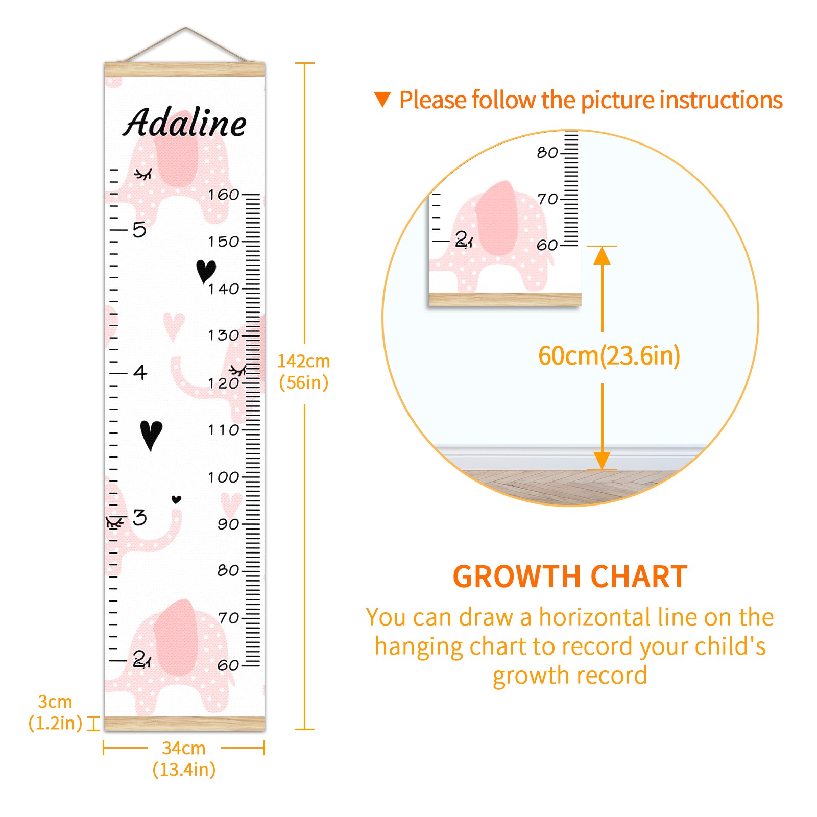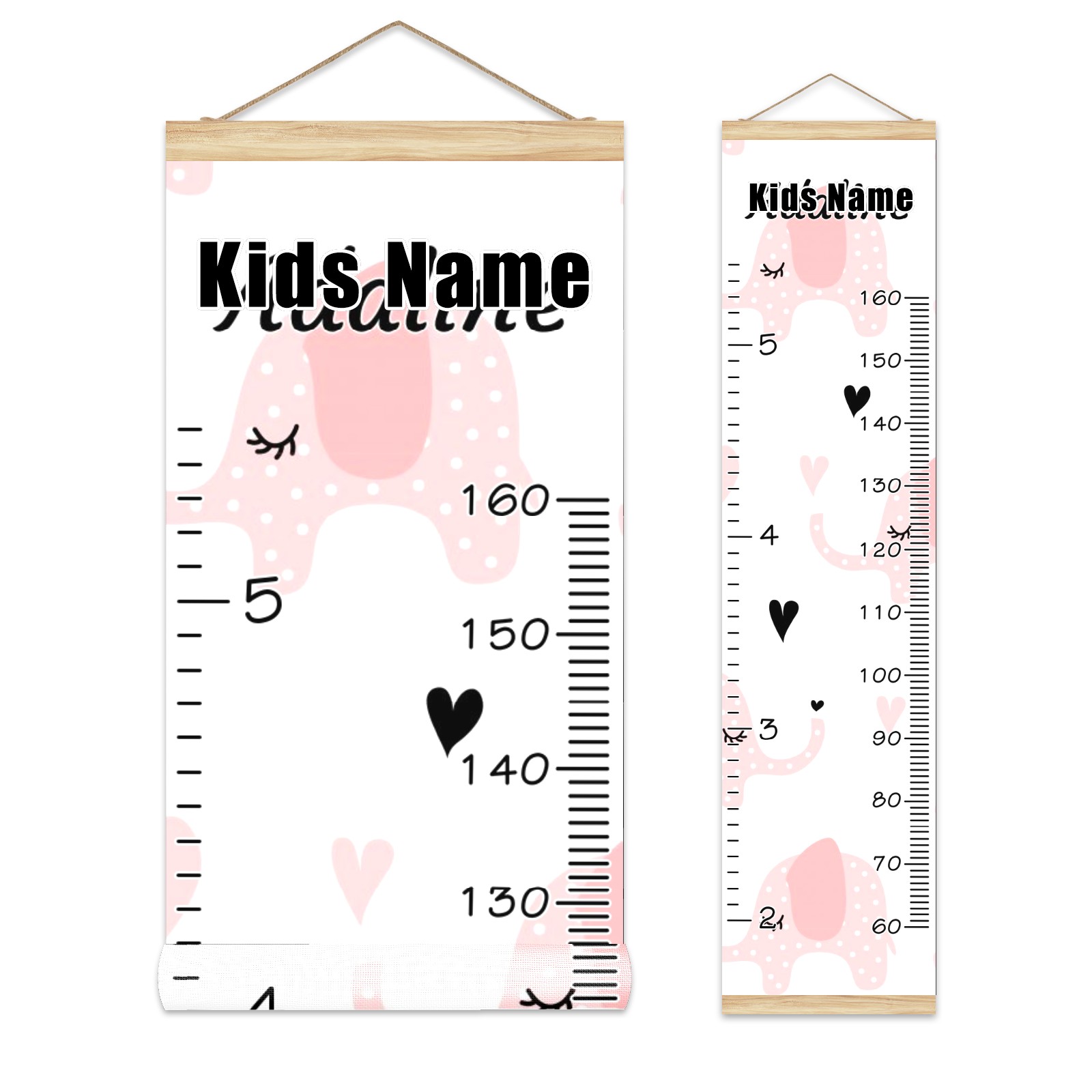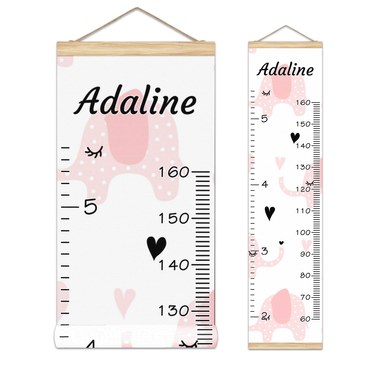 Personalized Kids Name Growth Chart Ruler for Wall Wood Frame Canvas Height Measure Chart 13.4x56 in Hanging Growth Chart Pink Elephant6.3 Boys Girls Room Decor