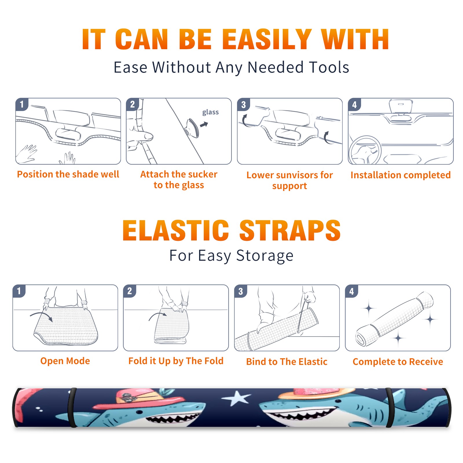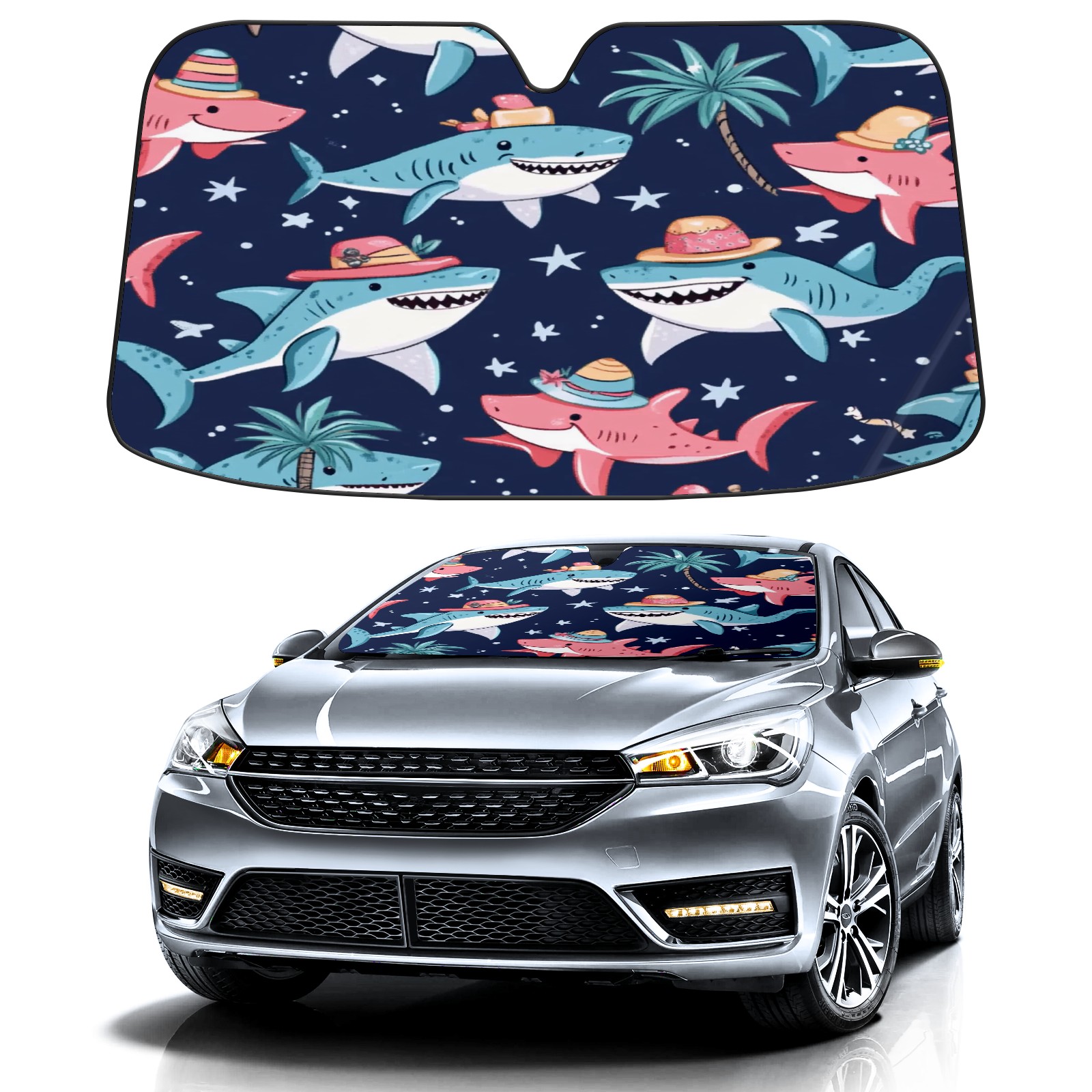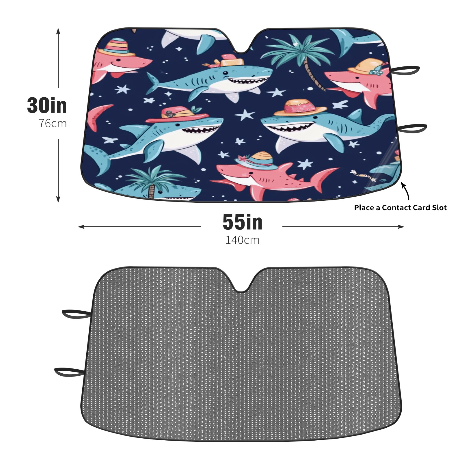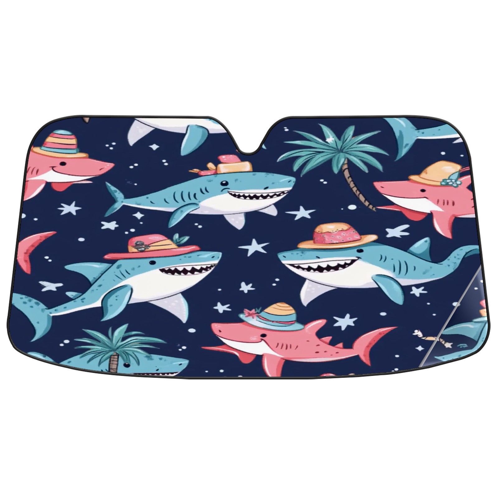 Car Windshield Sun Shade Foldable-Universal Fit Sunshade for Front Windows, UV Protection Heat Shield for Most Vehicles (55x30in)-Sun Visor Extender, Dashboard Cover(Sharks Wearing Hats)