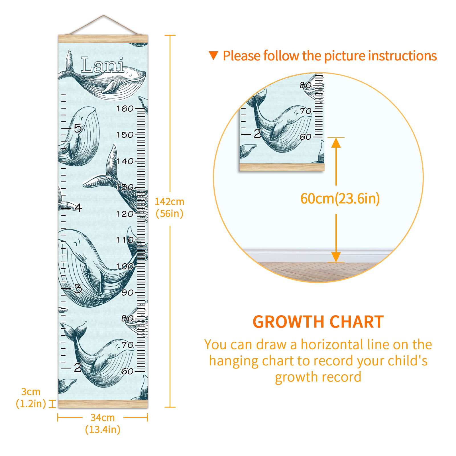 • <p><b>Features:</b></p> <p>Rope for Hanging</p> <p>Material: Linen + Wood</p> <p>Dimensions: 13.4x56 inches</p> <p>Package Included: 1 * Baby Growth Chart</p> <p><b>Baby height growth chart can be used anywhere</b></p> <p>Ideal for kids nursery decoration, kids bedroom, interior walls or windows, playroom, living room, homedecoration.Add name and make the growth chart special!</p> <p><b>Easy to fold and carry</b></p> <p>With rope at the top of the growth chart, it is easy to install and remove.You can fold it and unfold any time any where.</p> <p><b>Perfect Gift Idea for Kids</b></p> <p>Environmental and non-toxic for kids use, it must be a perfect gift for baby, kids, girls, and boys.This is a best choice for your friend who have kids or baby as a popular gift.</p> <p><b>Easy to read</b></p> <p>Measurement accrate with 2 scales, Centimeters and feet. The letters are big enough, very easy to read.</p> <p><b>60cm(23.6inch) Over Ground Design</b></p> <p>Not only can protect from dust and other damage, but also will not interfere in floor cleaning.</p>