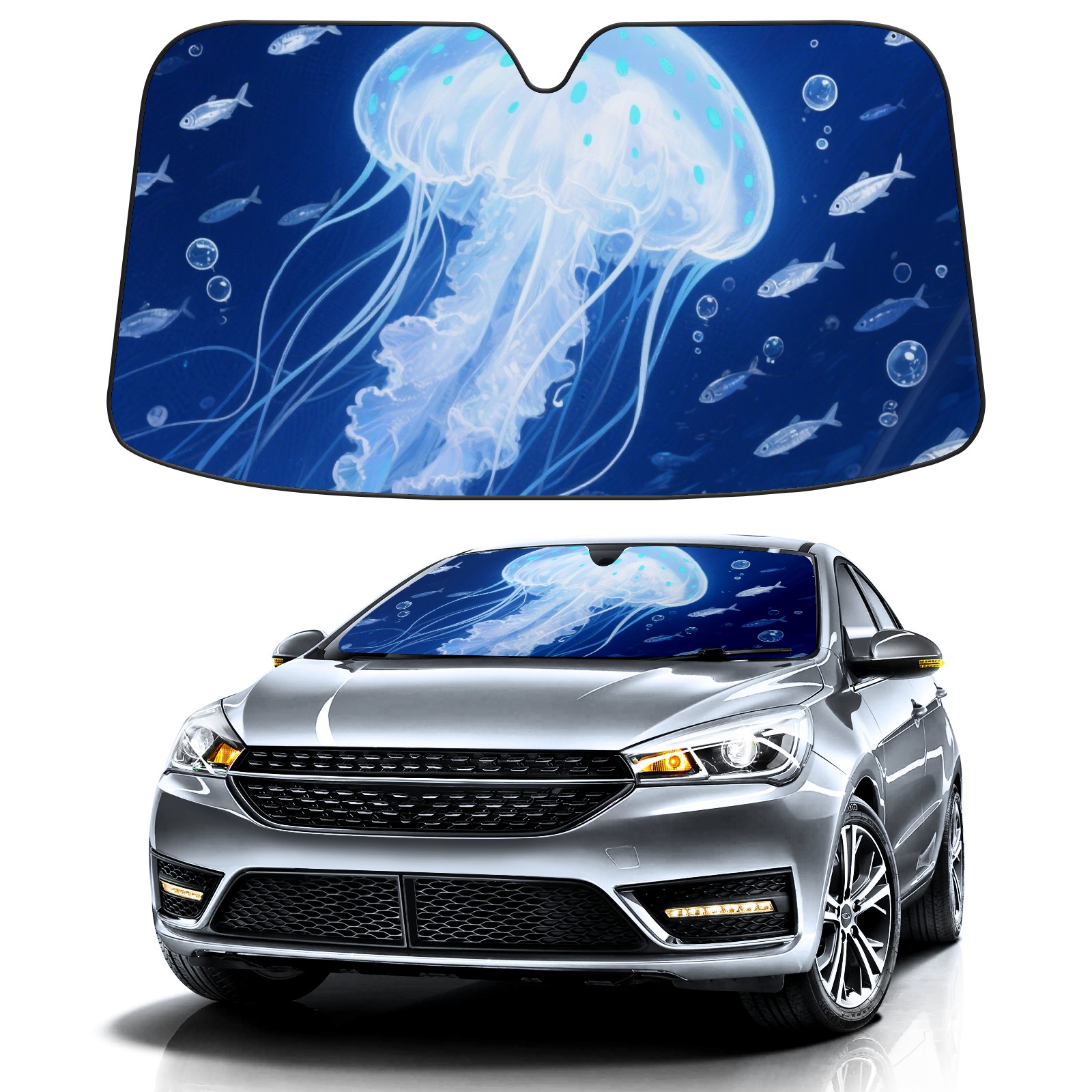 Car Windshield Sun Shade Polyester Car Sunshade Pad, Heat Insulation And Sun Protection Blue Jellyfish
