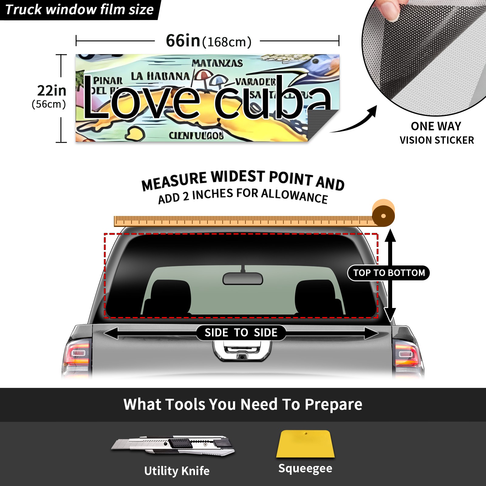 <p><strong>Truck Rear Window Graphics Decals Pickup Trucks Back Window Film Stickers 66" x 22" Perforated Vinyl Wrap Stickers Decorations for Car Rear Window</strong></p><p><strong><br /></strong></p><p><strong>Features :</strong></p><p>- Size of the rear window decals for trucks is 66x22 Inches (168x56cm).</p><p>- High quality perforated vinyl window film, one way vision sticker.</p><p>- Perforated is see through from the inside but not from outside.</p><p>- Clear printing, waterproof and durable.</p><p>- The car back window graphics stickers fits most truck and makes your vehicle more beautiful.&nbsp;</p><p><br /></p><p><strong>【Installation Instructions】</strong></p><p><strong>1. CLEAN SURFACE -</strong> Clean the rear window thoroughly and make sure the surface clean.</p><p><strong>2. STICK THE DECALS -</strong> Tear off the paper on the back and stick the decal on the window.</p><p><strong>3. SCRAPE OFF AIR BUBBLES -</strong> Use a squeegee or other card to scrape off the excess air bubbles.</p><p><strong>4. TRIM THE EXCESS -</strong> Use a knife to cut off the excess stickers of the window, finally complete.</p><p><br /></p><p>1. Please measure the size before purchasing, back window graphics decal for truck can be cut to your desired size.</p><p>2.The graphics stickers for truck back window is a great gift for yourself also can as a birthday / halloween / christmas gift for your friends and family.</p>