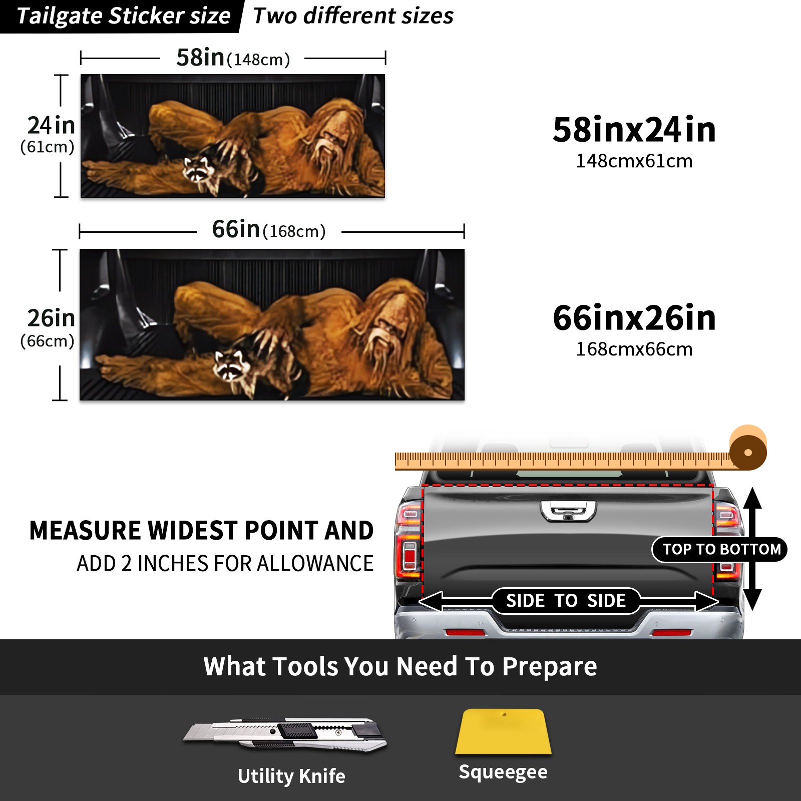 <p>[Design description] Single side printing with gum</p> <p>168x66cm/66x26in</p> <p>[Material description] PET material</p> <p>[Pickup door paste product performance] simple installation, waterproof and durable.</p> <p>Pickup back door post installation method ¡¿ ¡¾ before use, please measure the size of the back door of the pickup truck, less than or equal to the product size is most suitable for, first back to clean and wipe clean, stick to tear apart the plastic door, door stickers around the back door, using scraper scrape excess air bubbles, the back door handles stickers along the edge cutting off, completion.</p> <p>[Applicable models] All kinds of pickup trucks</p>