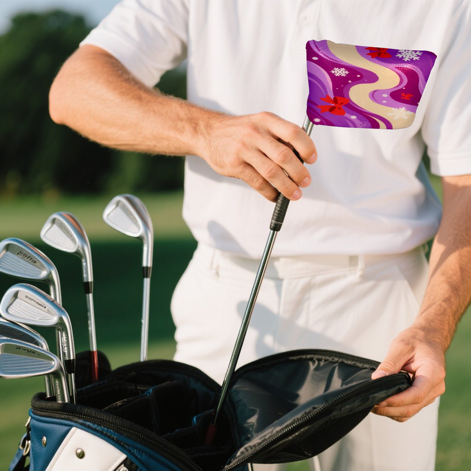 • <p>This golf club cover, made of high quality PU leather, combines durability with water and stain resistance to easily cope with complex outdoor environments. The soft velvet lining on the inside of the cover fits the clubs snugly, cushioning them from impact and preventing scratches and abrasions in every way. It's easy to clean, and can be gently scrubbed to keep your clubs in good condition. 13x14cm is the perfect size for all types of clubs, and it's stable and won't wobble. Whether for personal use or as a gift, the thoughtful and practical design makes it an ideal gift for golf enthusiasts on birthdays and festivals, adding a unique style to the bag.</p>