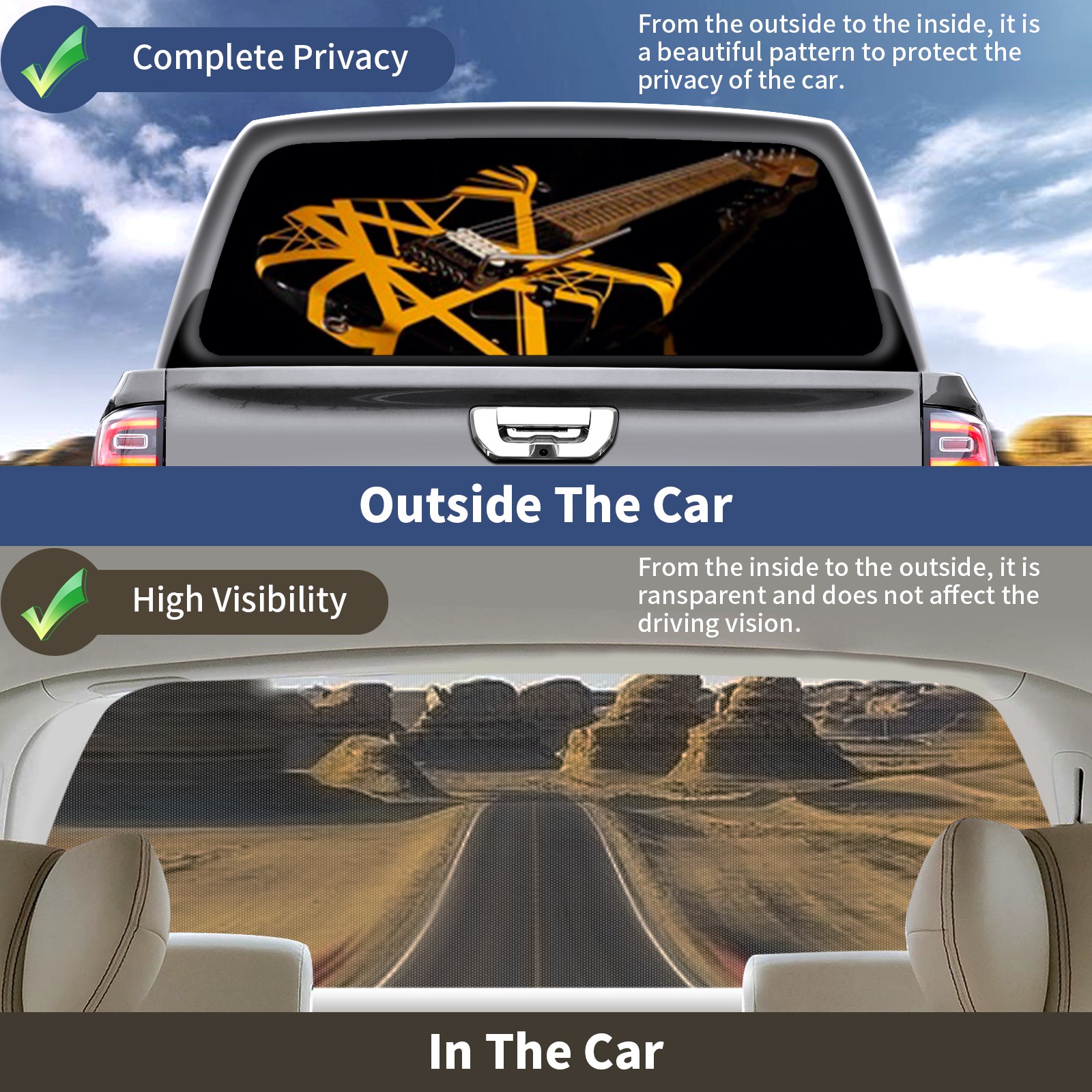 <p><strong>Truck Rear Window Graphics Decals Pickup Trucks Back Window Film Stickers 66" x 22" Perforated Vinyl Wrap Stickers Decorations for Car Rear Window</strong></p><p><strong><br /></strong></p><p><strong>Features :</strong></p><p>- Size of the rear window decals for trucks is 66x22 Inches (168x56cm).</p><p>- High quality perforated vinyl window film, one way vision sticker.</p><p>- Perforated is see through from the inside but not from outside.</p><p>- Clear printing, waterproof and durable.</p><p>- The car back window graphics stickers fits most truck and makes your vehicle more beautiful. </p><p><br /></p><p><strong>【Installation Instructions】</strong></p><p><strong>1. CLEAN SURFACE -</strong> Clean the rear window thoroughly and make sure the surface clean.</p><p><strong>2. STICK THE DECALS -</strong> Tear off the paper on the back and stick the decal on the window.</p><p><strong>3. SCRAPE OFF AIR BUBBLES -</strong> Use a squeegee or other card to scrape off the excess air bubbles.</p><p><strong>4. TRIM THE EXCESS -</strong> Use a knife to cut off the excess stickers of the window, finally complete.</p><p><br /></p><p>1. Please measure the size before purchasing, back window graphics decal for truck can be cut to your desired size.</p><p>2.The graphics stickers for truck back window is a great gift for yourself also can as a birthday / halloween / christmas gift for your friends and family.</p>